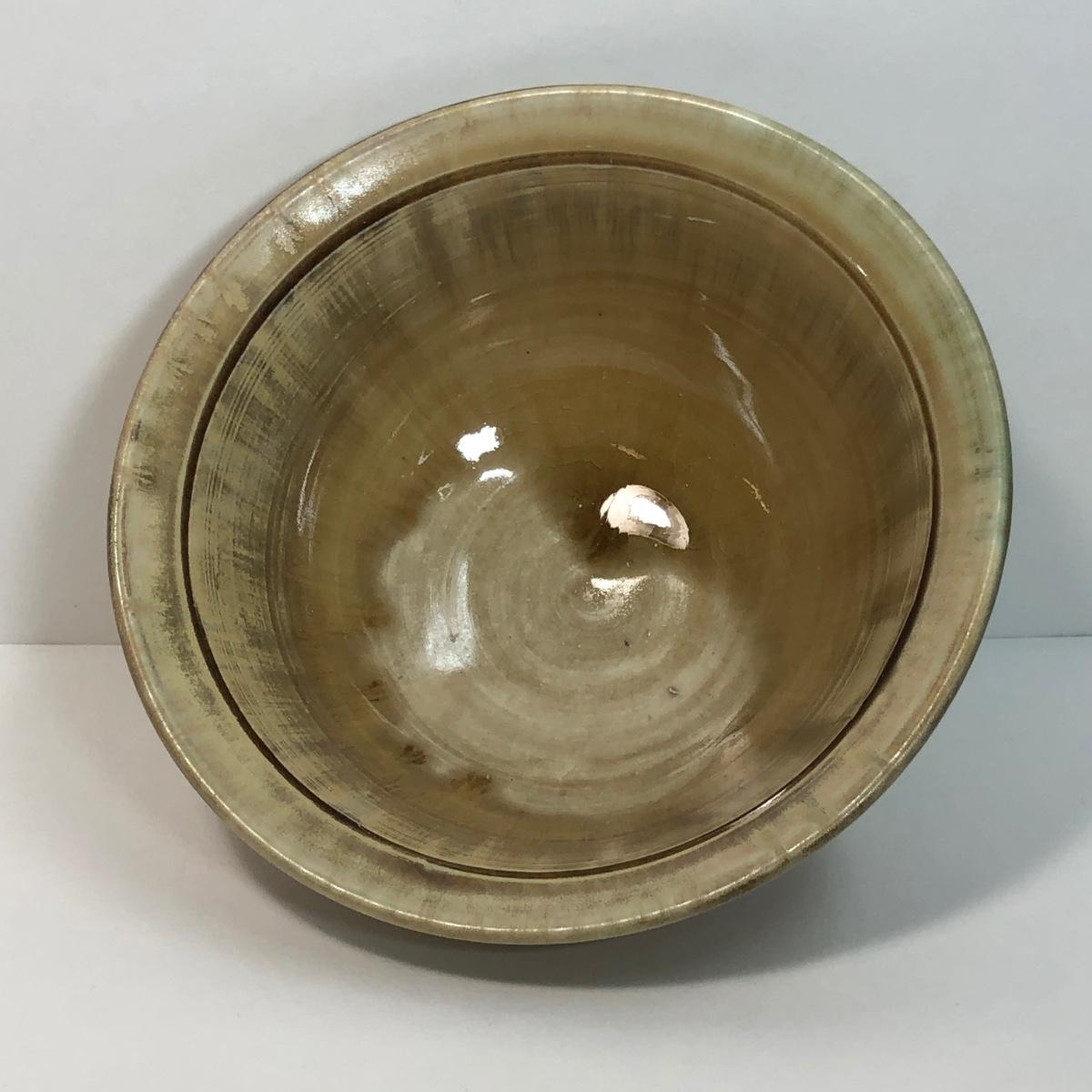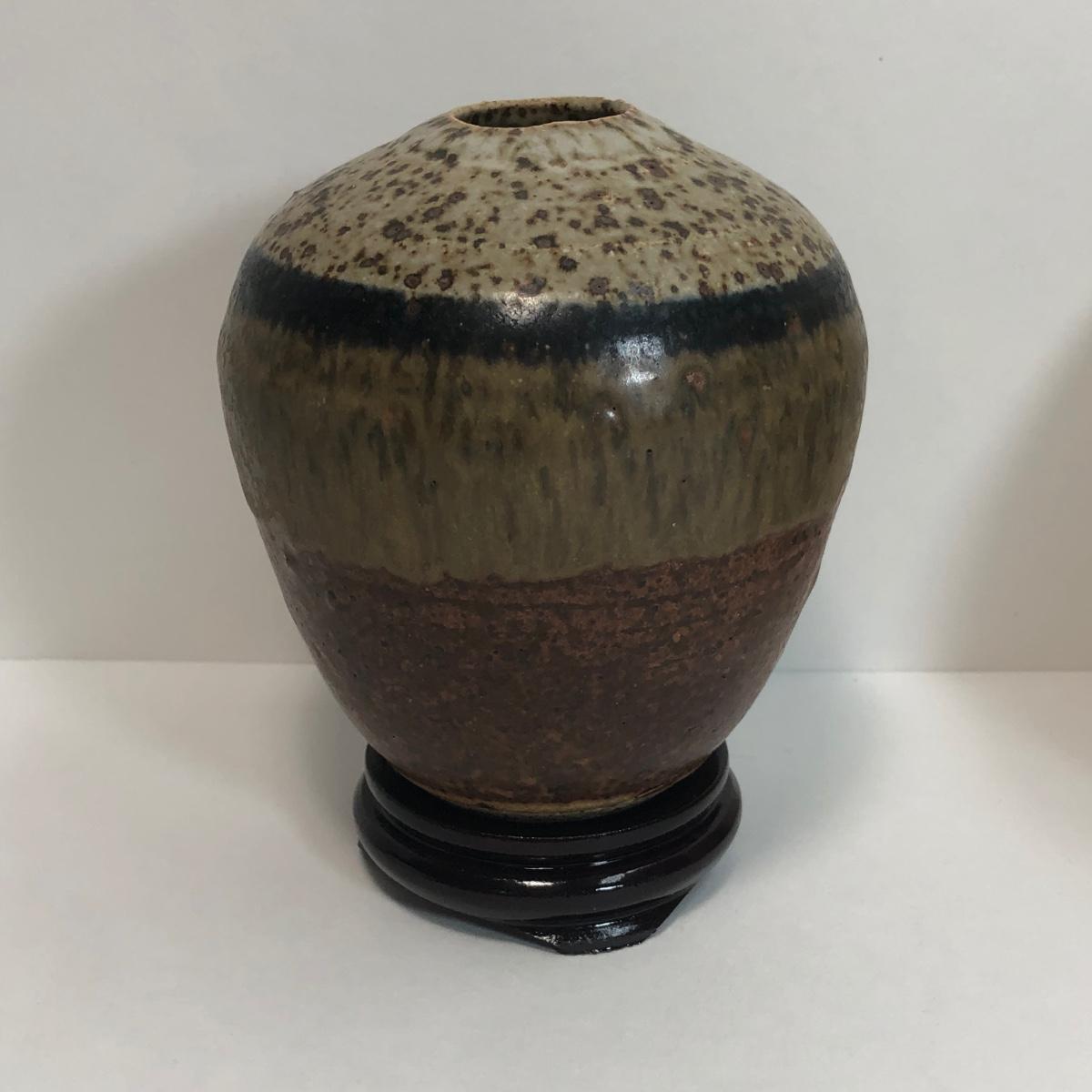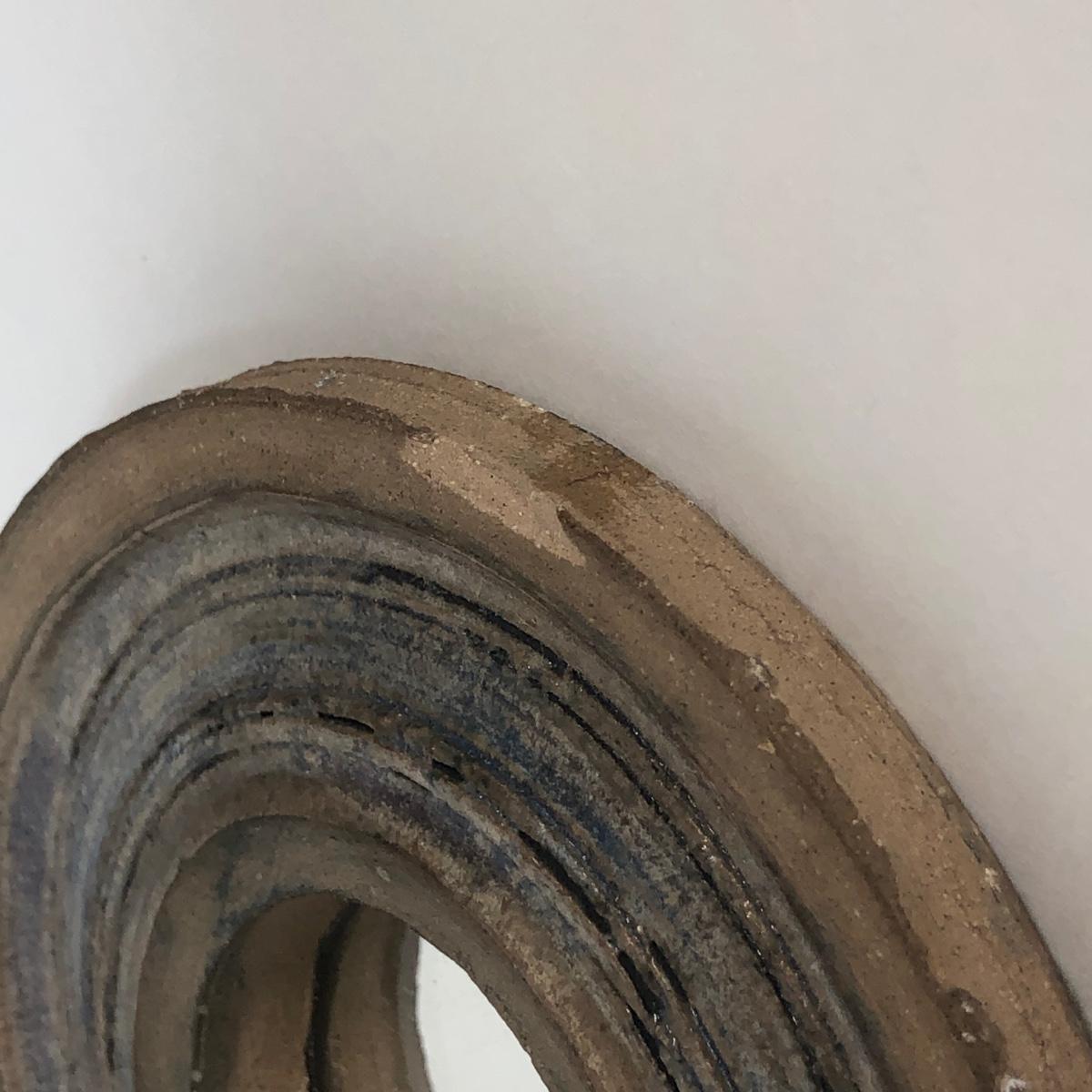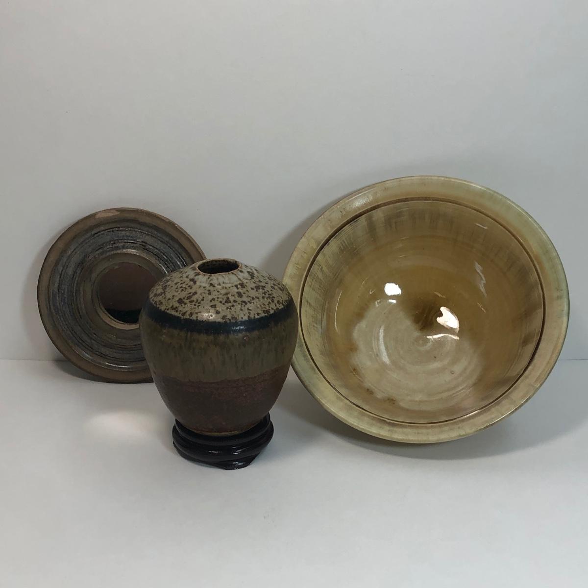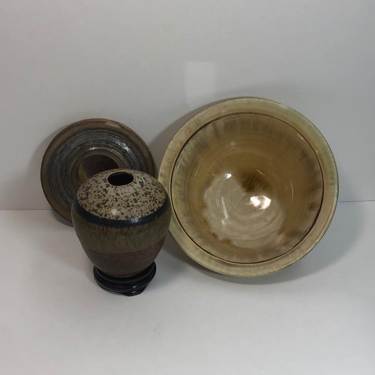 LOT 4: Signed Glazed Striated Earth Tone Pottery w/ Wooden Stand, Signed Hand-Thrown Cream Bowl & Pottery Mirror