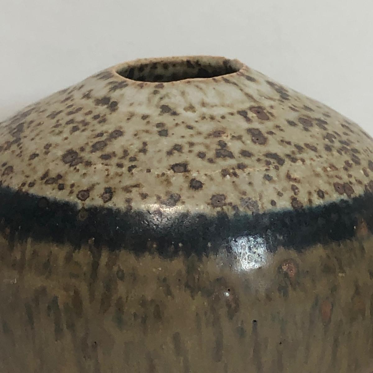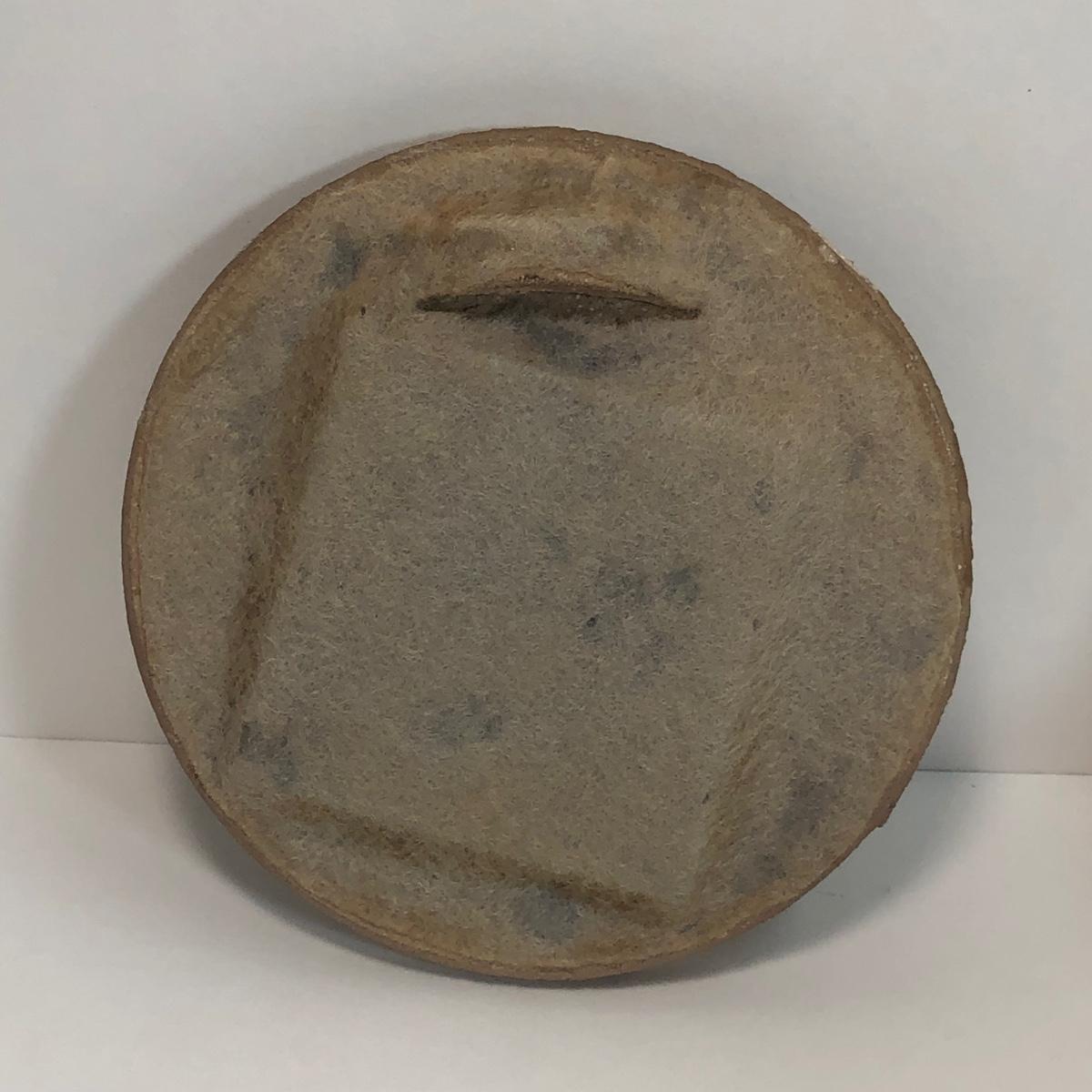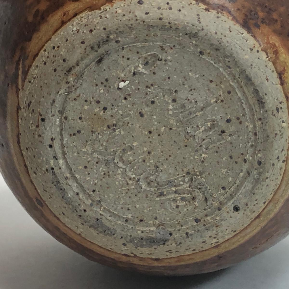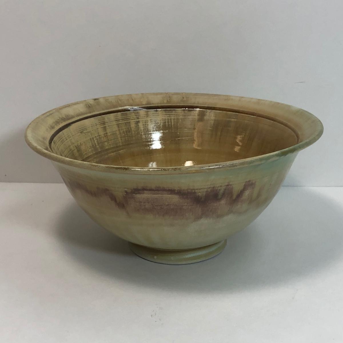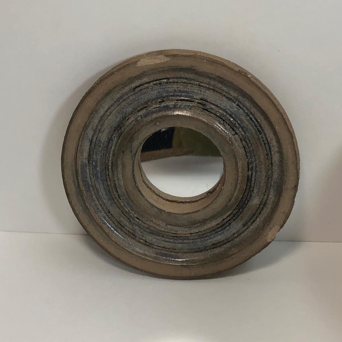 LOT 4: Signed Glazed Striated Earth Tone Pottery w/ Wooden Stand, Signed Hand-Thrown Cream Bowl & Pottery Mirror