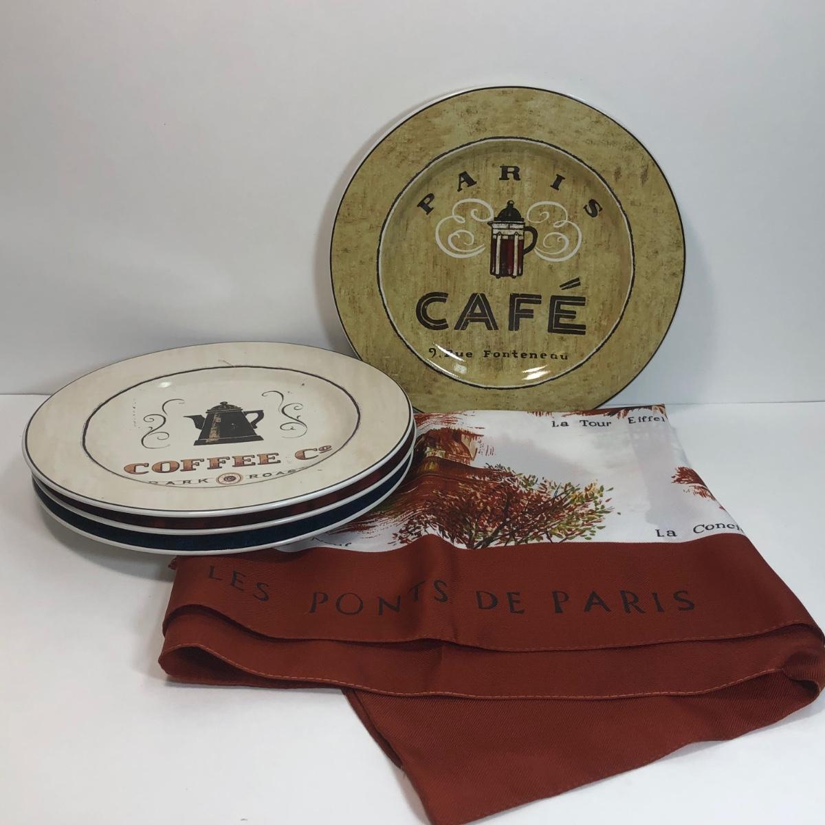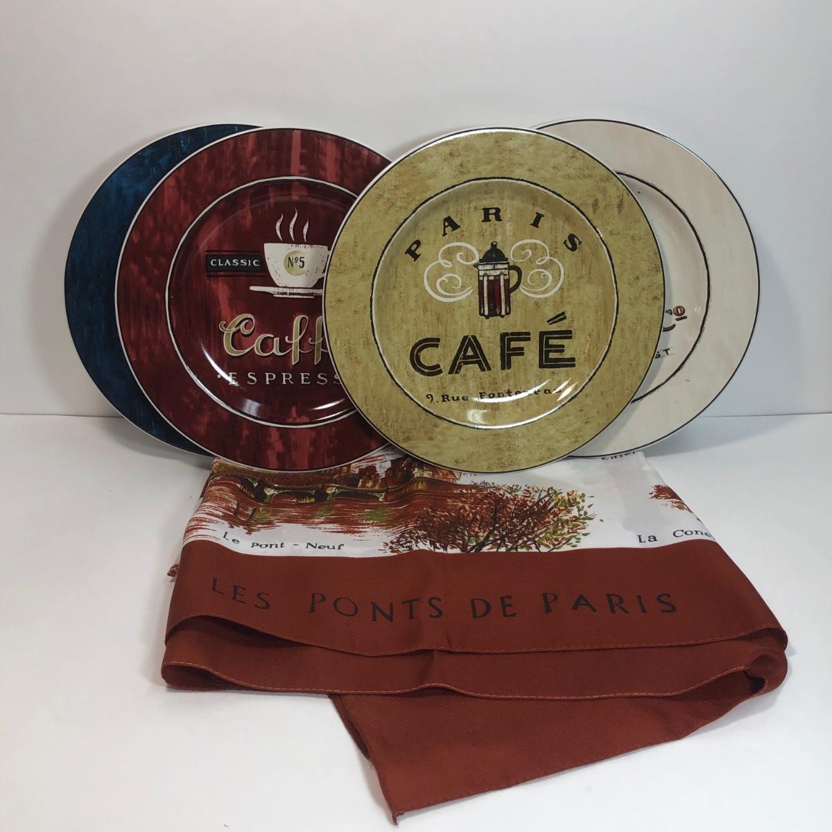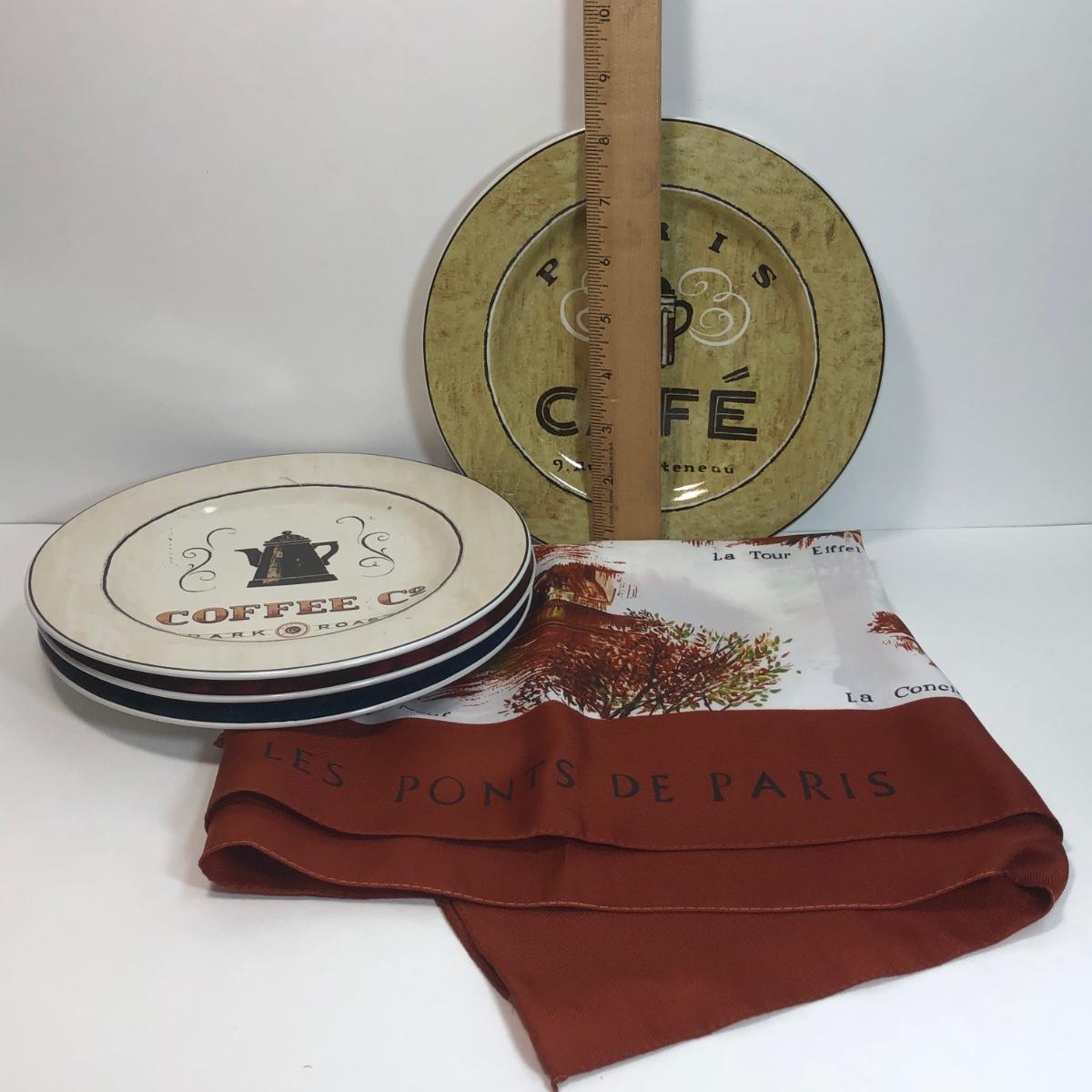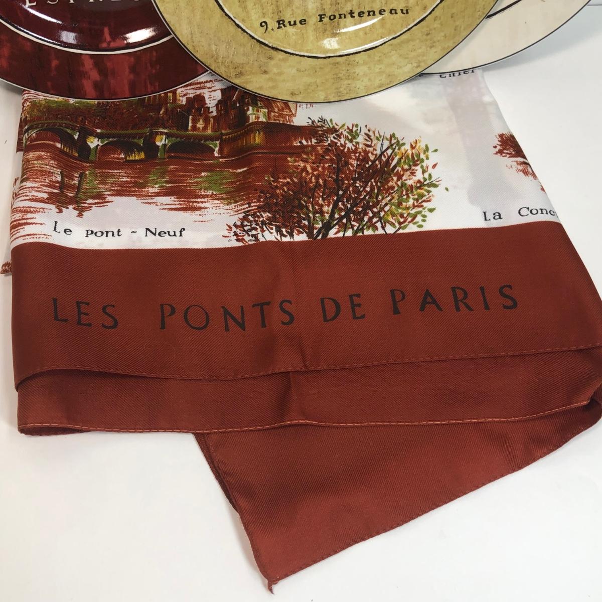 LOT 20: Vintage Scarf Les Ponts de Paris 30" x 30" & Sakura Coffee Break Set of 4 Stoneware Dessert Plates