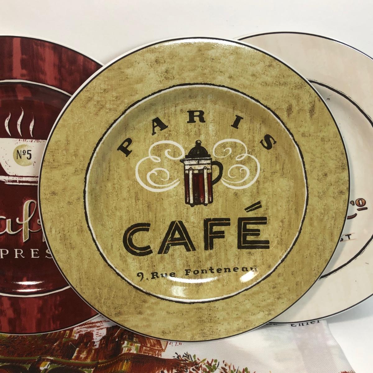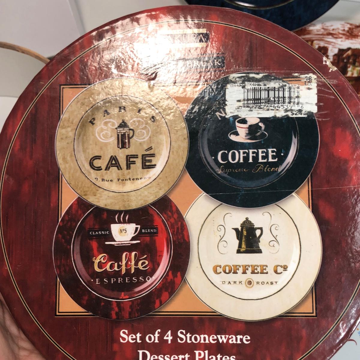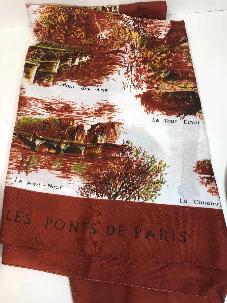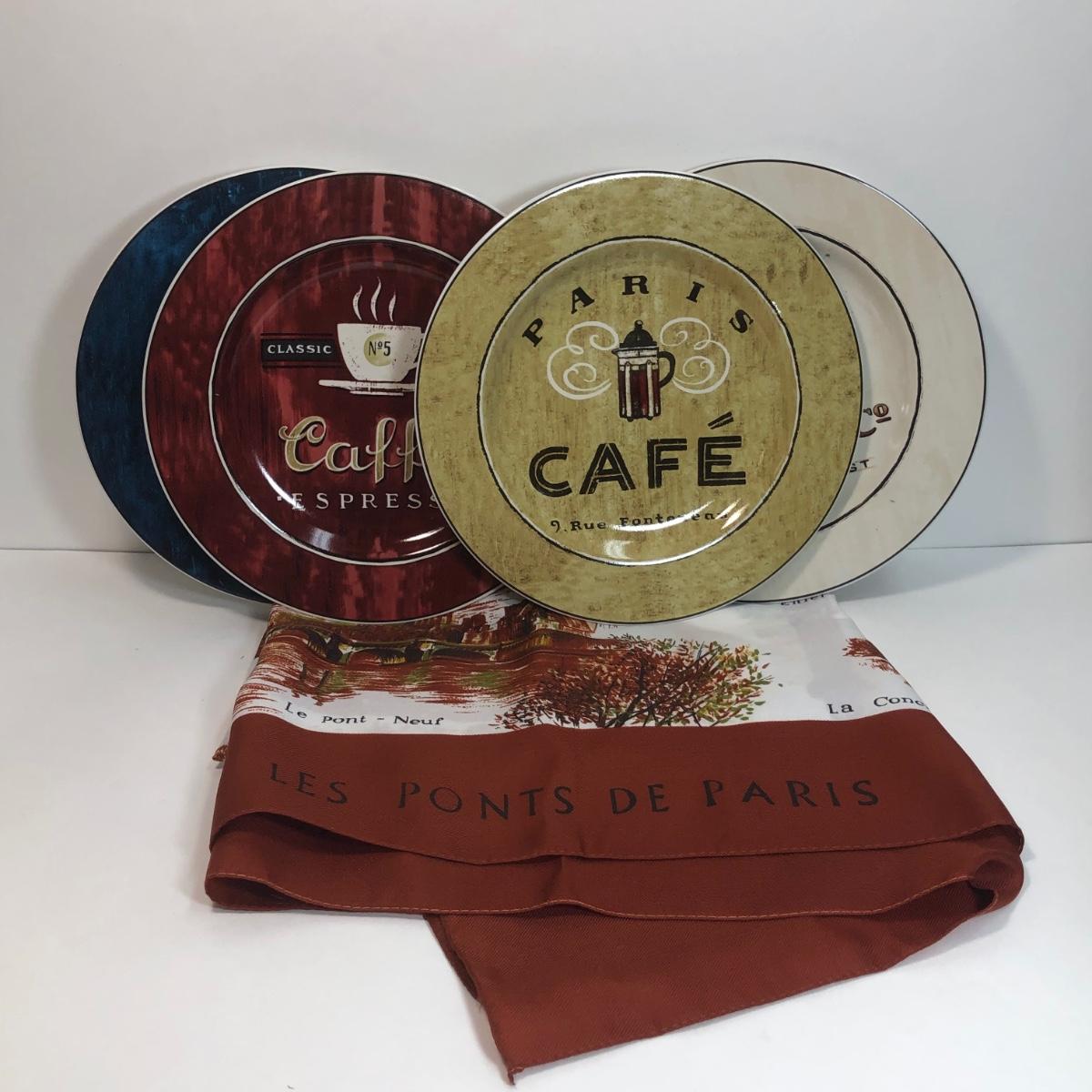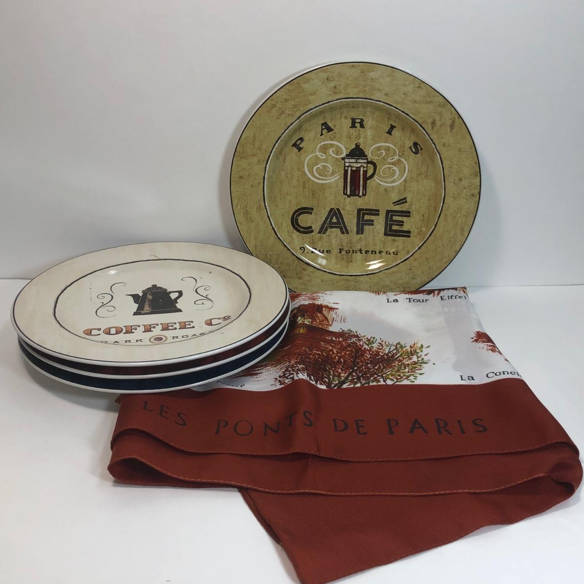 LOT 20: Vintage Scarf Les Ponts de Paris 30" x 30" & Sakura Coffee Break Set of 4 Stoneware Dessert Plates