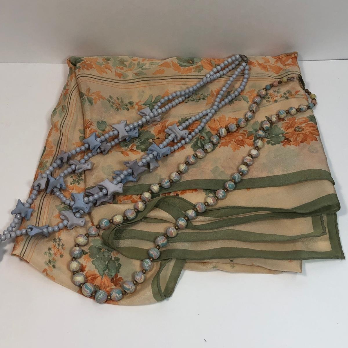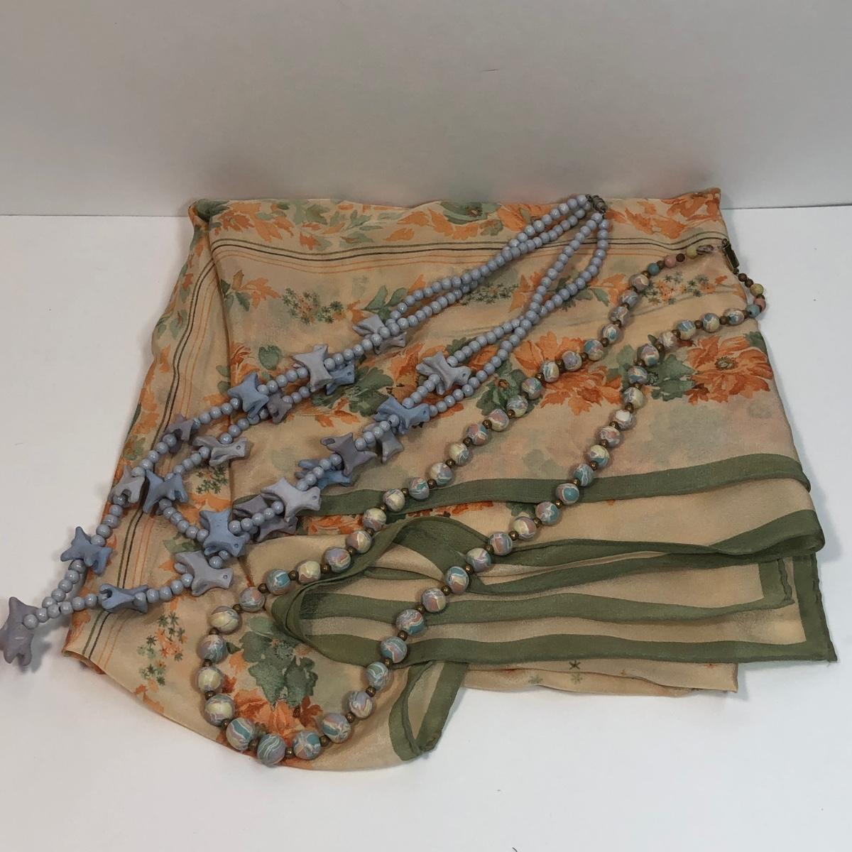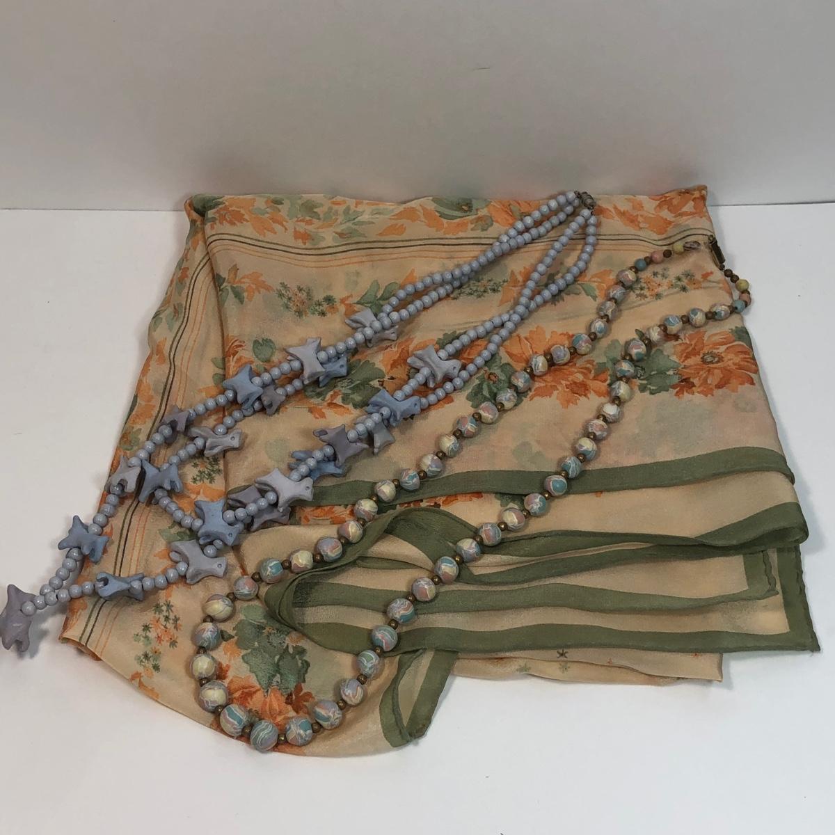 LOT 33: Barbara Hohol Blue Clay 24" Necklace, Clay Dog 24" Necklace & Floral Scarf
