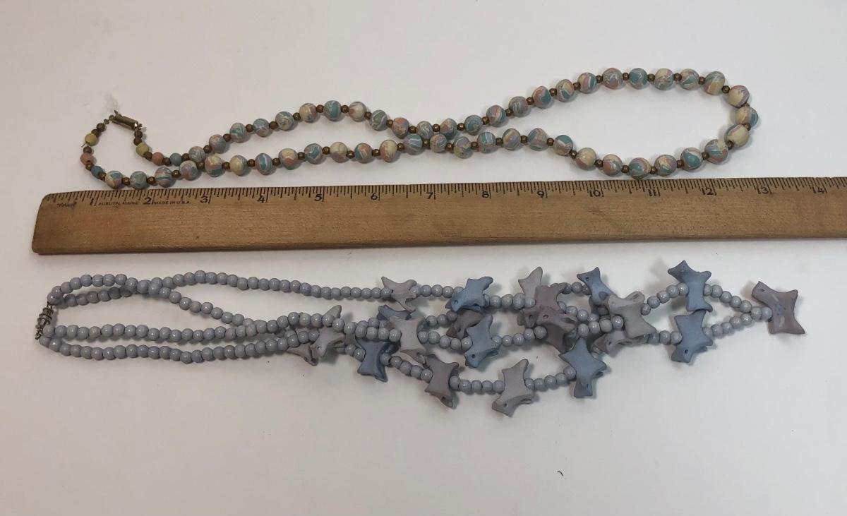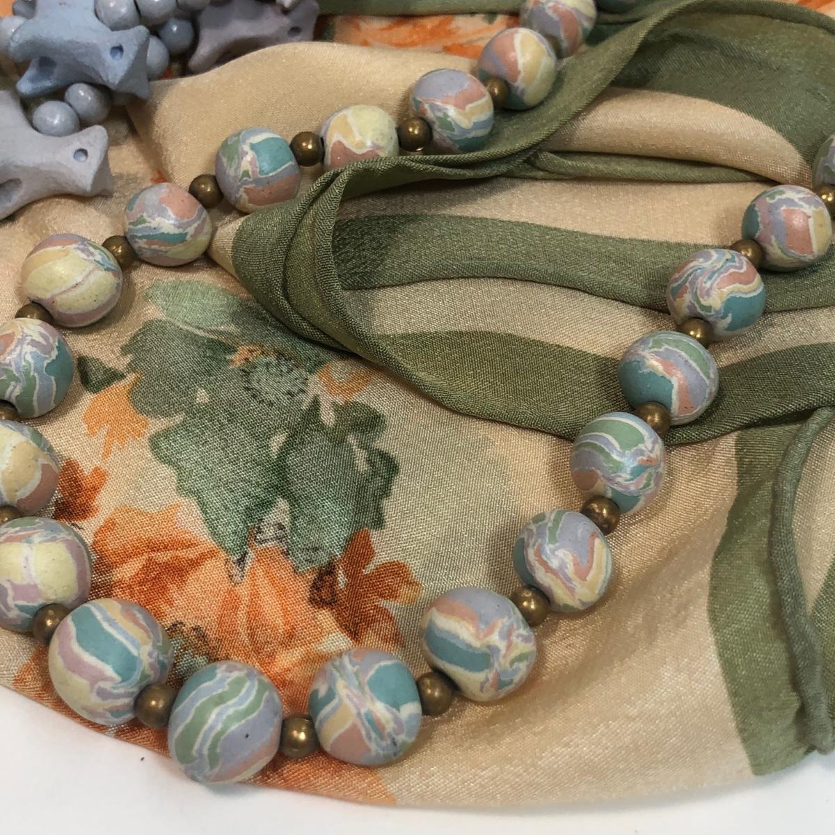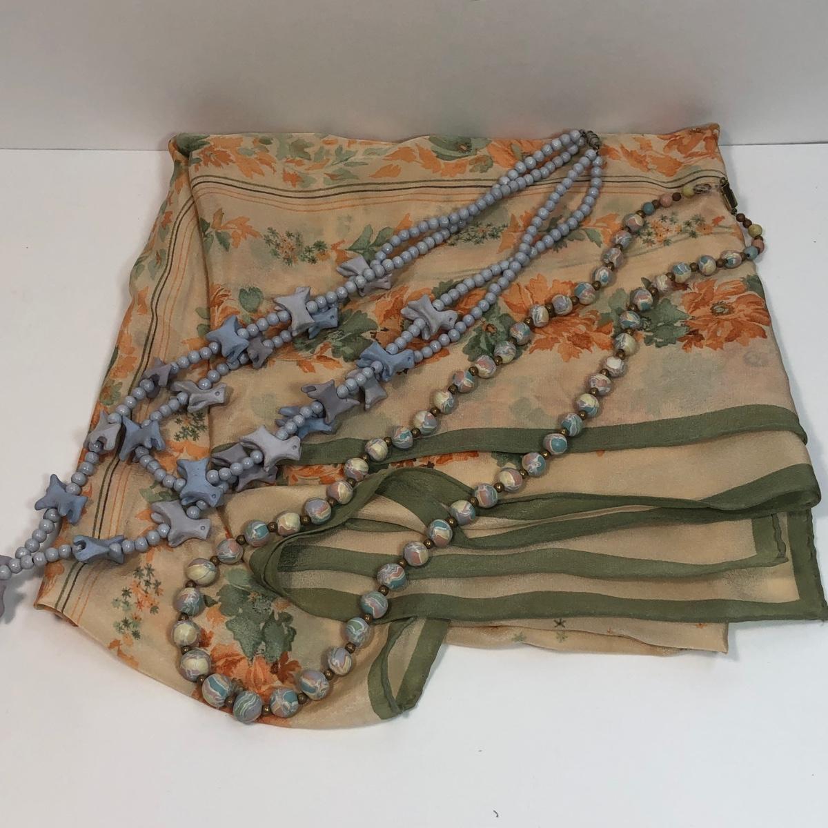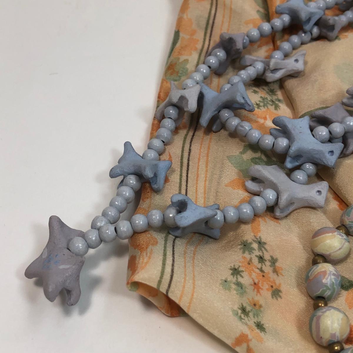 LOT 33: Barbara Hohol Blue Clay 24" Necklace, Clay Dog 24" Necklace & Floral Scarf