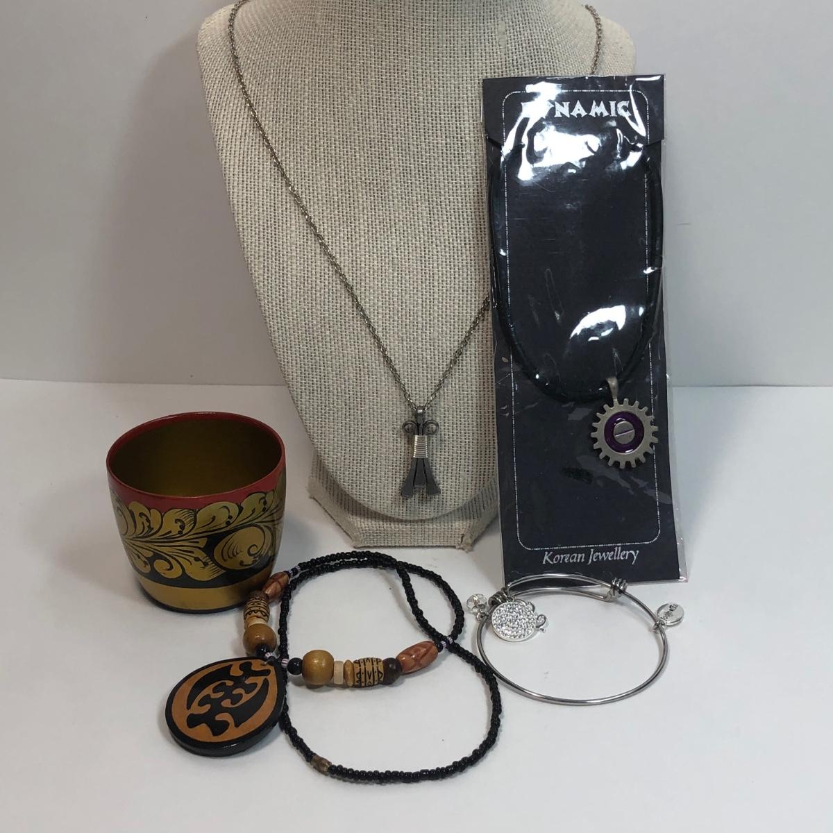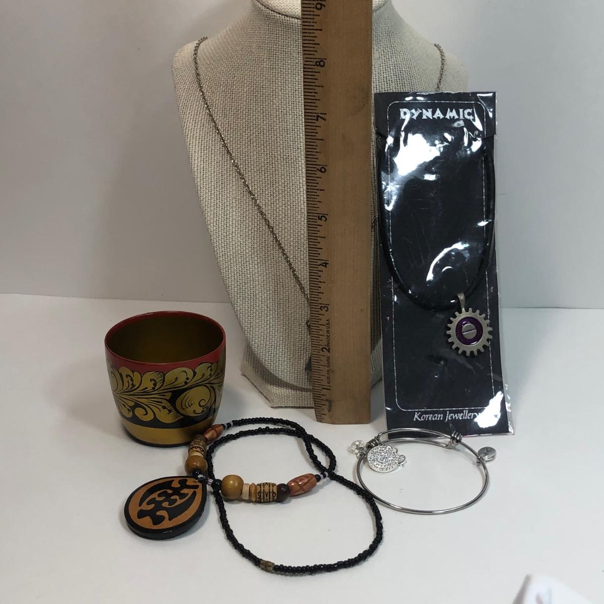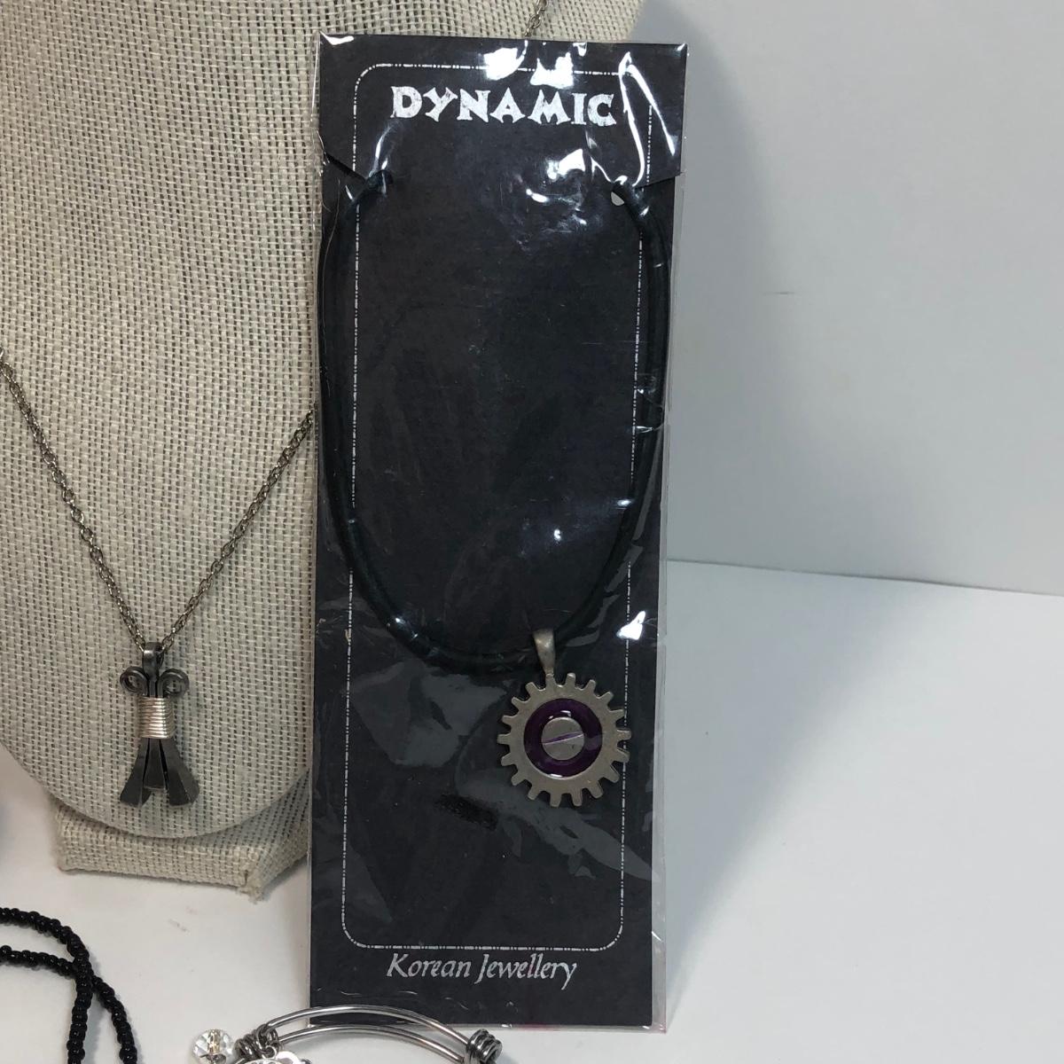 LOT 34: Jewelry Collection - Footnote Love Charm Bracelet, 24" Horseshoe Nail Necklace, Dynamic Korean Jewelry Gear Necklace & More