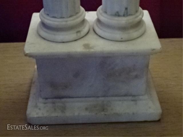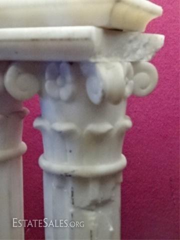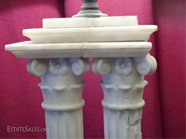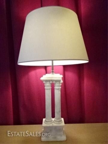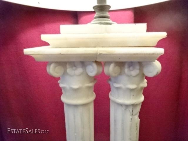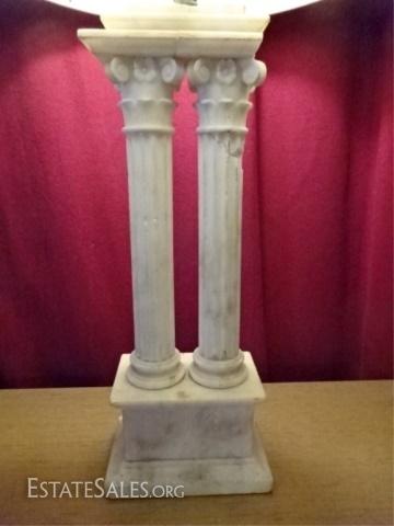 LOT 88D: MARBLE IONIC COLUMN TABLE LAMP, 2 WHITE MARBLE COLUMNS ON RECTANGULAR BASE, VERY GOOD VINTAGE CONDITION WITH SOME CHIPS TO MARBLE SEE PHOTO (DIFFICULT TO TELL IF THESE ARE INTENTIONAL), 34"H, 355.68