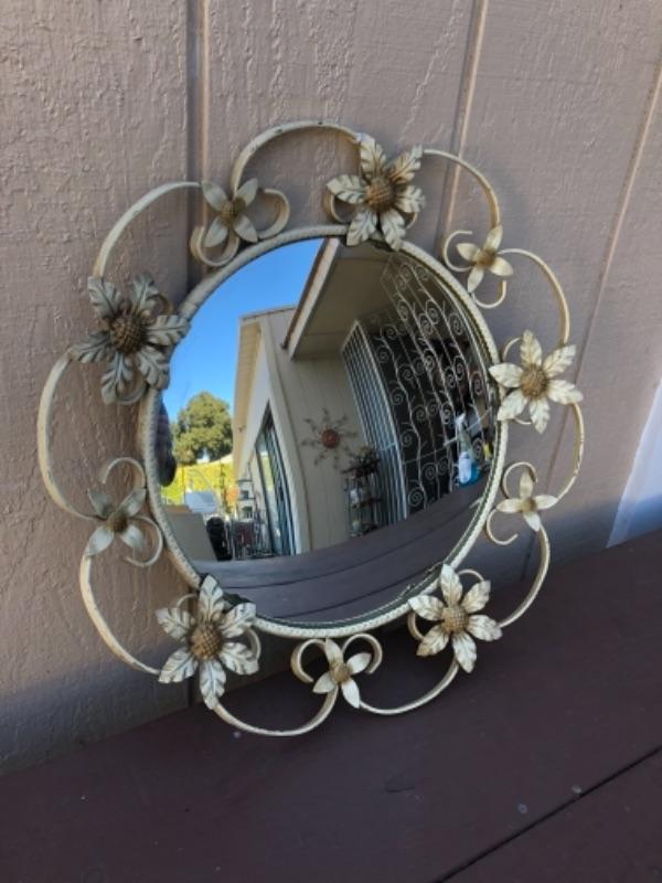 Lot 88DM. Vintage Midcentury Convex Wall Mirror with wrought iron flower frame, 17”Diameter x 2” Deep, 1950-60’s, made in USA “” $48.75