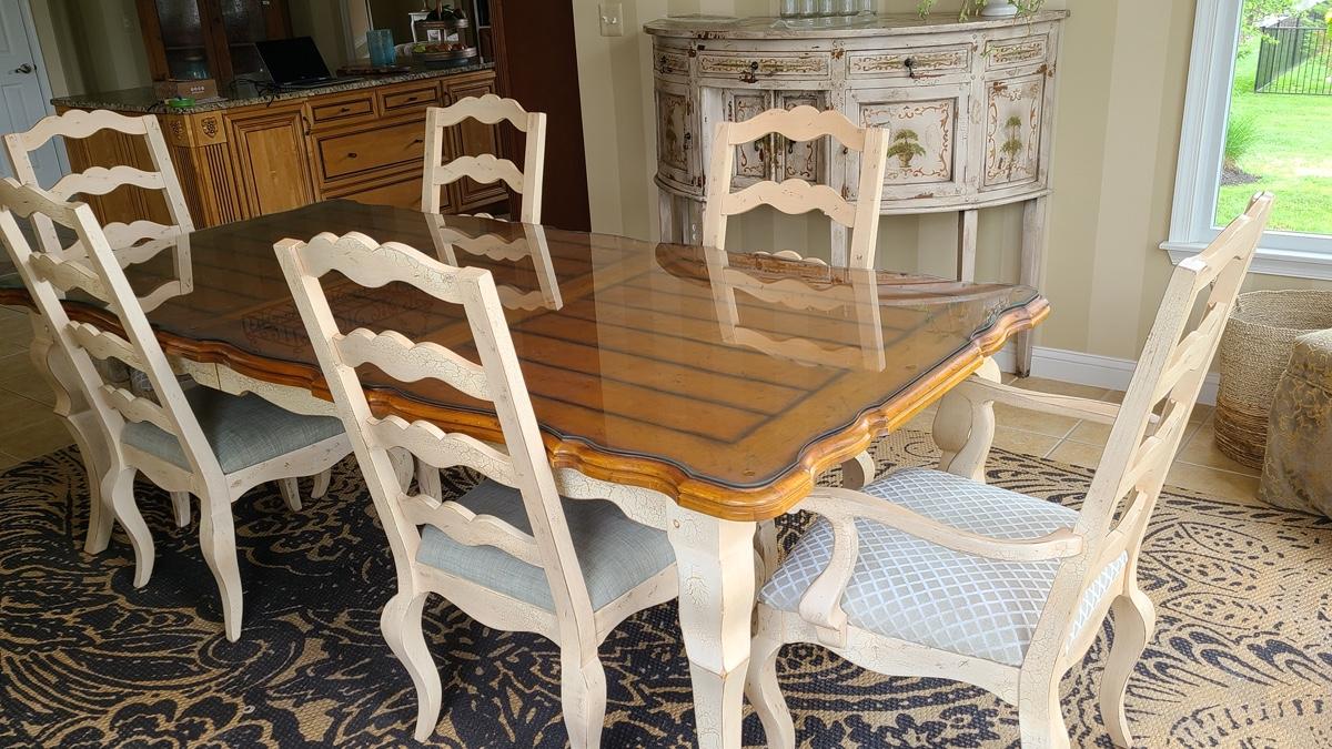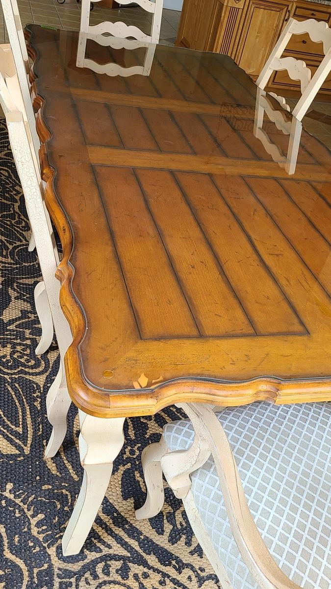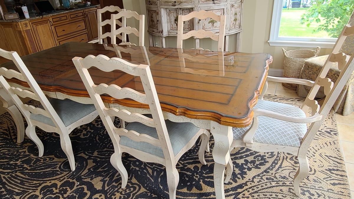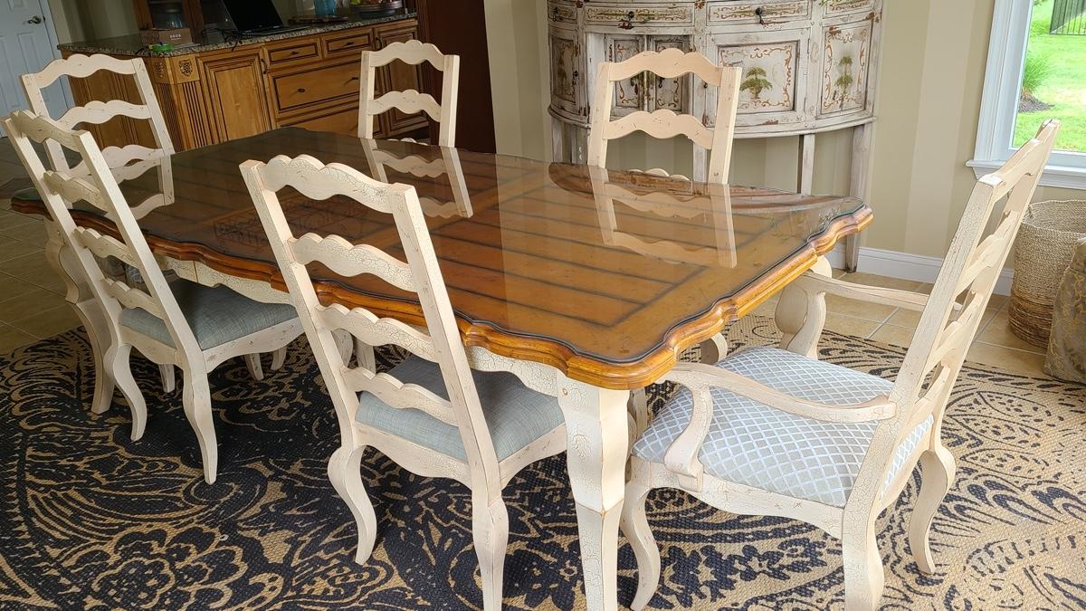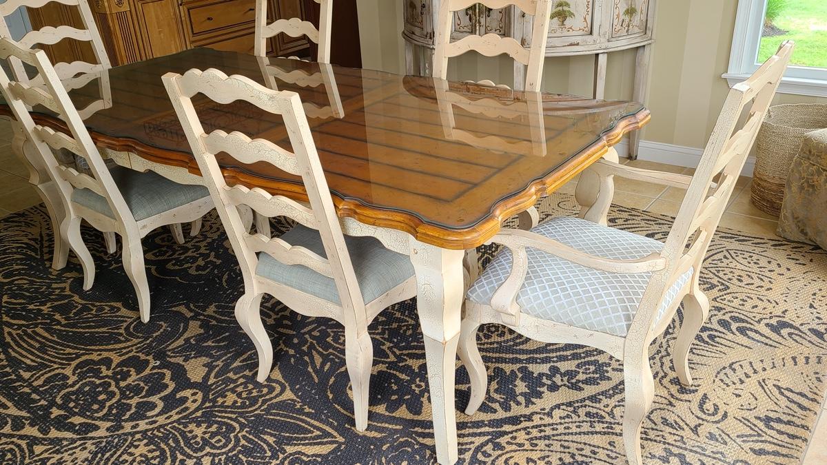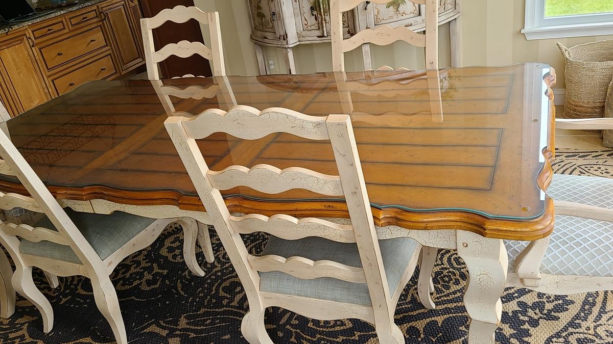 This table is gorgeous in person with a Farmhouse or Shabby Chic design, this would look amazing in a beach house as well! Clients paid a lot for this table and it is worth it, the construction is solid, glass top to protect, the upholstered chairs look new with a neutral desired pattern that can match any decor! This is a steal at this starting price point! 92x44x31 and does have an additional leaf. Please see all pictures for content of the lot, condition of the lot, and measurements if taken. Pictures are the best representation of the items listed and items are untested unless indicated in description. Thank you for looking and have fun bidding!