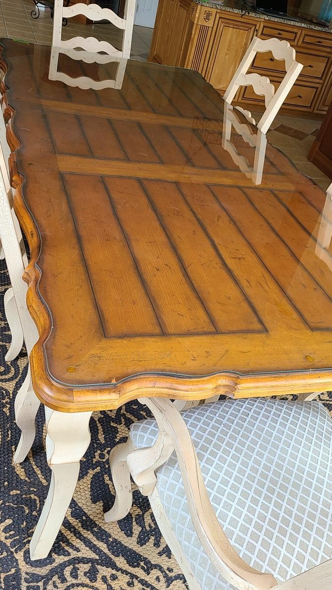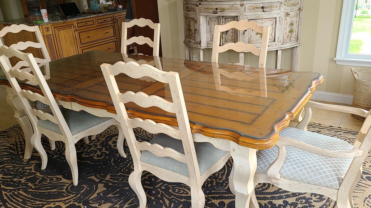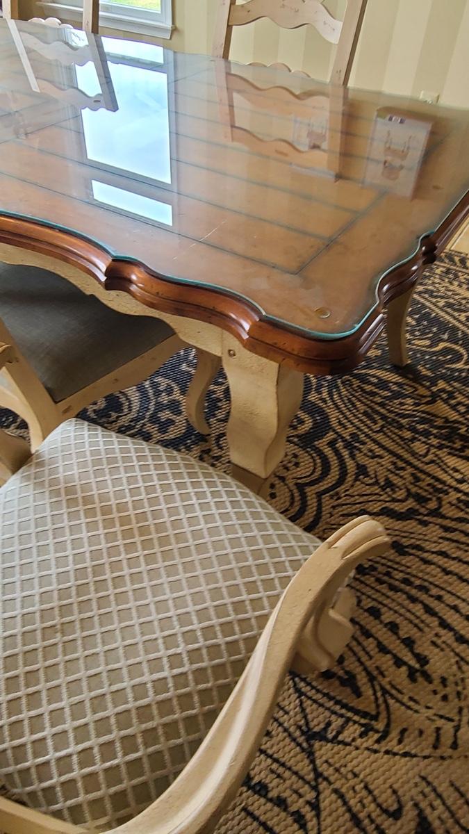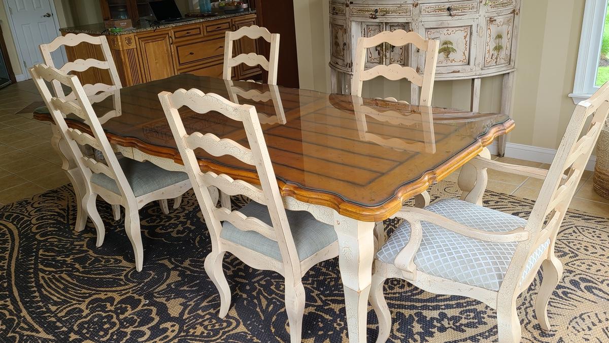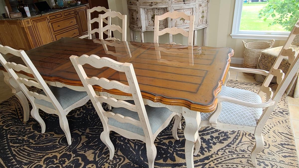 This table is gorgeous in person with a Farmhouse or Shabby Chic design, this would look amazing in a beach house as well! Clients paid a lot for this table and it is worth it, the construction is solid, glass top to protect, the upholstered chairs look new with a neutral desired pattern that can match any decor! This is a steal at this starting price point! 92x44x31 and does have an additional leaf. Please see all pictures for content of the lot, condition of the lot, and measurements if taken. Pictures are the best representation of the items listed and items are untested unless indicated in description. Thank you for looking and have fun bidding!