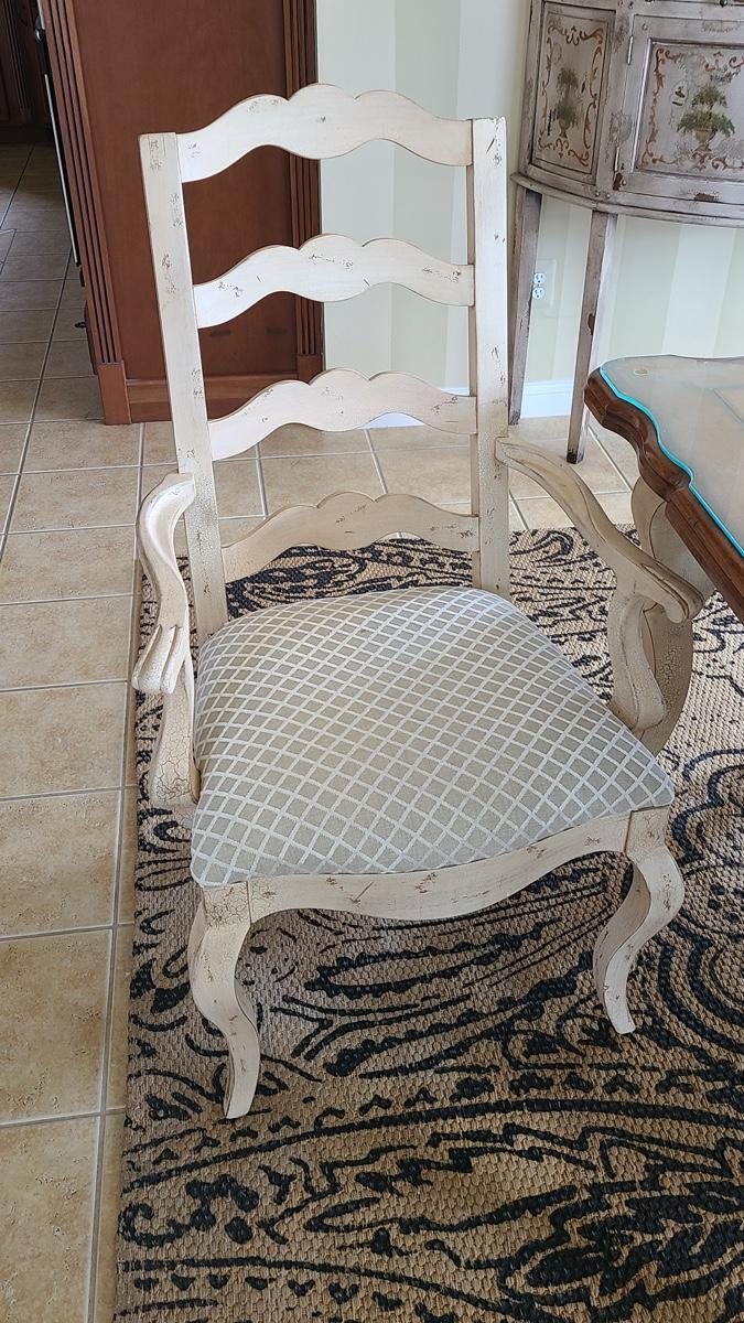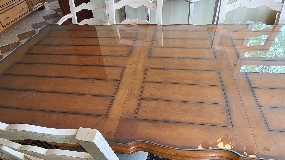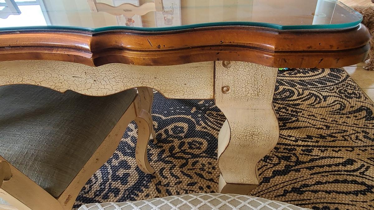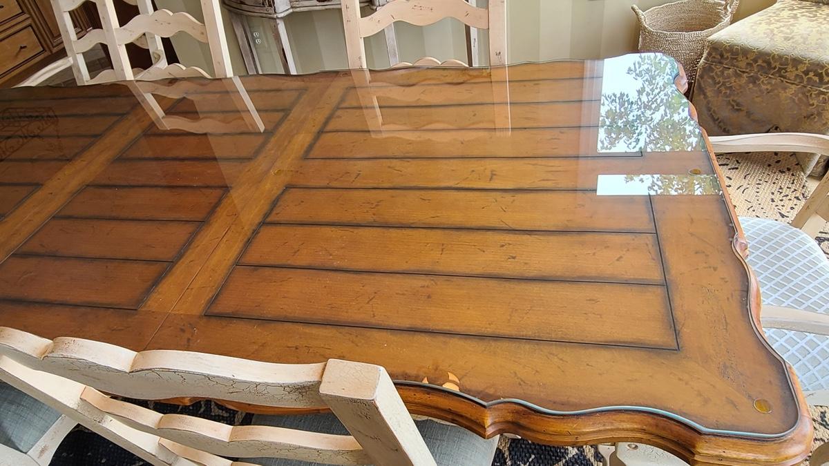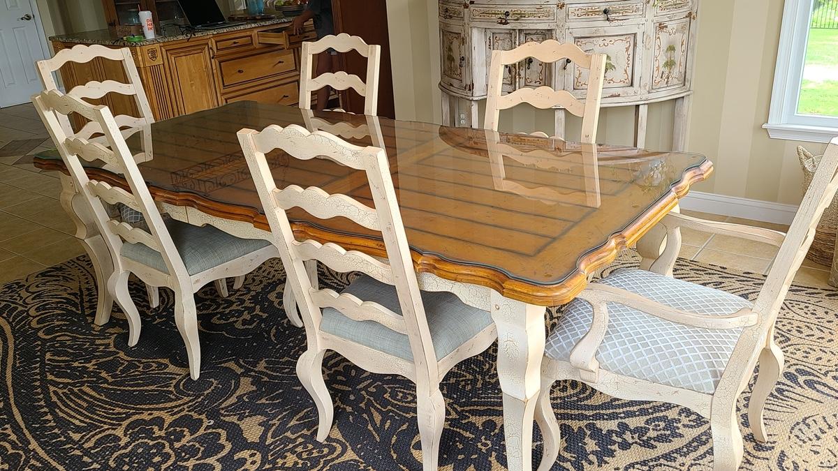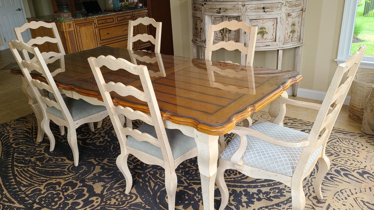 This table is gorgeous in person with a Farmhouse or Shabby Chic design, this would look amazing in a beach house as well! Clients paid a lot for this table and it is worth it, the construction is solid, glass top to protect, the upholstered chairs look new with a neutral desired pattern that can match any decor! This is a steal at this starting price point! 92x44x31 and does have an additional leaf. Please see all pictures for content of the lot, condition of the lot, and measurements if taken. Pictures are the best representation of the items listed and items are untested unless indicated in description. Thank you for looking and have fun bidding!