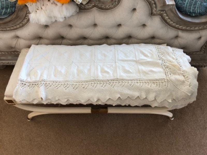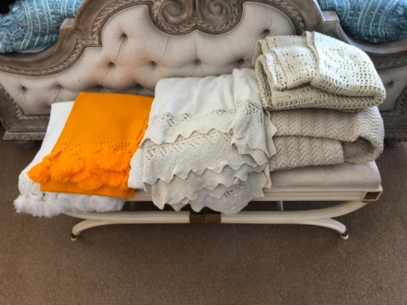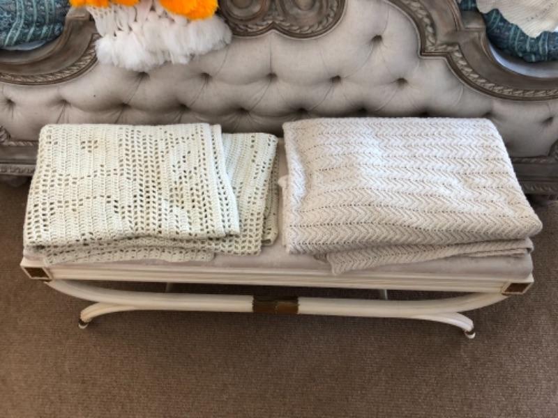 Lot 88U. Crocheted queen bedspread, 2 throw blankets with tassels, and 2 knitted afghans--$65