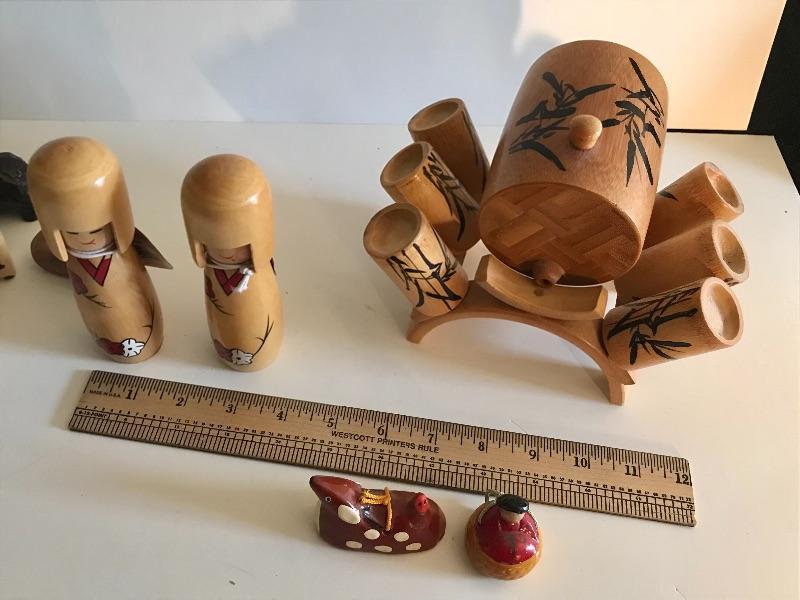 Lot 88U: Japanese Collectibles: Bamboo Saki Keg w/cups, Kokeshi and More