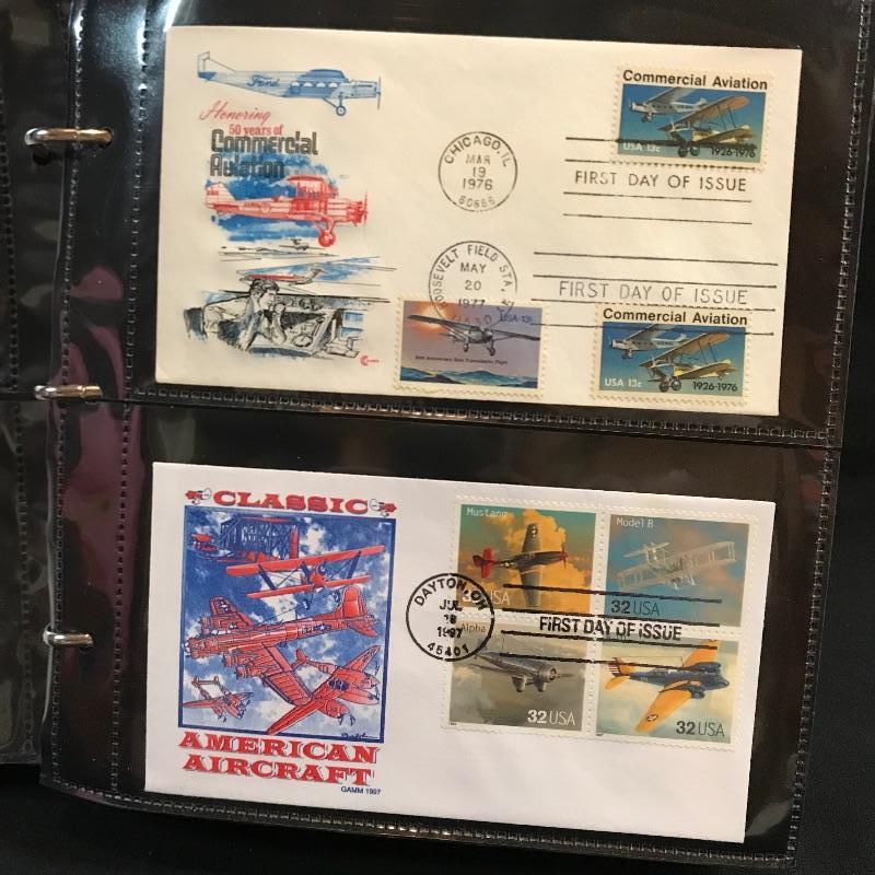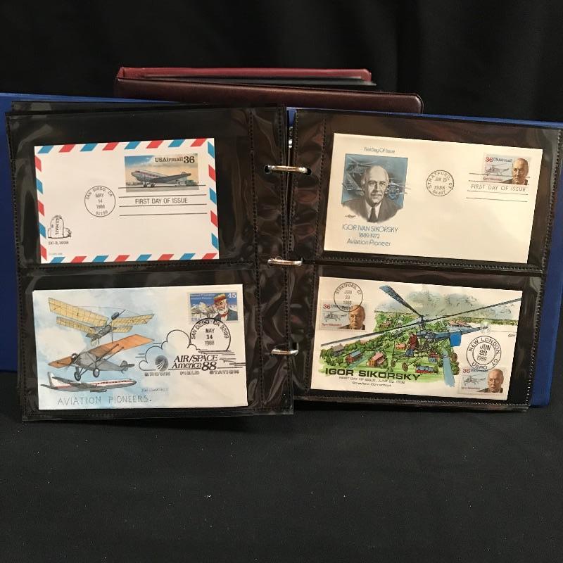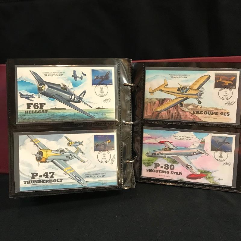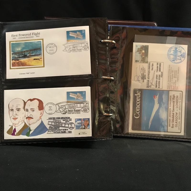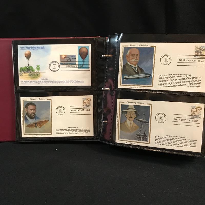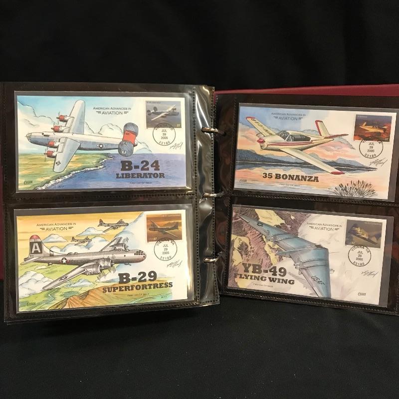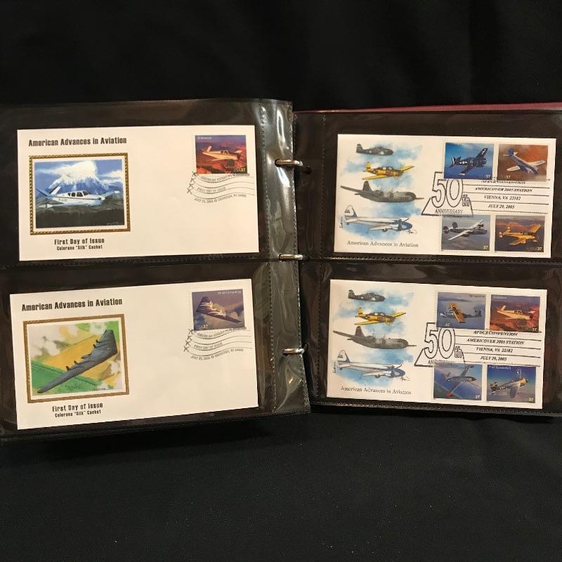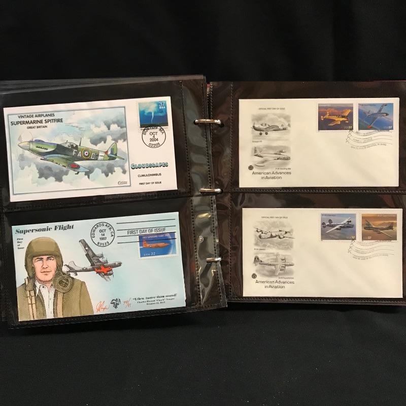 Two books with about 90 pages (mostly full, just a few blank spots) about flight. With hot air balloons, planes, pilots and more! There are a couple random 1st day covers here and there. Lot also includes ten “American Advances in Aviation” full colored first day covers - double wrapped in plastic with what looks like an artist signature.