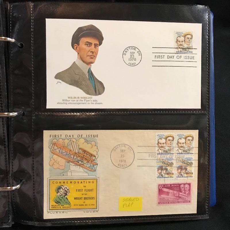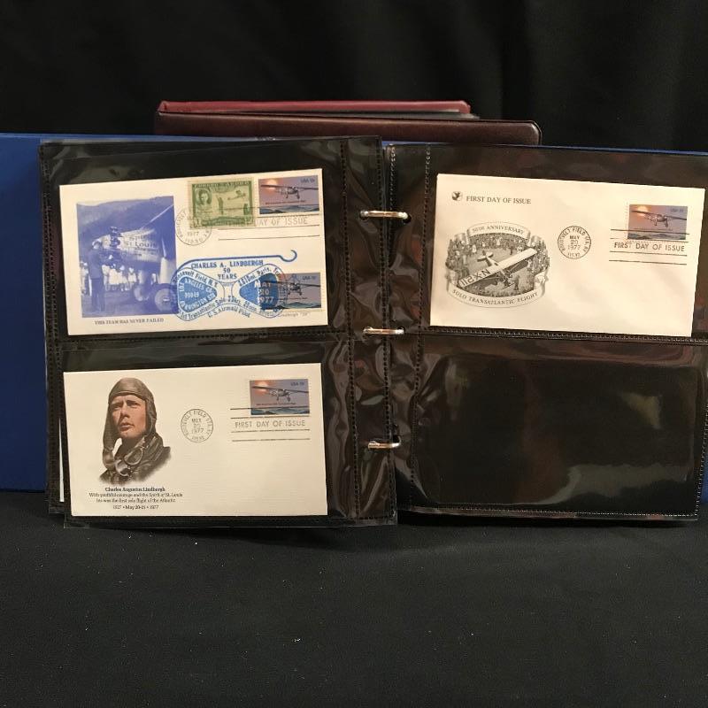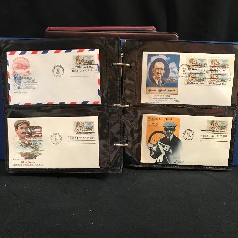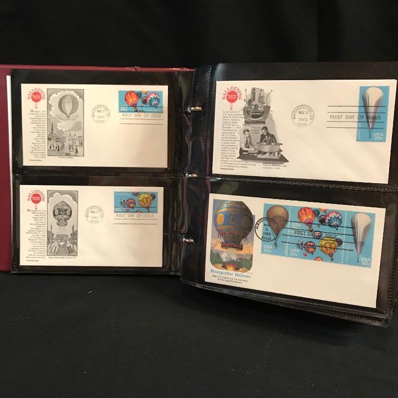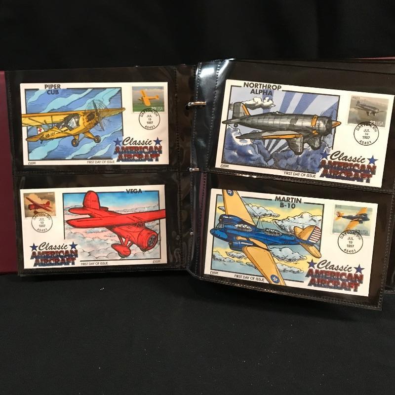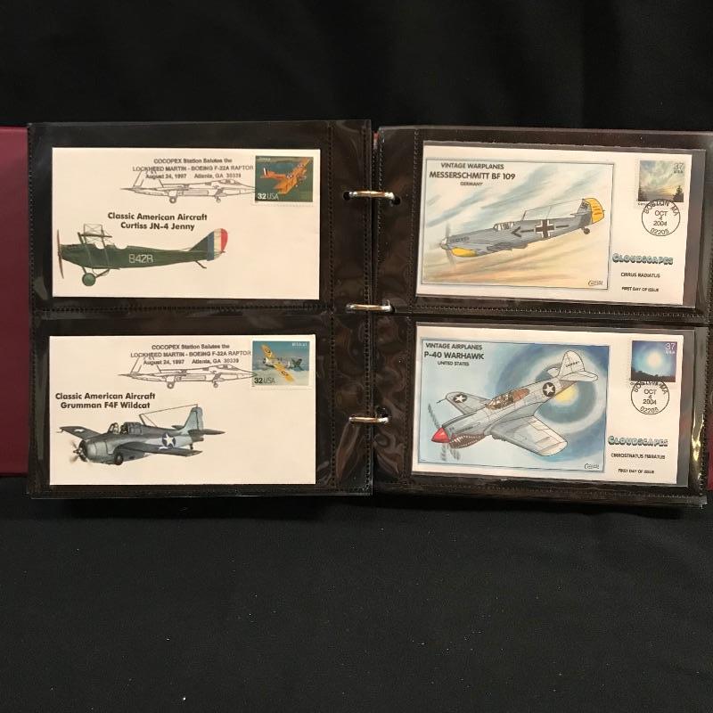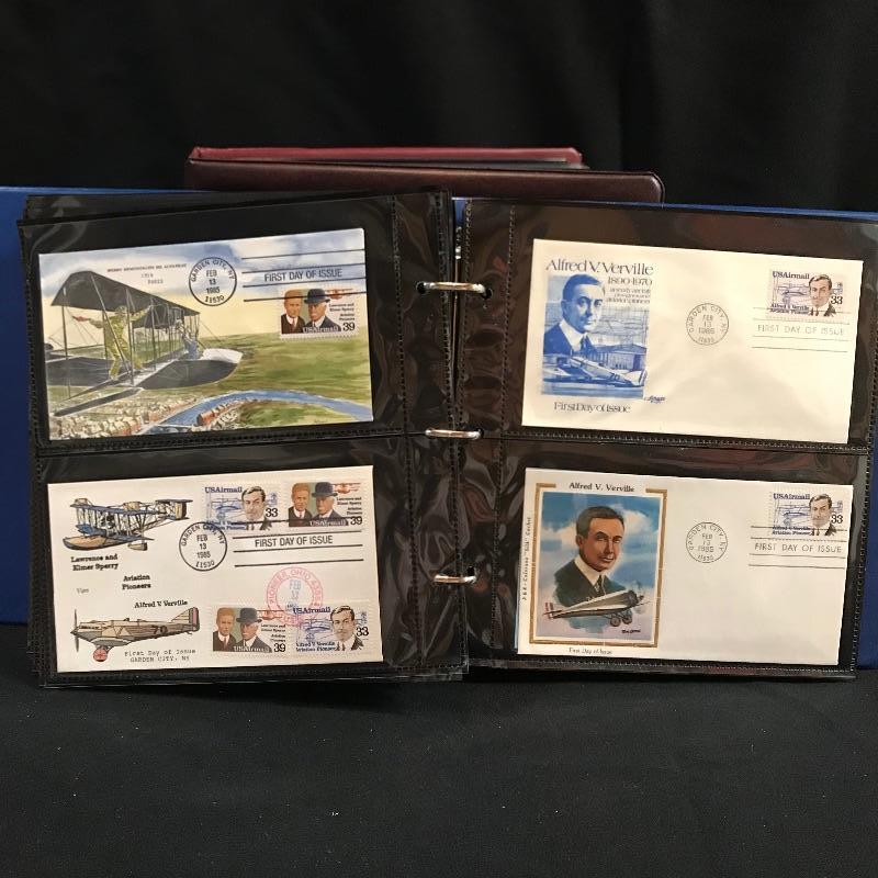 Two books with about 90 pages (mostly full, just a few blank spots) about flight. With hot air balloons, planes, pilots and more! There are a couple random 1st day covers here and there. Lot also includes ten “American Advances in Aviation” full colored first day covers - double wrapped in plastic with what looks like an artist signature.