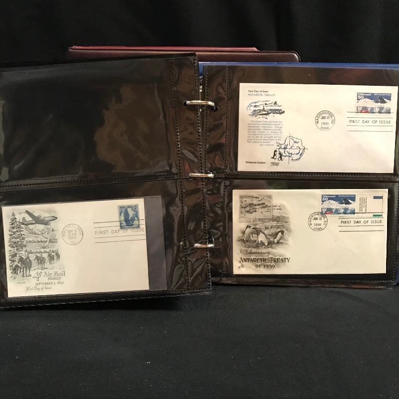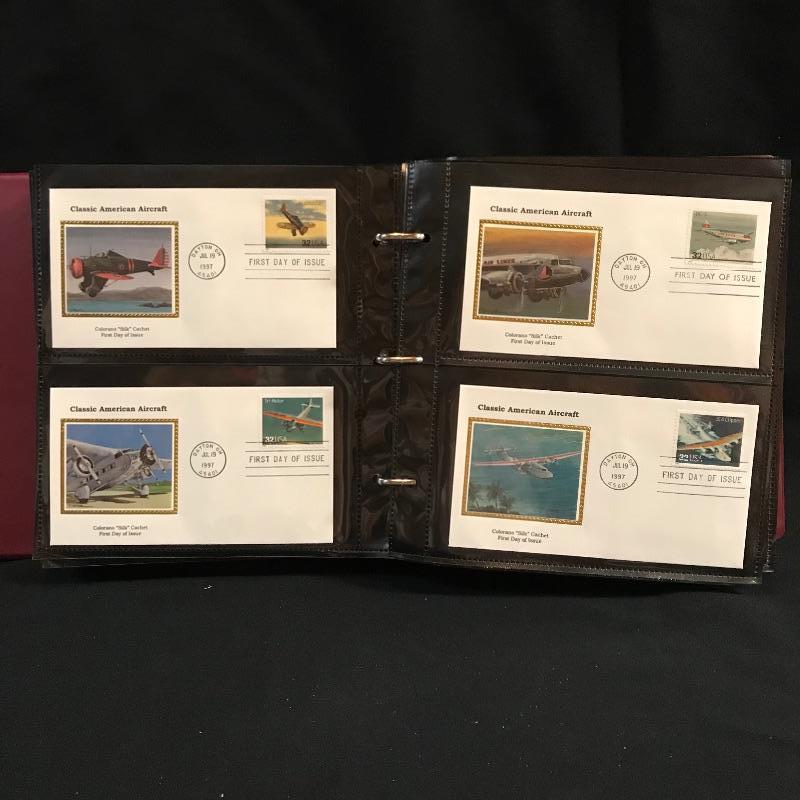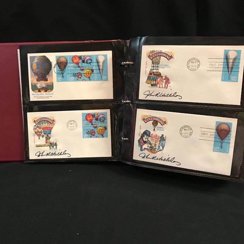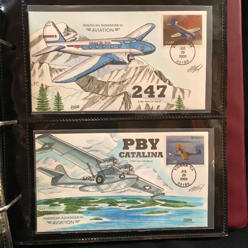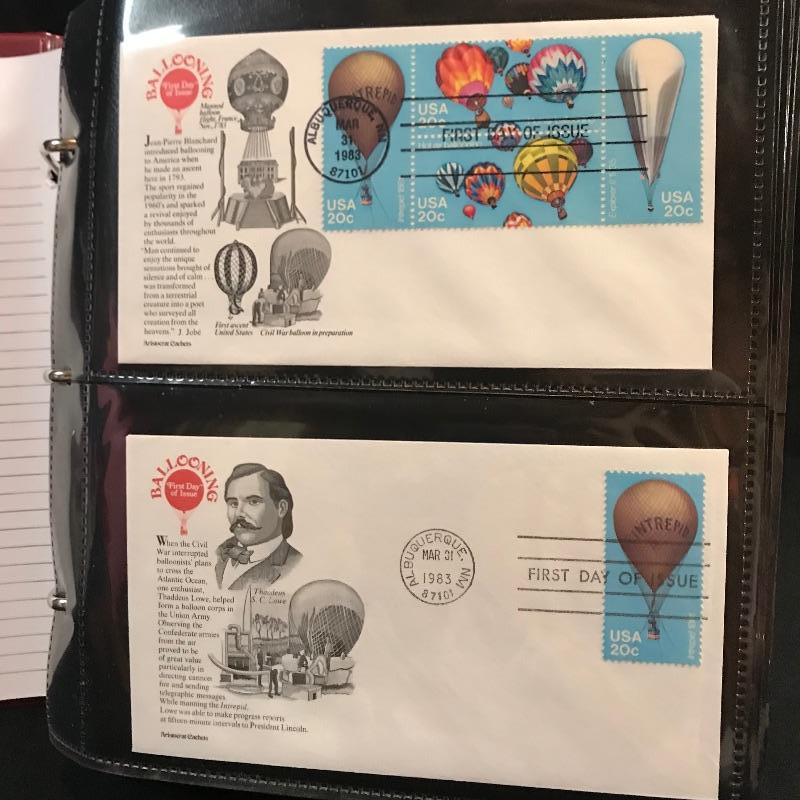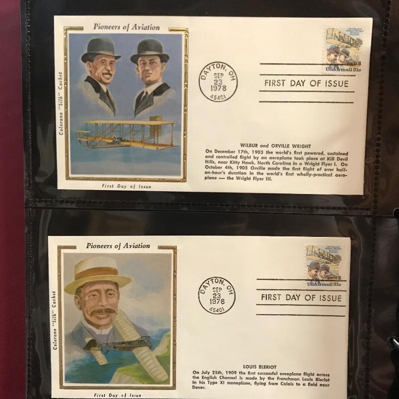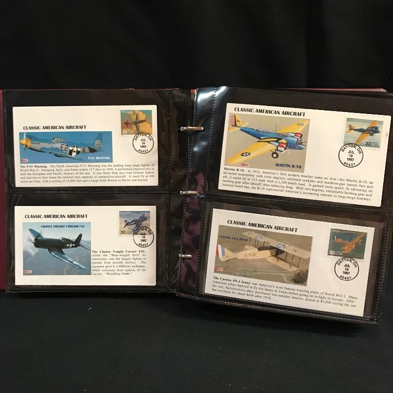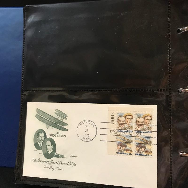 Two books with about 90 pages (mostly full, just a few blank spots) about flight. With hot air balloons, planes, pilots and more! There are a couple random 1st day covers here and there. Lot also includes ten “American Advances in Aviation” full colored first day covers - double wrapped in plastic with what looks like an artist signature.