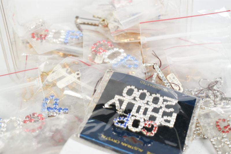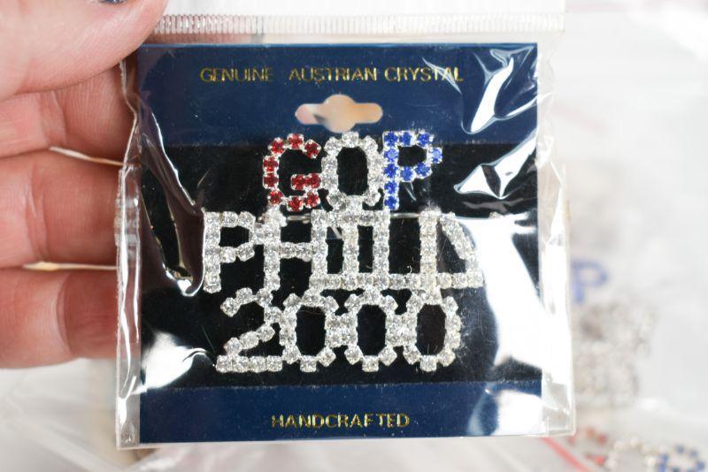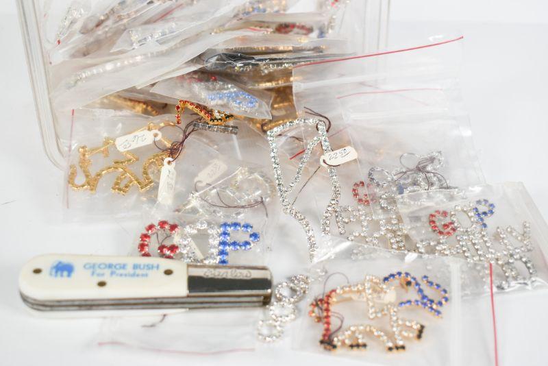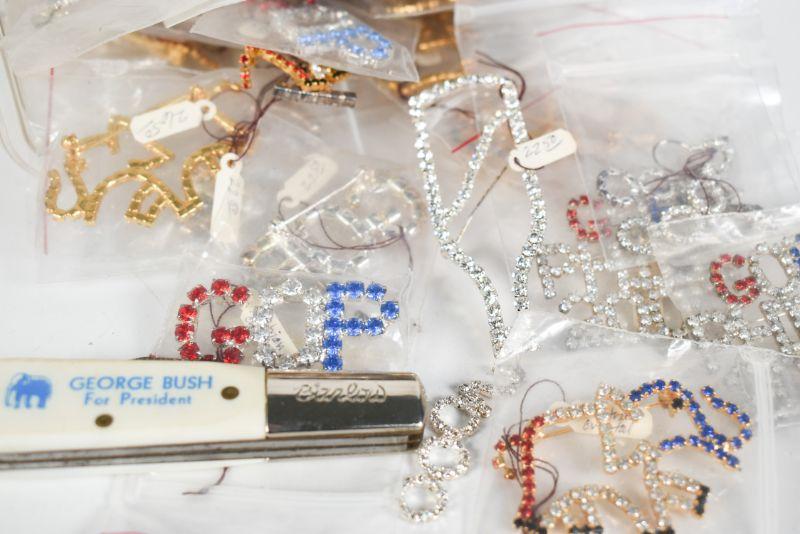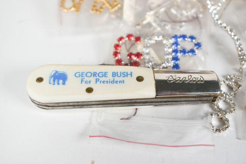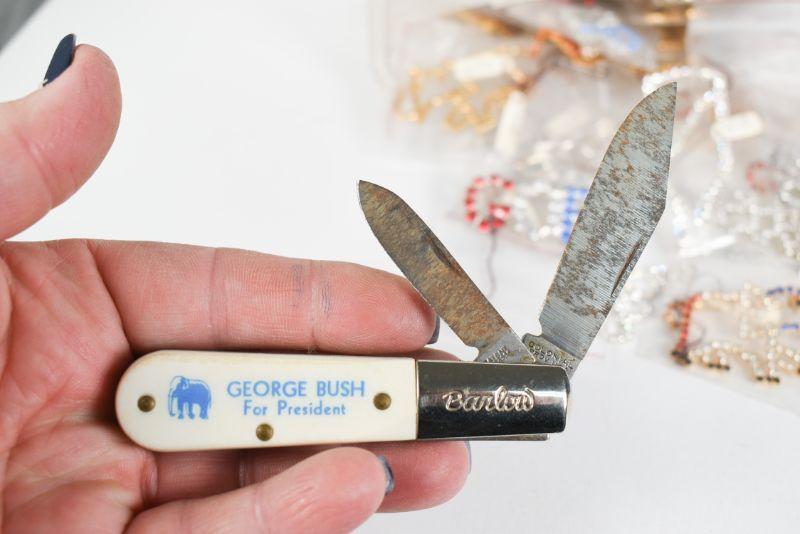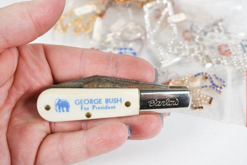Lot of political jewelry, as well as a George Bush for President pocket knife manufactored by Barlow. **Please read Terms and Conditions before placing a bid. Pick up is Sunday, December 22 from 11am to 3pm or Monday, December 23 from 4pm-7pm in Mantua, NJ. All sales are final. All sales are as is, where is. Please review all photos. Props are not included. Measurements are approximate.