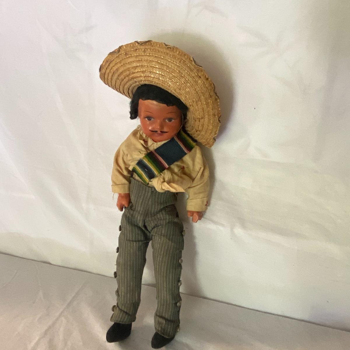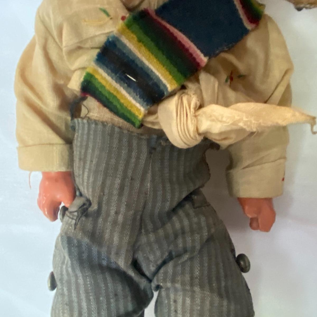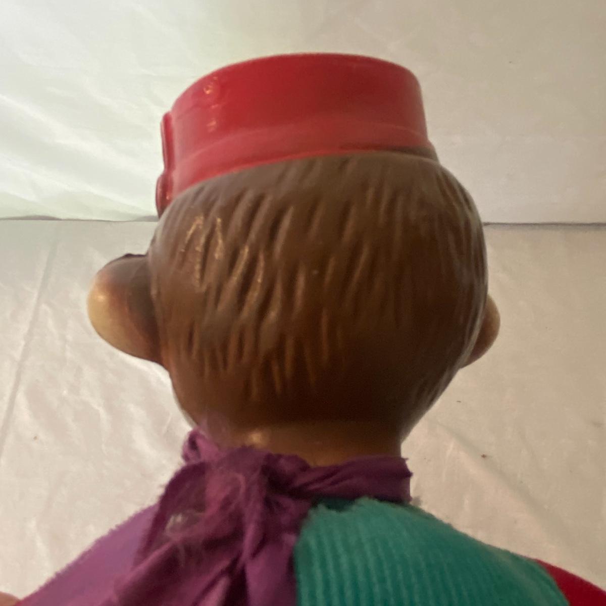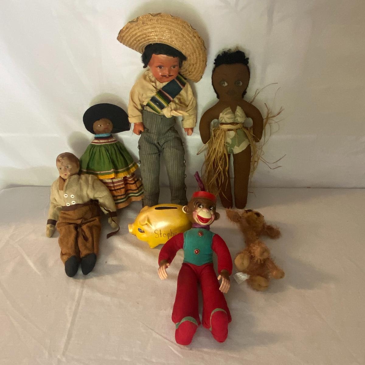 Lot includes six plush vintage dolls. See photos. Lot also includes a yellow piggy bank with the name Stephen on the outside. Doll with sombrero measures to stand approx. 20” tall. The monkey is 12” tall. See photos. Shipping Available.