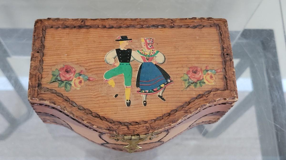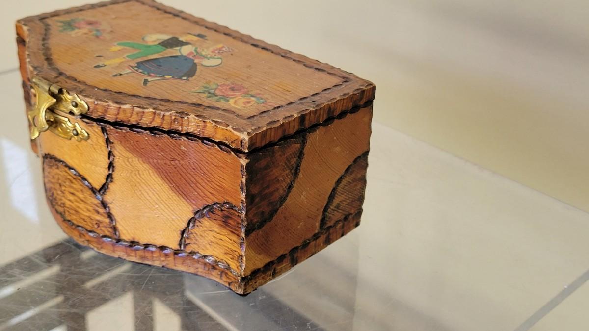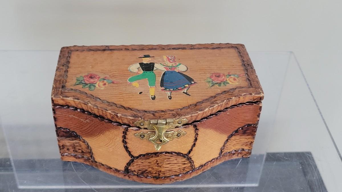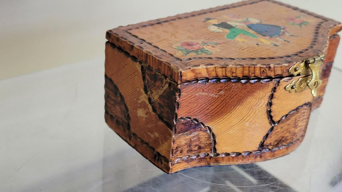 Lot 89: Vintage Chased Wood Trinket Box with Dancing Couple and Flowers Transfers