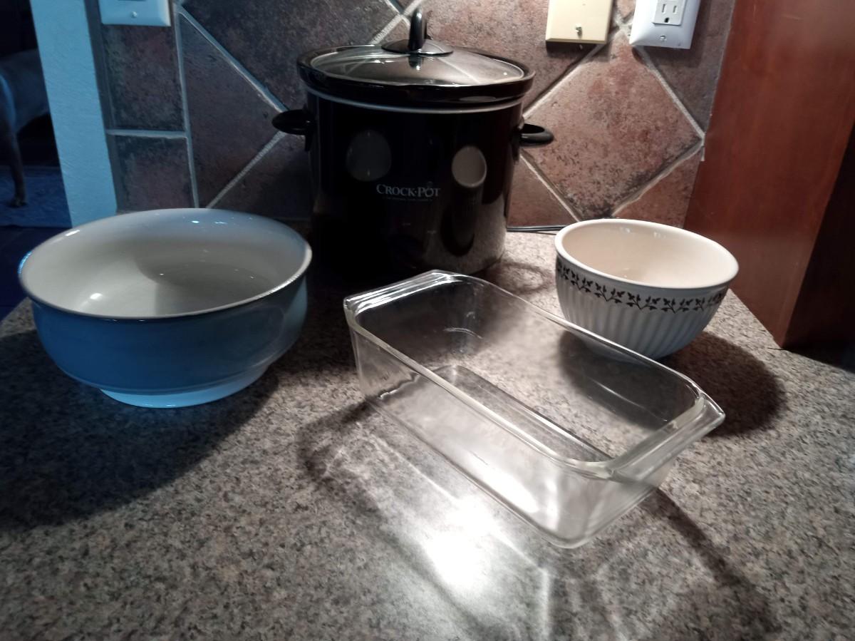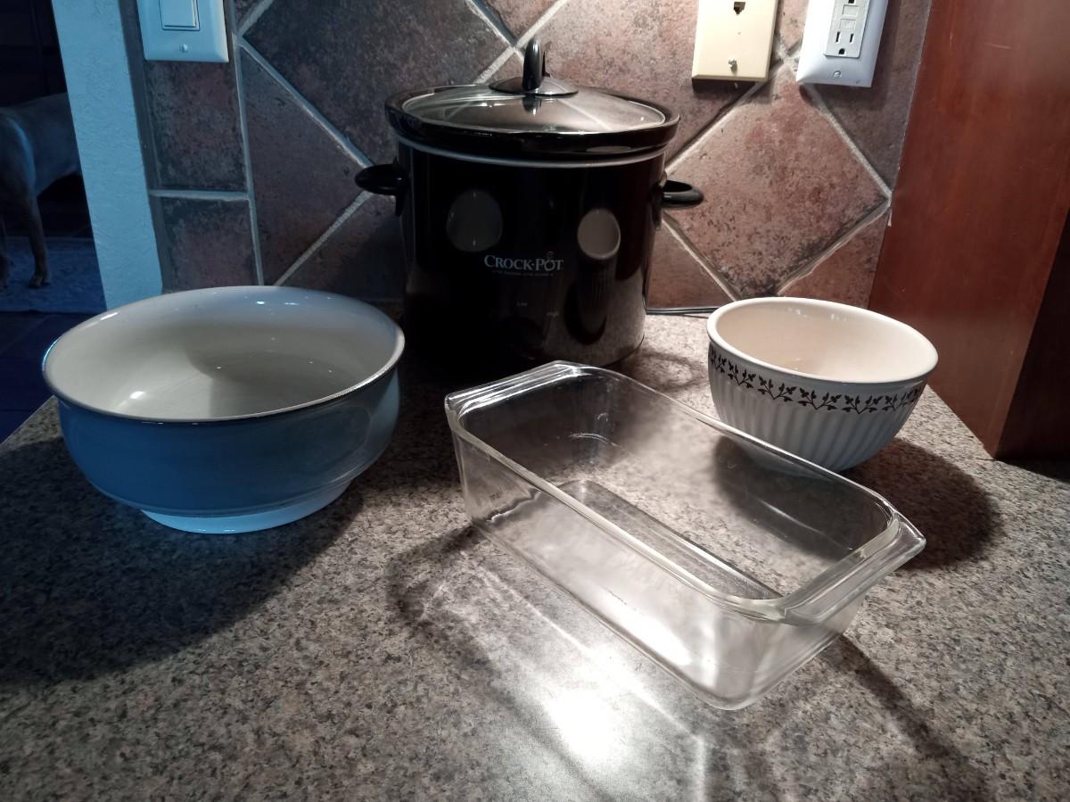 LOT 89 CROCK POT, 2 SERVING BOWLS AND A GLASS LOAF PAN (HU)