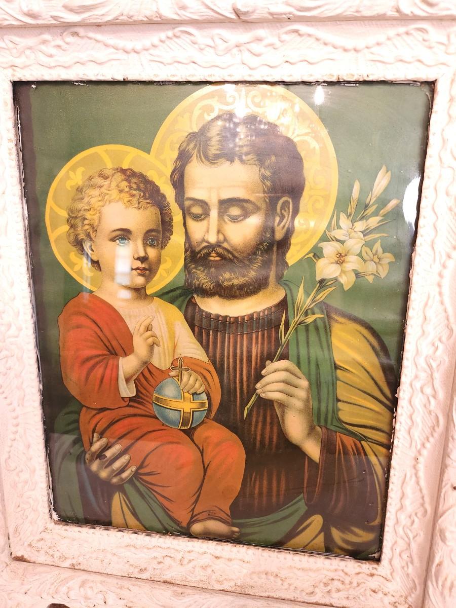 Nice old color lithograph from the turn of the century - St. Joseph and the Christ Child - original frame - large, measures 26.5" x 30.5". Antique condition.