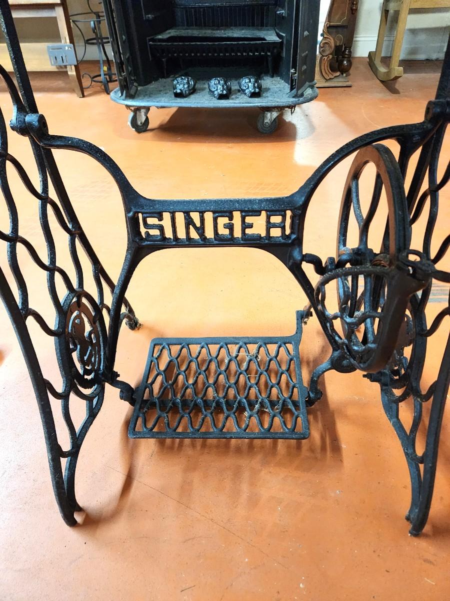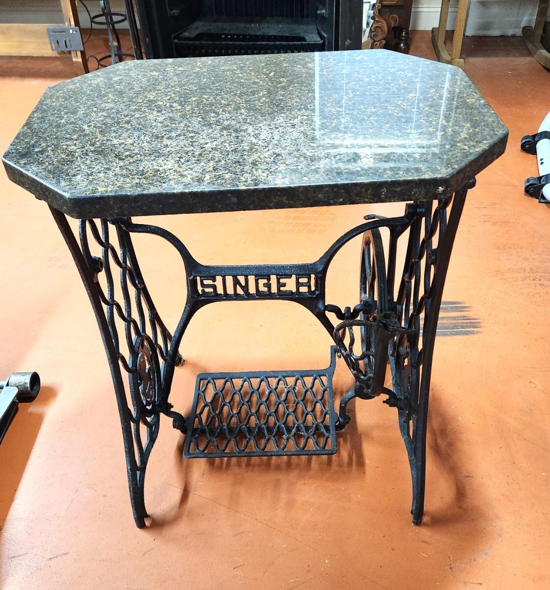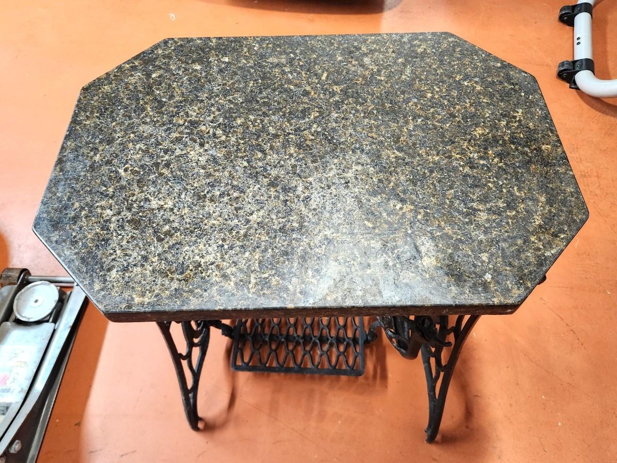 Good looking Singer Sewing Machine base (metal) with contemporary Granite top. Good inside or out. 29" tall, top is 26" x 18". Good condition. This item is downstairs.