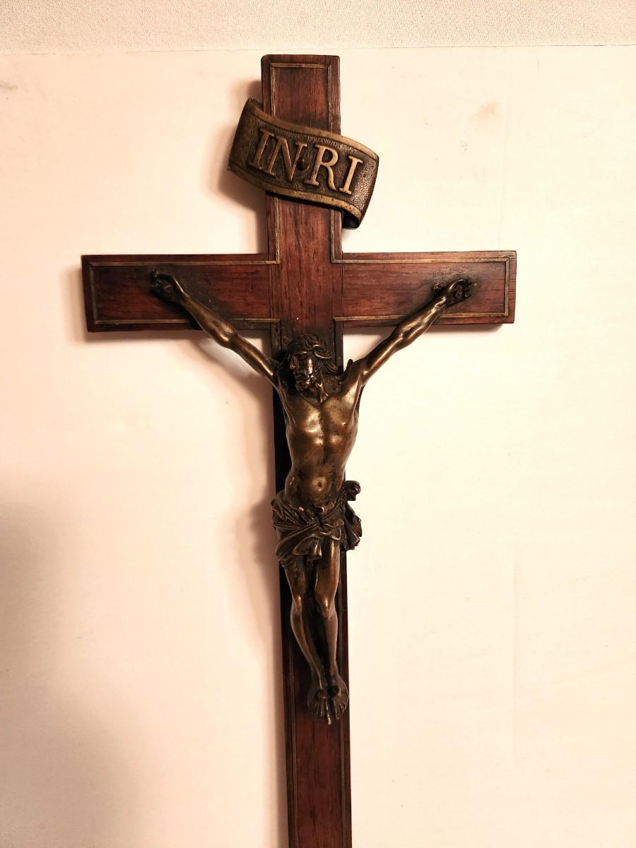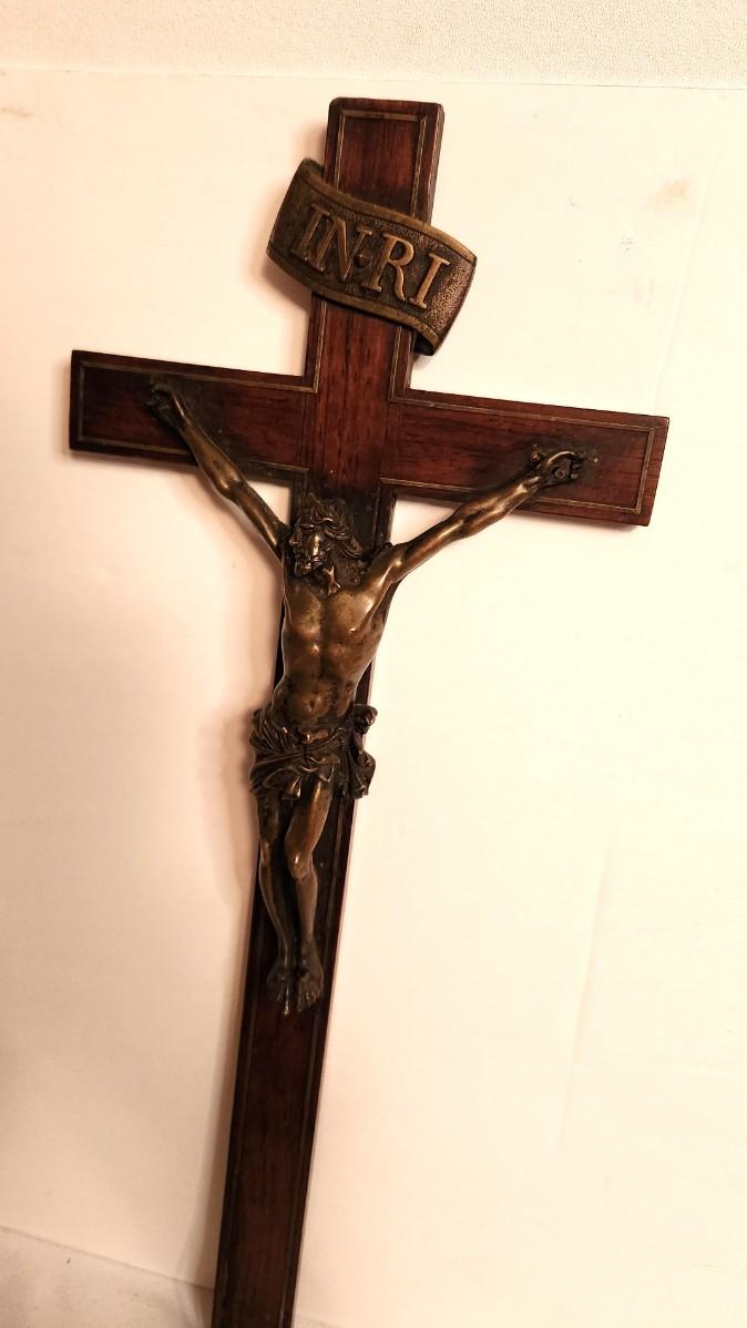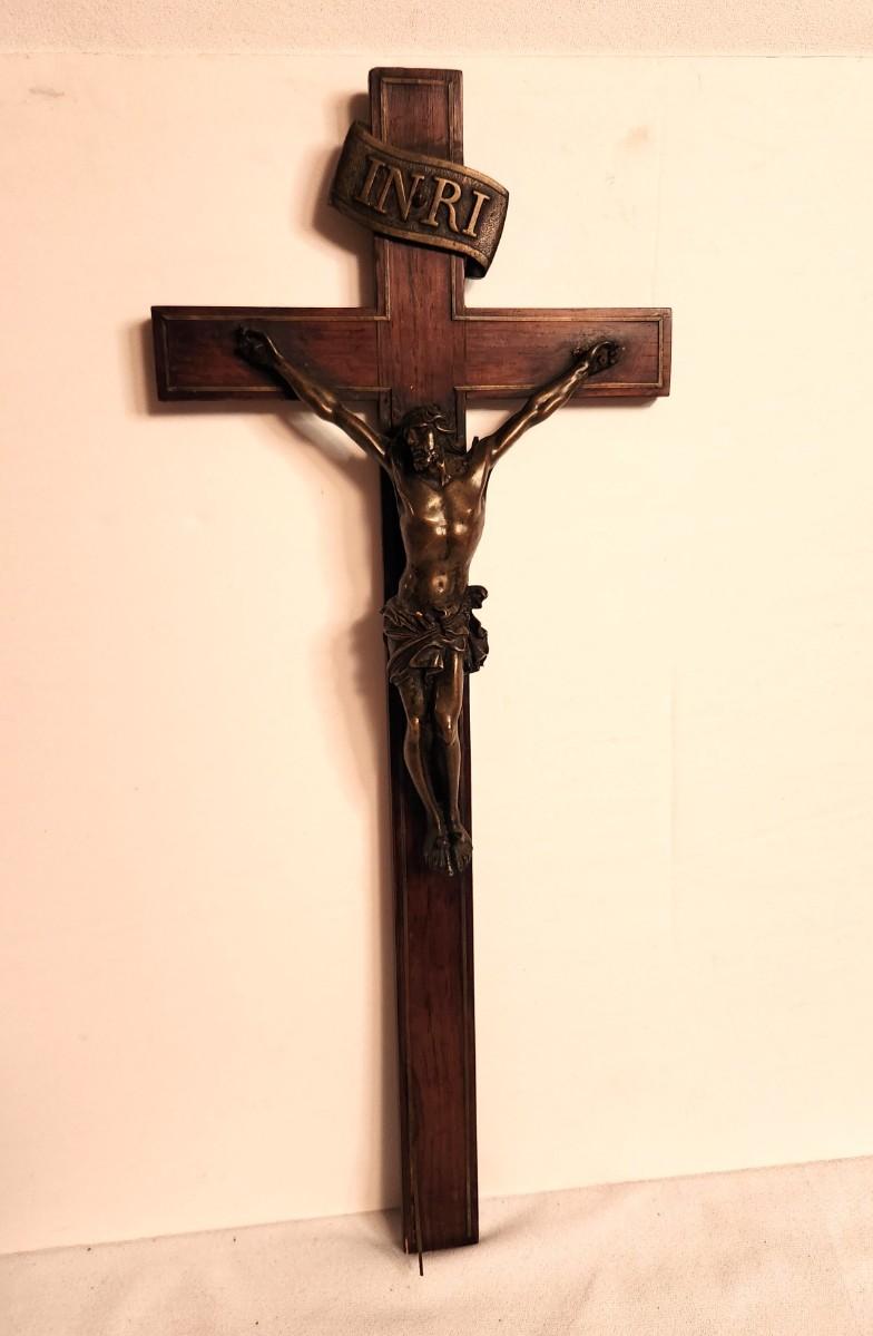 Nice antique wall crucifix, wood with metal Corpus, metal banding coming out a bit at the bottom (easy repair) - 20" tall, 8" wide, a handsome, traditional piece.