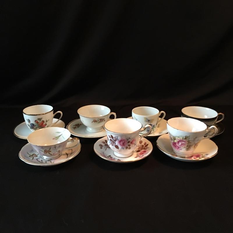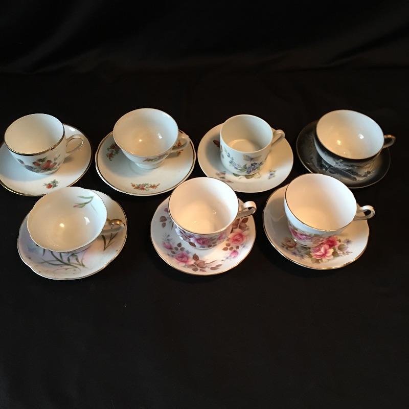 Array of tea cups and saucers includes Limoges, Queen Anne, Regency and more. A great selection of unique cups and saucers.