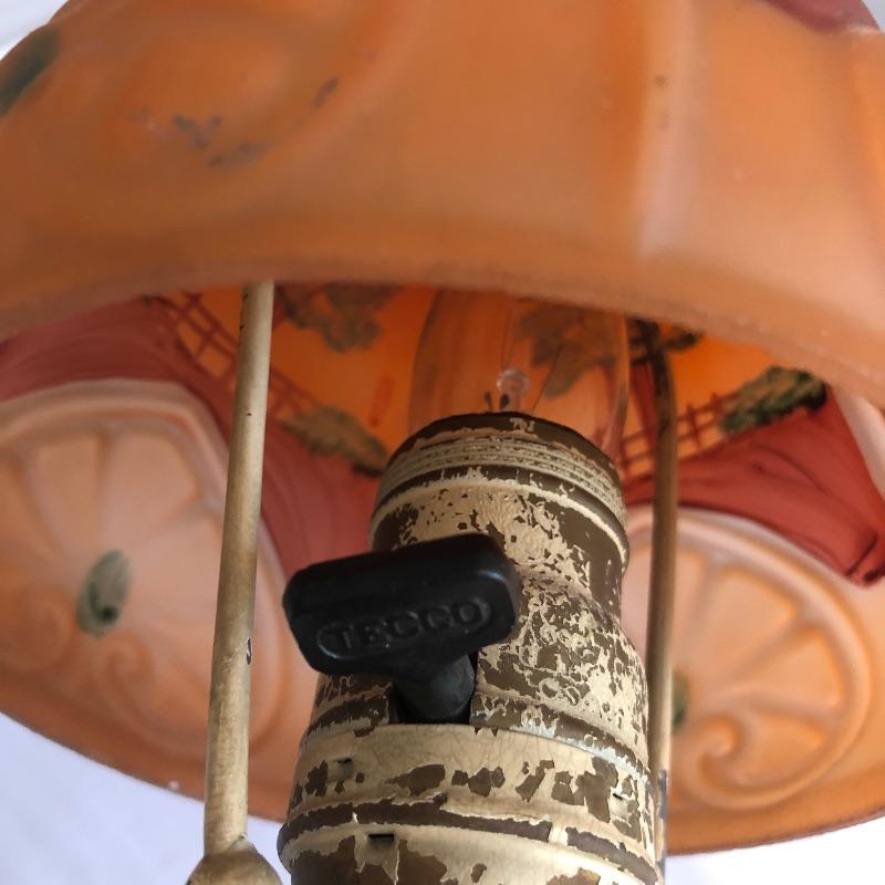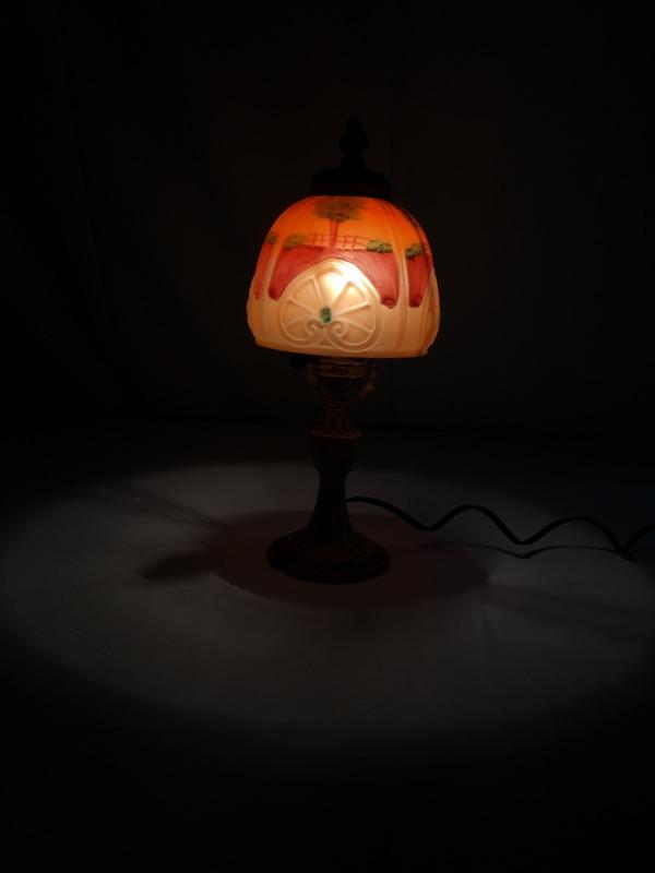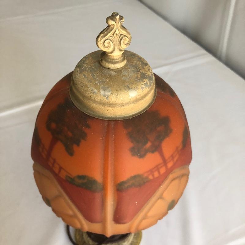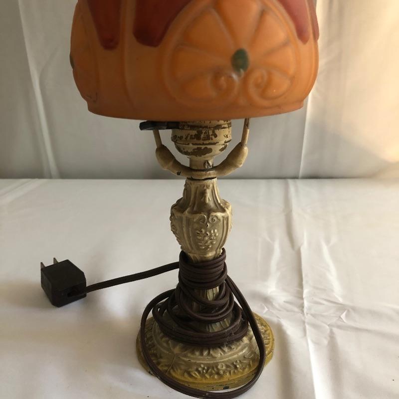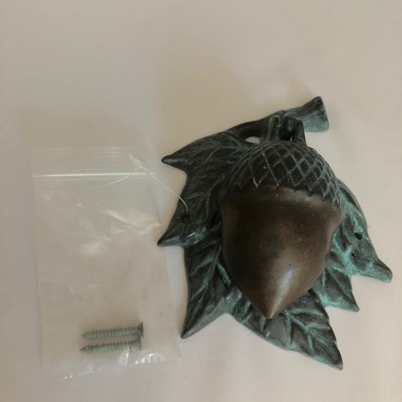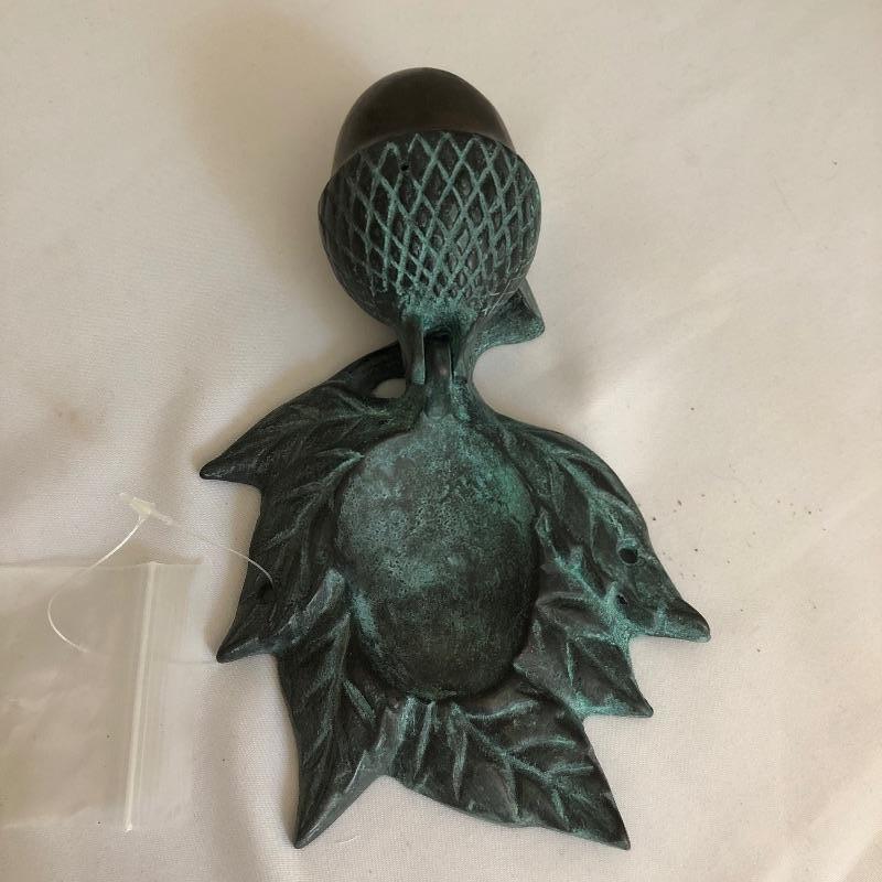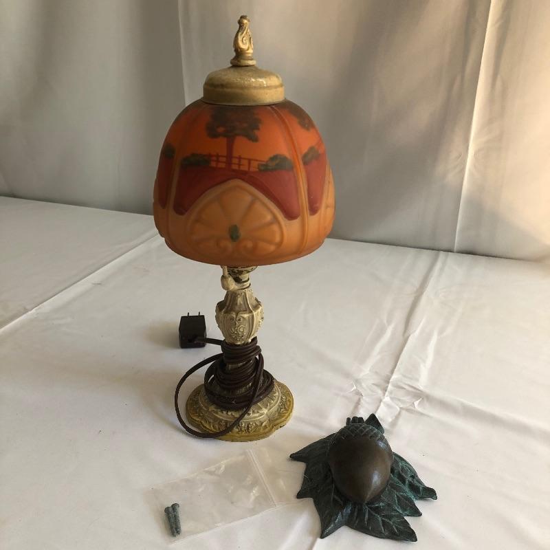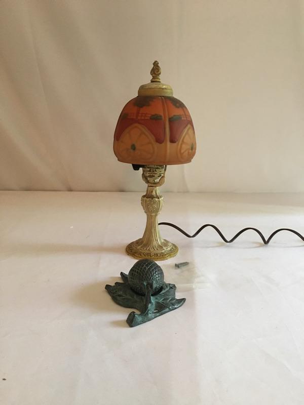 Grab the essence of Arts & Crafts here with two subtle yet amazing pieces. This lot includes a lamp with a metal base and glass shade, as well as a metal acorn knocker. The lamp worked when tested. The knocker is complete with 2 screws waiting for your door! Lamp measures 14”H. Shipping available.