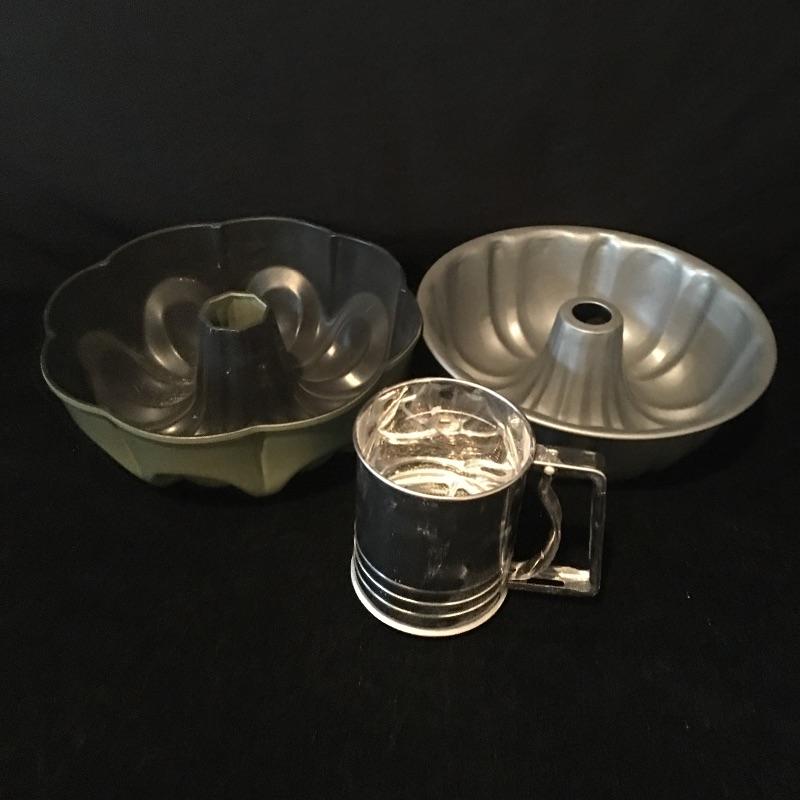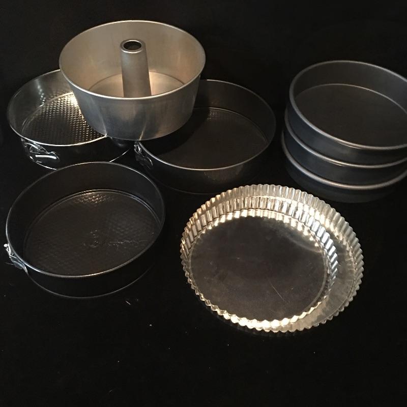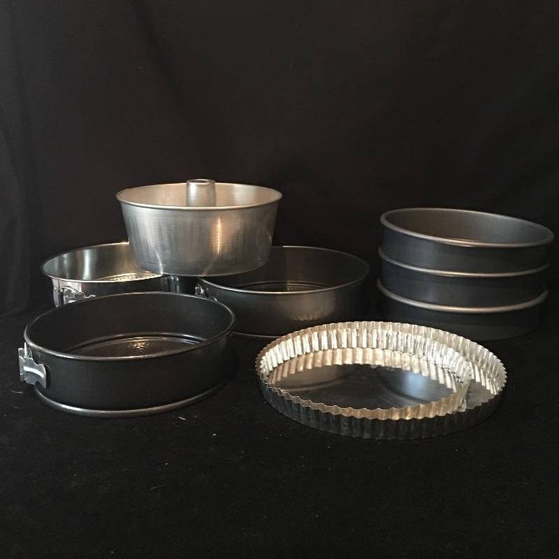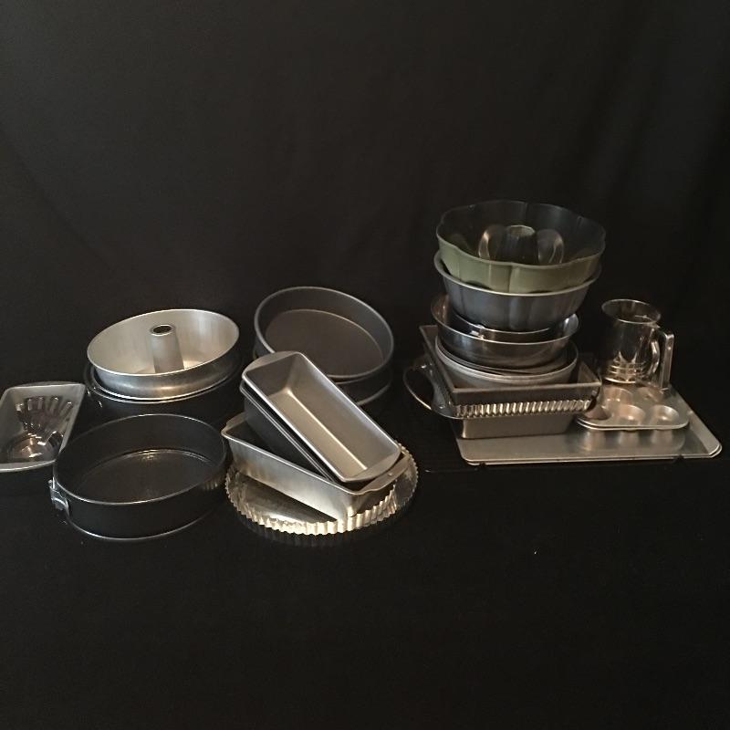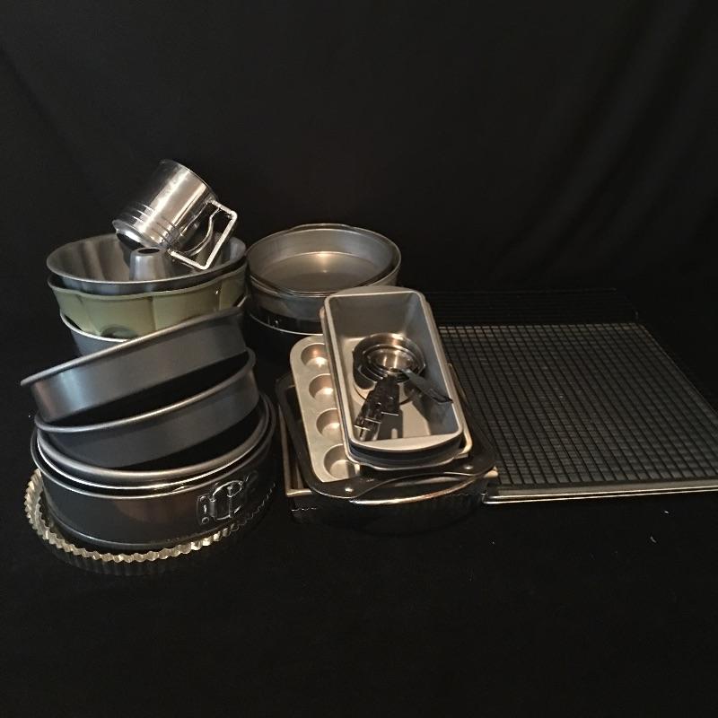 Baking essentials includes sifter, baking trays, cake pans, bread pans, two Bundt pans, measuring cups, mini muffin pans, mixing bowls and more. Baking tray measures 14” x 16.5”.