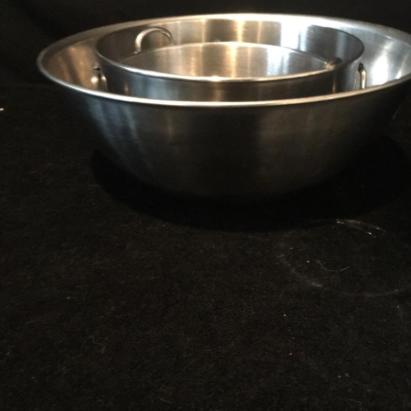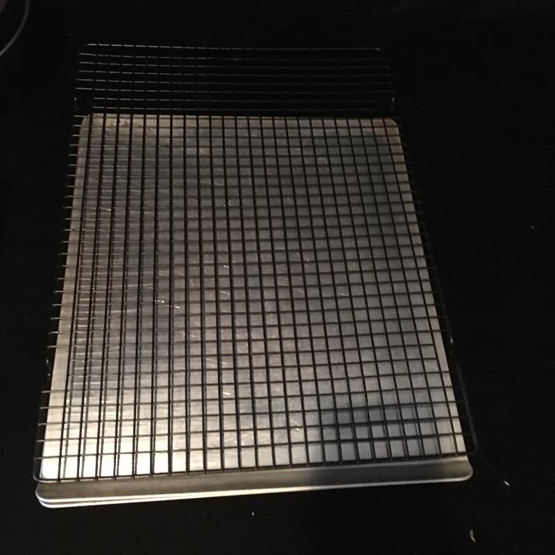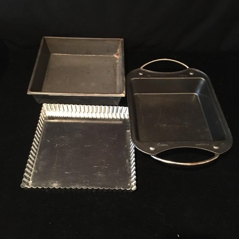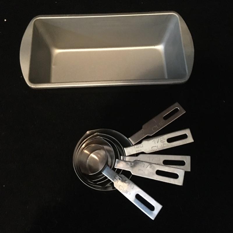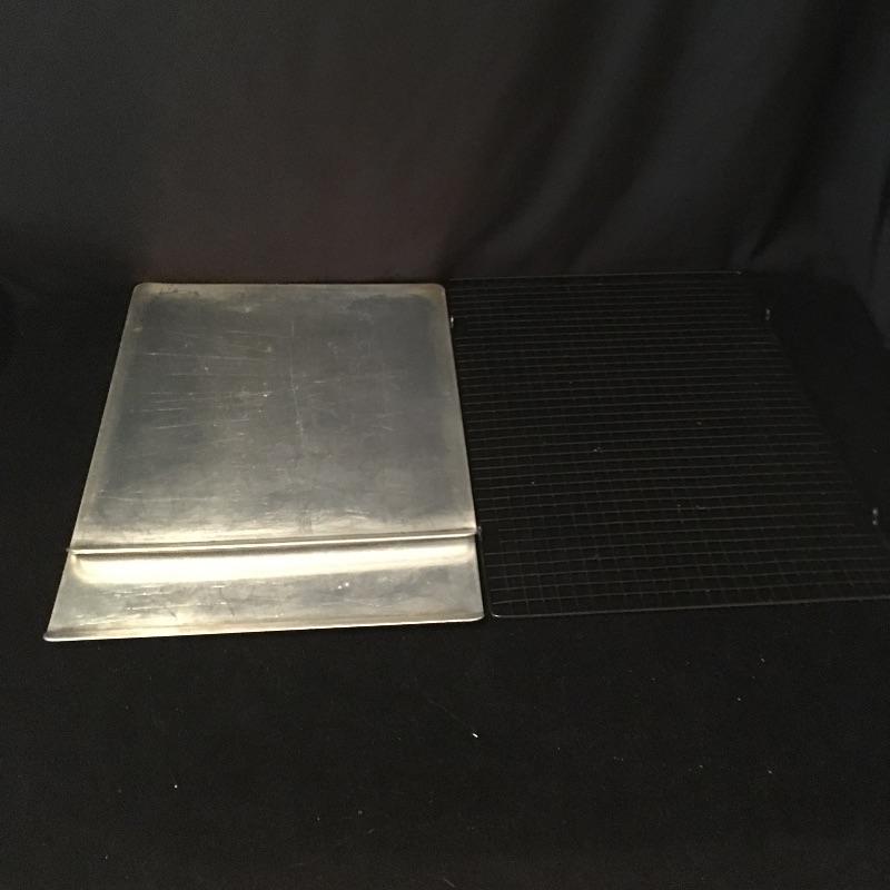 Baking essentials includes sifter, baking trays, cake pans, bread pans, two Bundt pans, measuring cups, mini muffin pans, mixing bowls and more. Baking tray measures 14” x 16.5”.