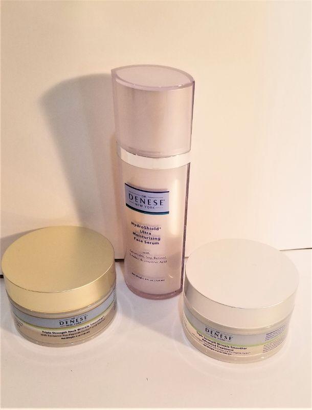 Three piece face cream lot here - Dr. Denese Triple Strength Neck Wrinkle Smoother (4 oz jar), Advanced Wrinkle Smoother (3.4 oz), and Hydroshield Ultra Moisturinzing Face Serum (4 oz bottle). All new and unused.