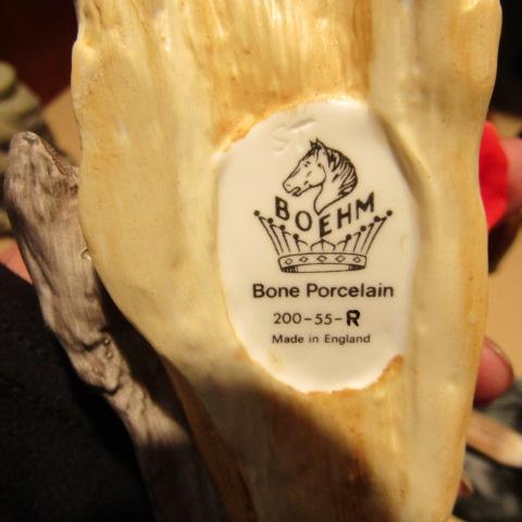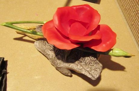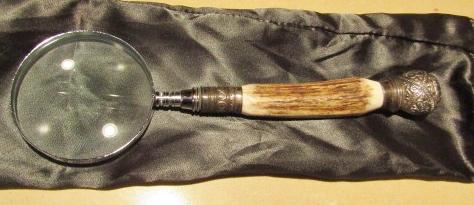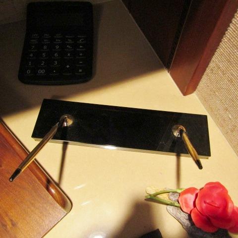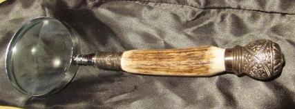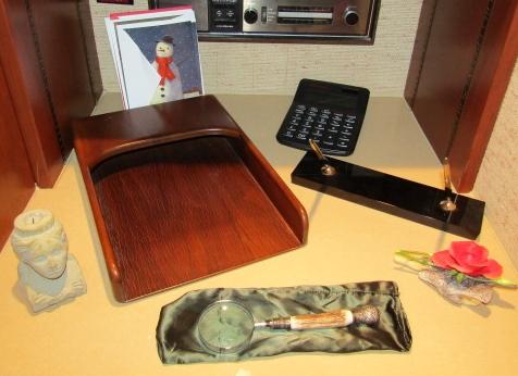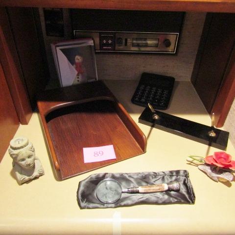 WOODEN LETTER HOLDER, CALCULATOR, CROSS PEN & PENCIL ON MARBLE, MAGNIFYING GLASS WITH ANTLER? HANDLE, BOEHM PORCELAIN ROSE AND MORE