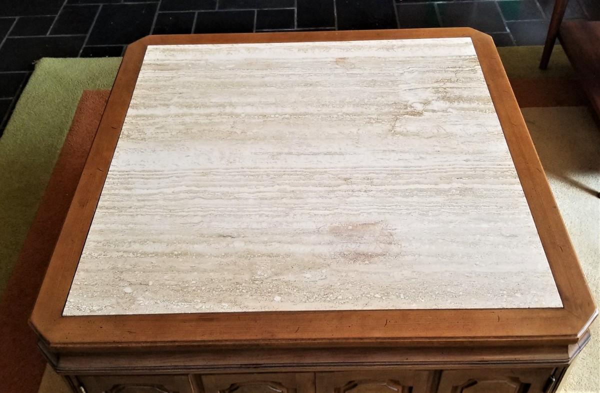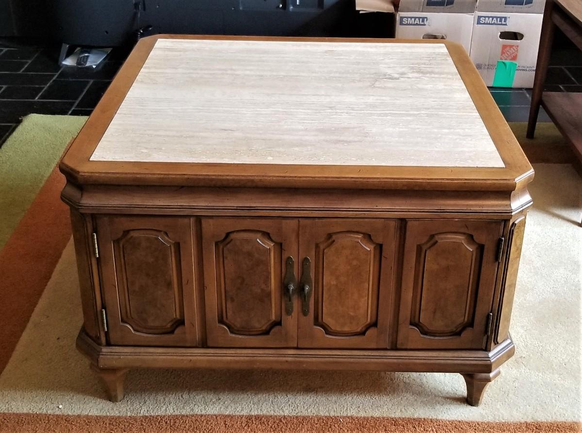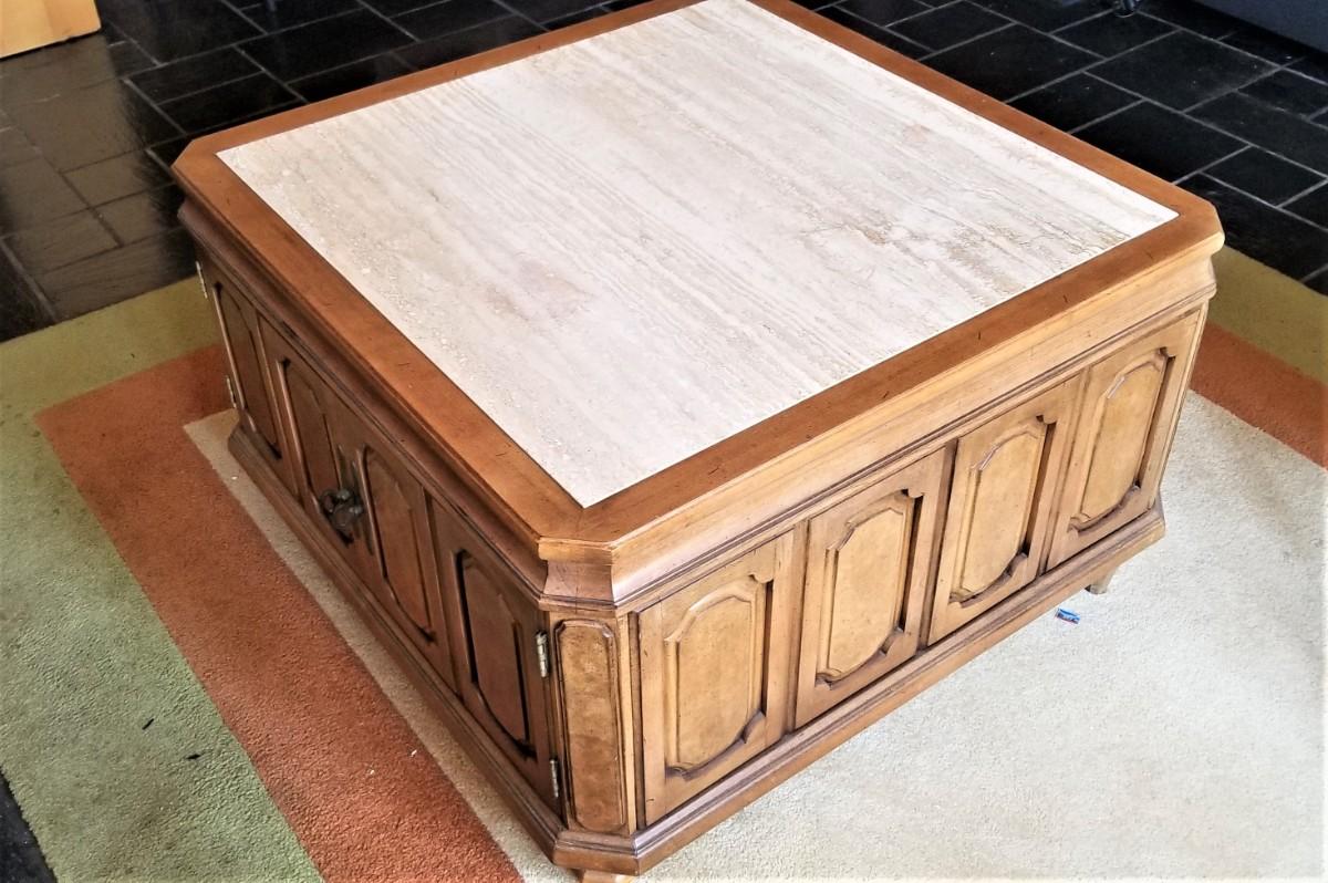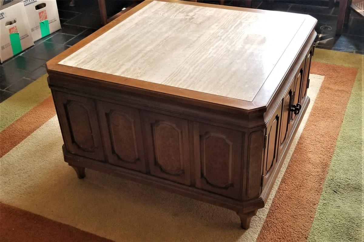 Classic 70's styling - oak finish, marble top. Tons of storage beneath. 30" x 30", 19.5" tall. No maker noted. Gently used condition. HEAVY.