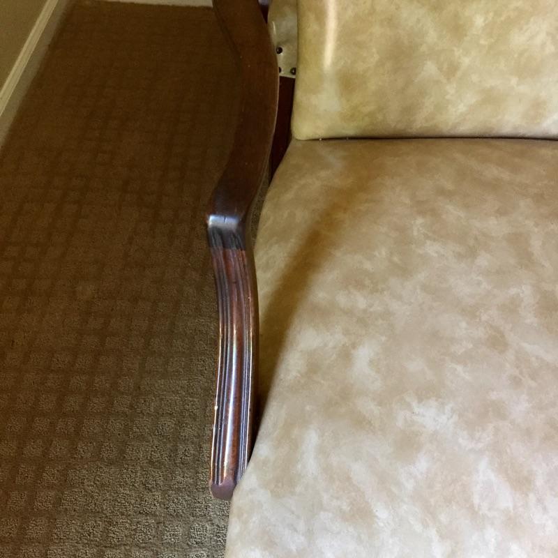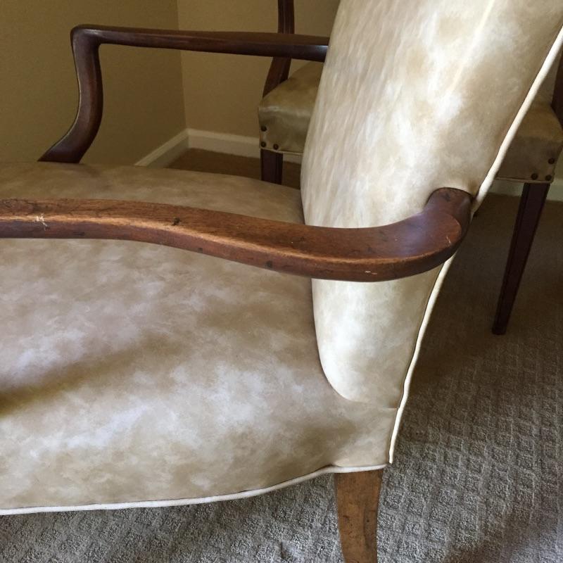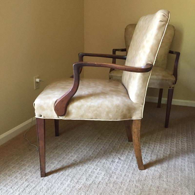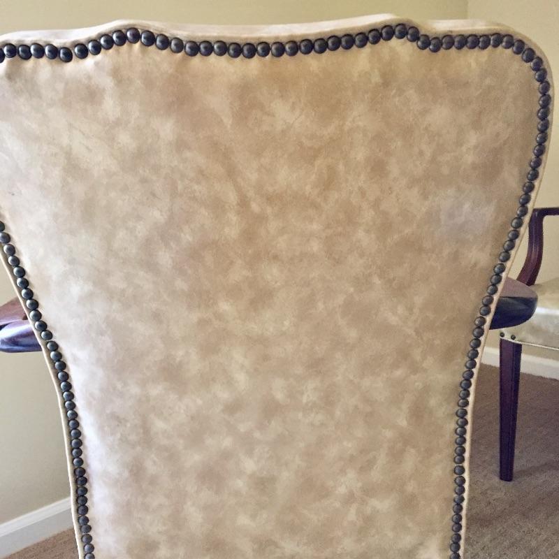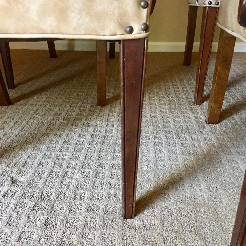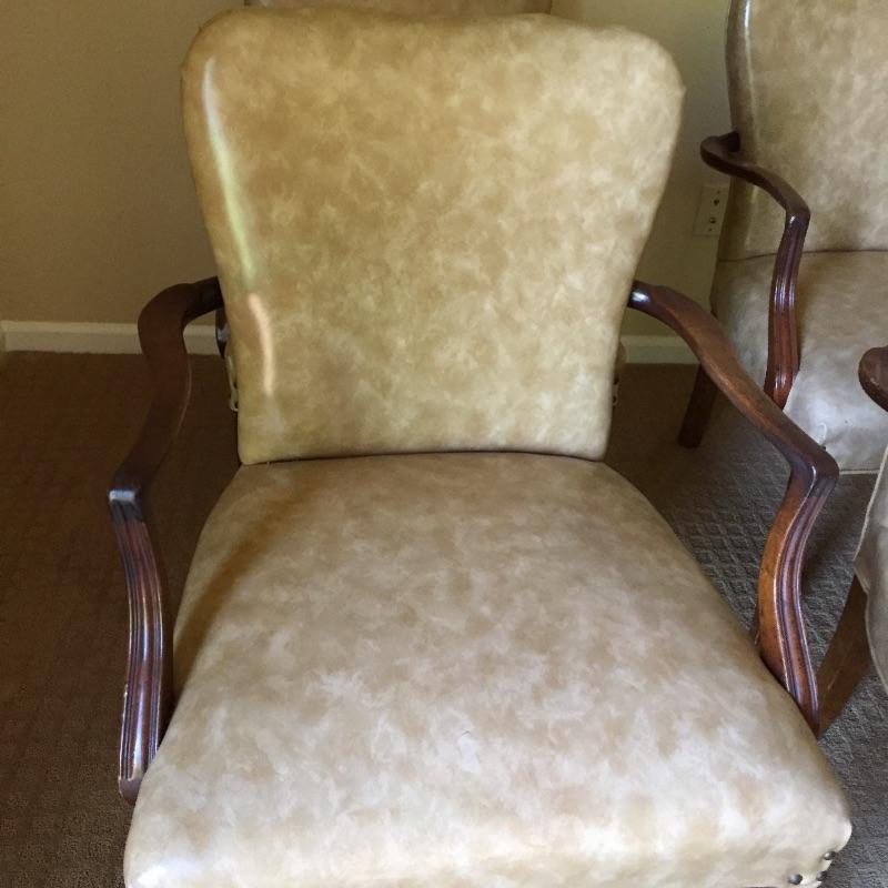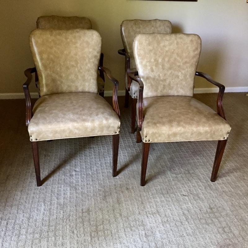 These 4 matching vinyl chairs are a warm tan color and have wood arms and legs and brass tacks on the backs.