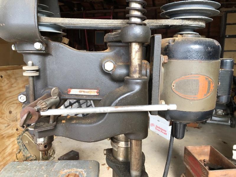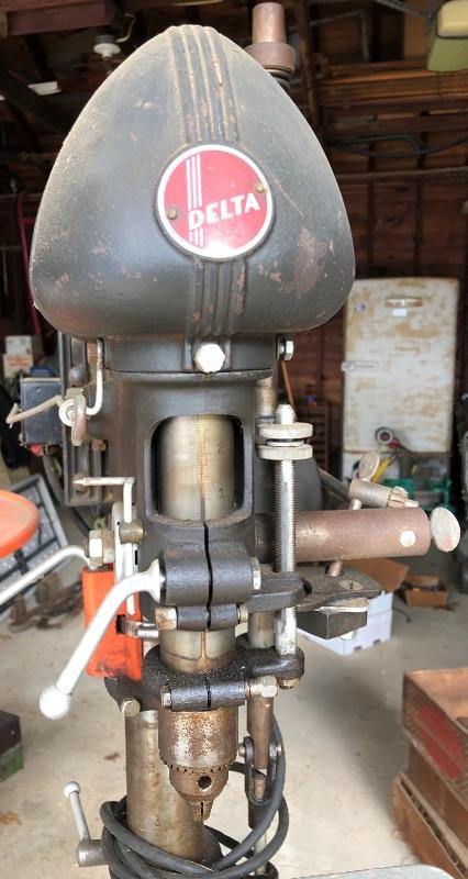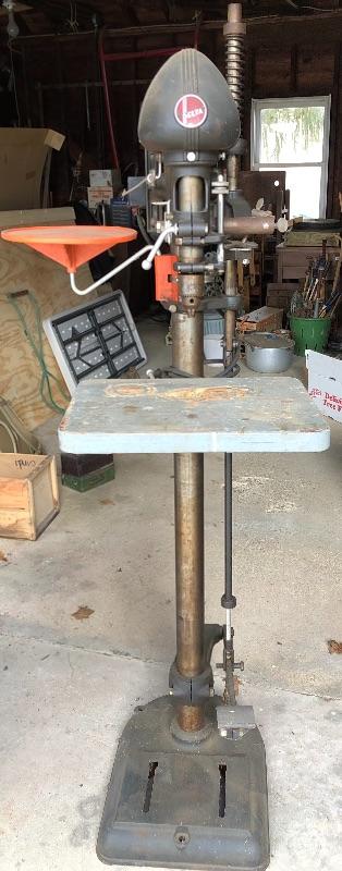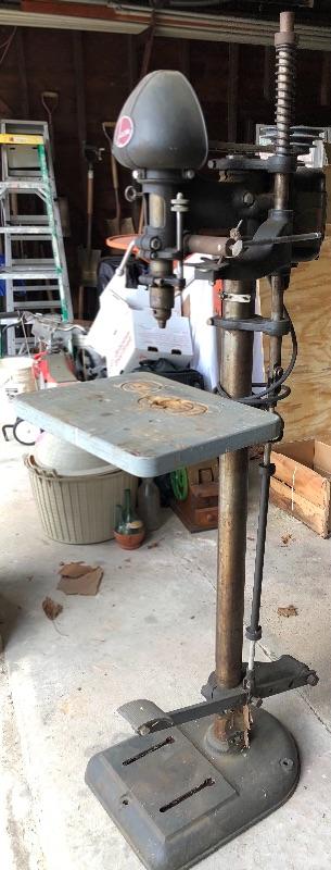 Vintage Delta drill press with two boxes of assorted bits and chucks. 18” L x 29” W x 72” H. Type SCS Double Duty Motor. Please see all pictures for content of the lot, condition of the lot, and measurements if taken. Pictures are the best representation of the items listed and items are untested unless indicated in description. Thank you for looking and have fun bidding!
