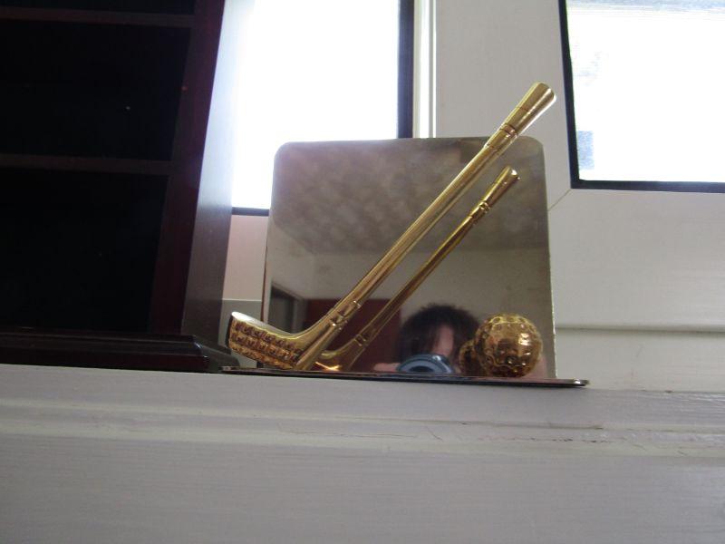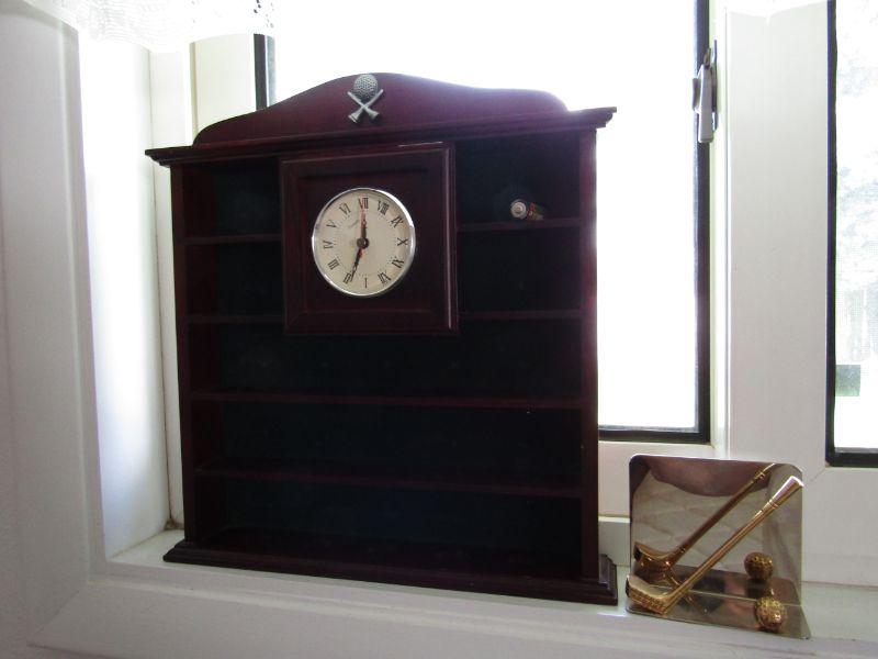 SMALL SHELVING FOR MANTLE OR HANGING WITH CLOCK EMBEDDED & BRASS GOLF CLUB NOTE HOLDER