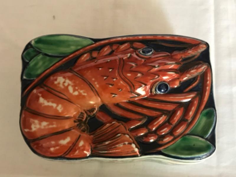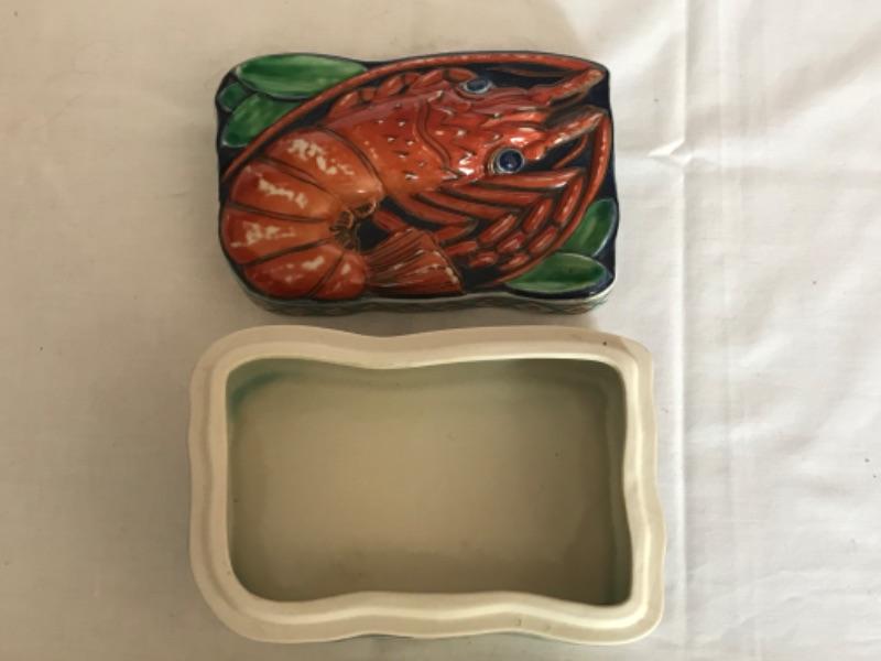 Japanese Imari box with lid. Lid is decorated with a prawn/shrimp. Box measures 7” long 4-1/2” wide and 3” tall