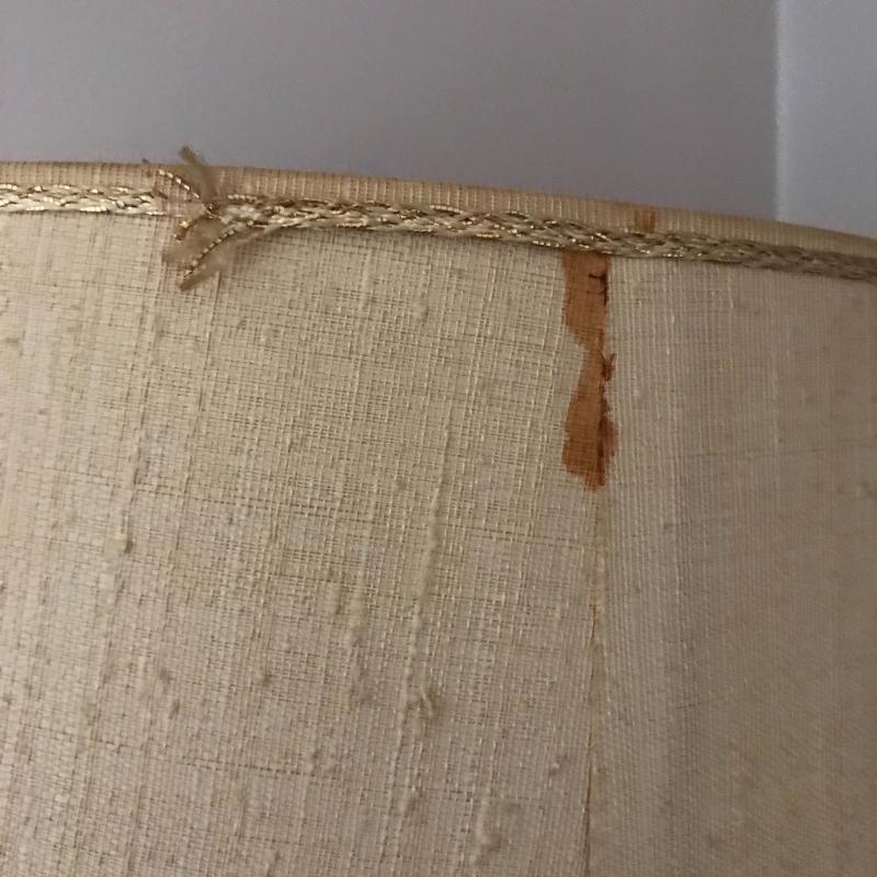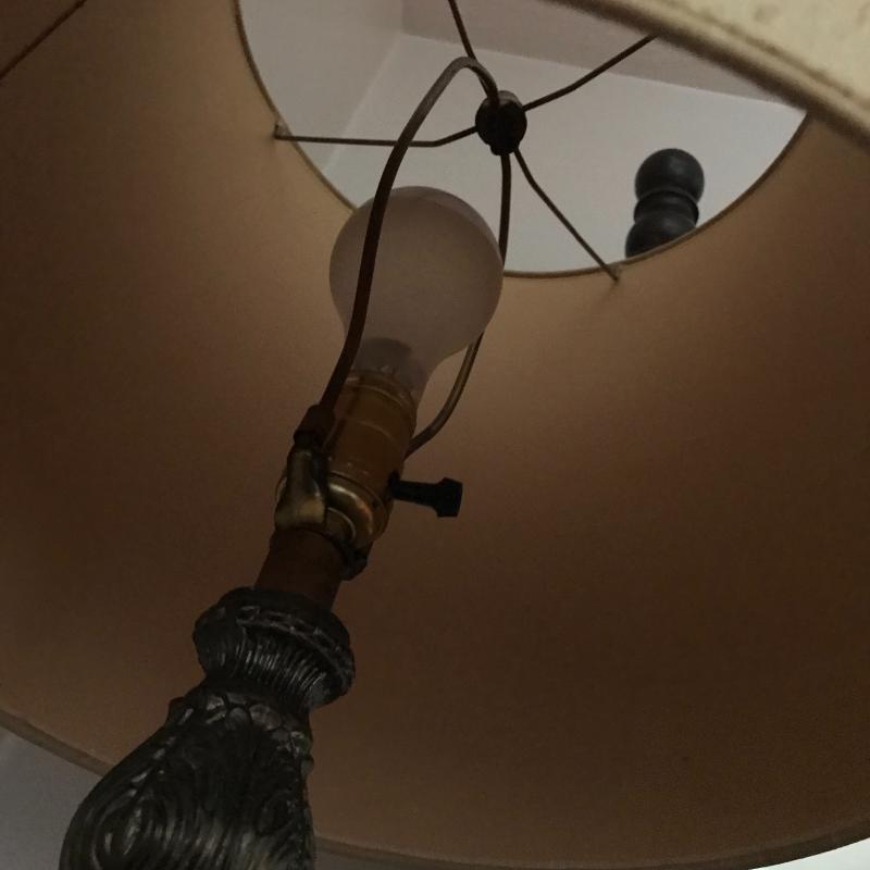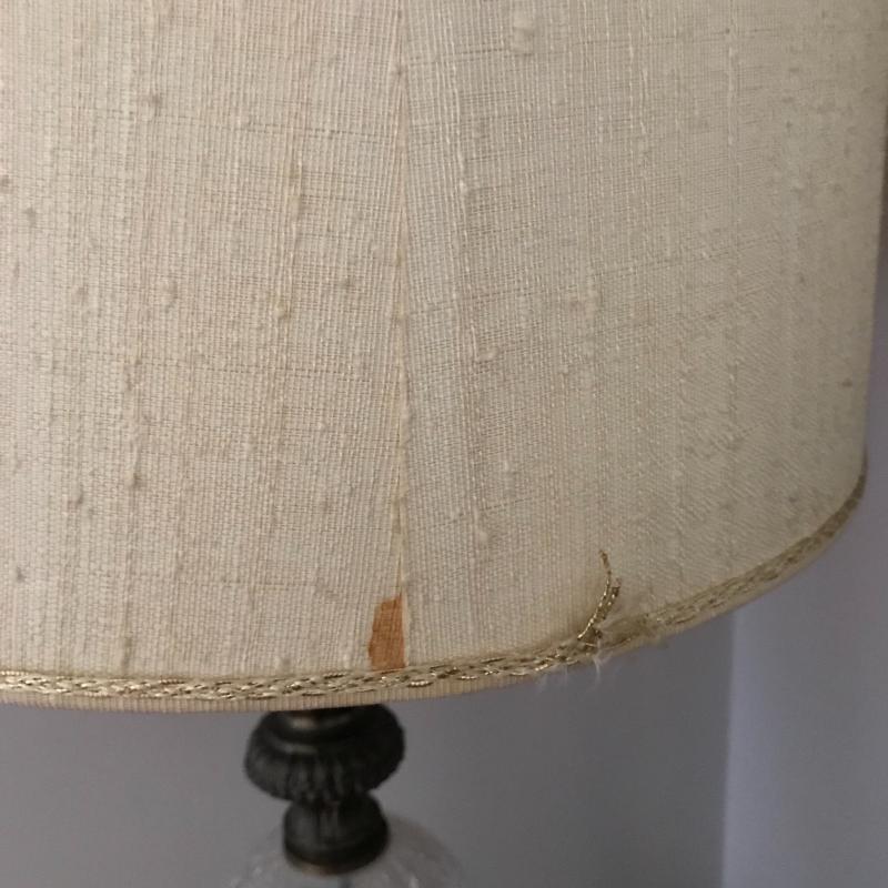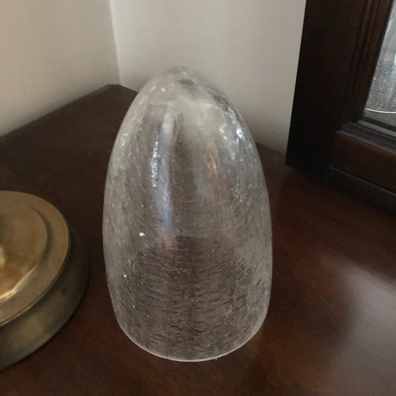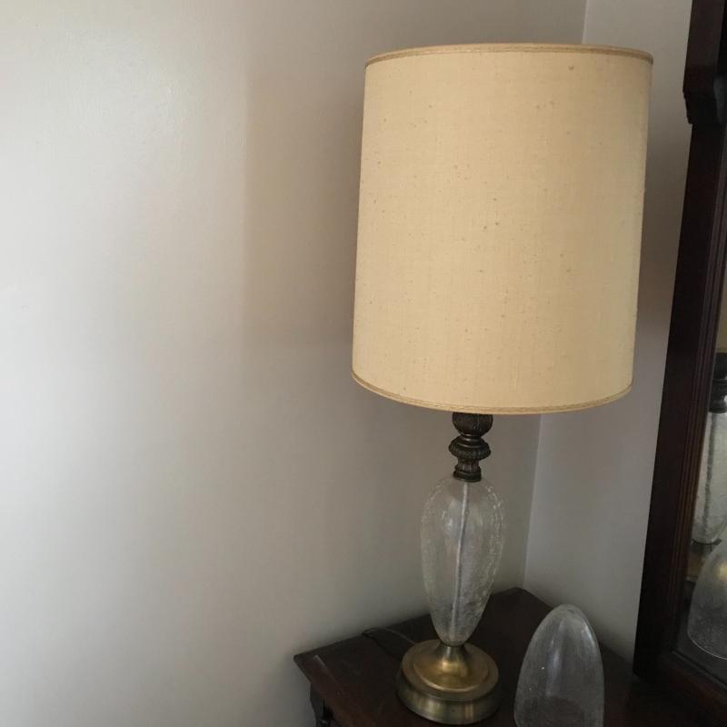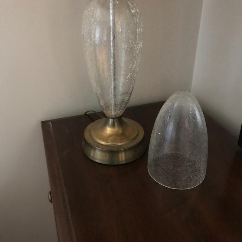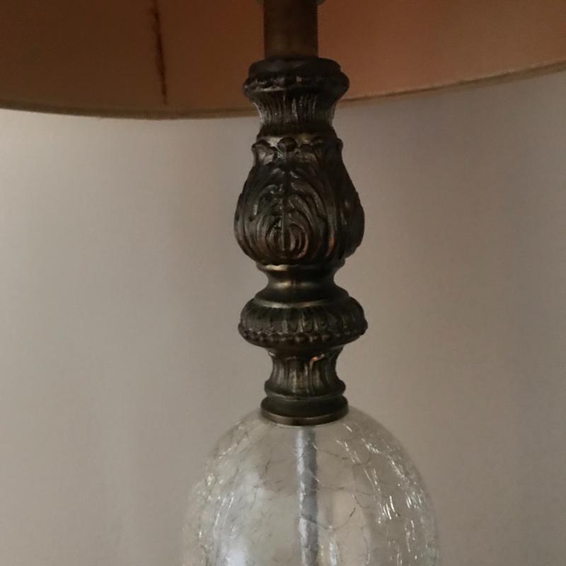 Tall lamp with crackle glass on base, approx. 35” tall with shade. Small glue stains on back of shade, otherwise in good condition. Lot also includes decorative crackle glass piece. See pics. No shipping available. Local pickup only in Asheville, NC.