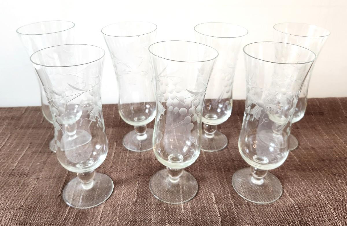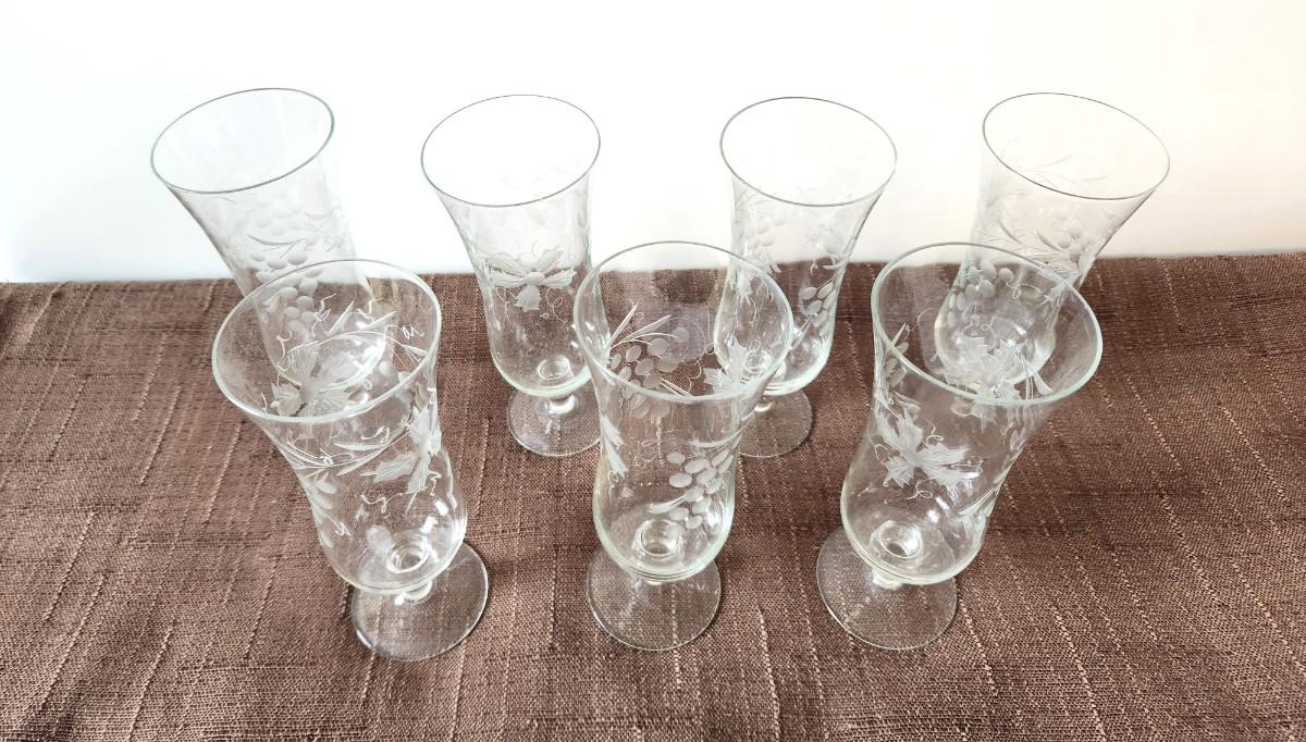 Nice lot of 7 vintage footed glasses - acid etched grape design - ca. 1940's. Each is 7" tall. Good condition.