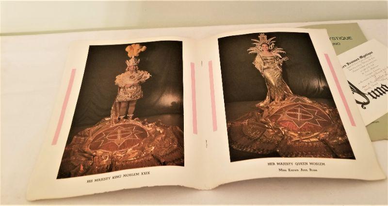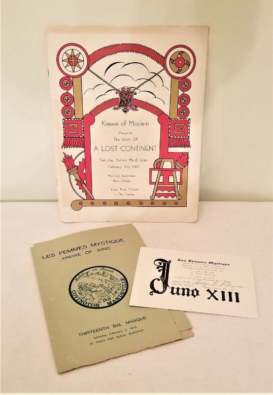 Two defunct krewes - Krewe of Moslem, nice ball program with color photos of King/Queen - 1967 - also Les Femmes Mystique ball program AND original Admit Card - 1979. Both in good condition.