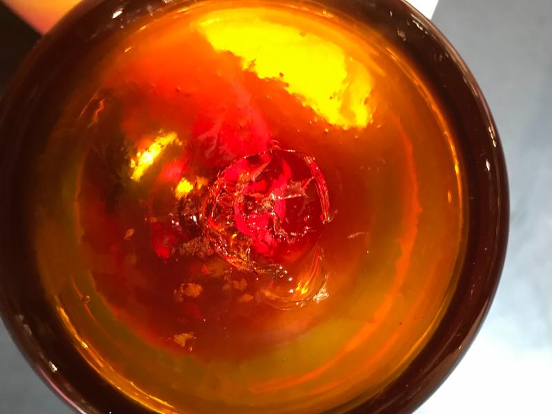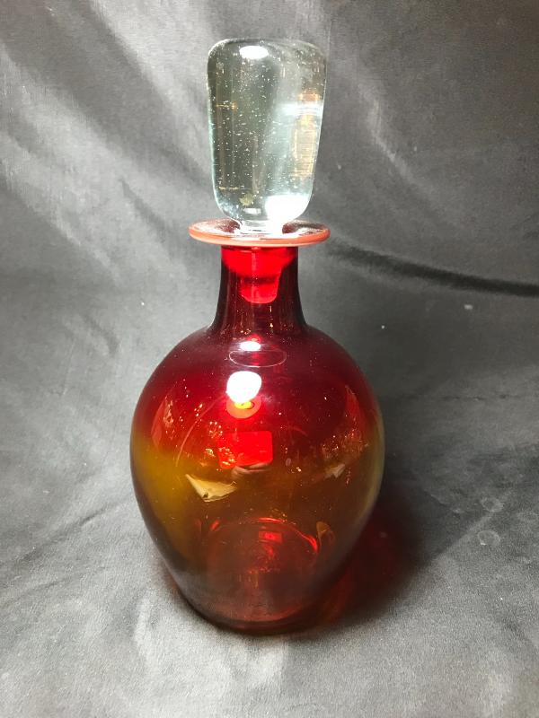 Lovely hand blown amberina decanter with matching clear stopper by Blenko. Great MC style and color. 6" D x 11 1/2" H