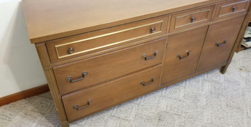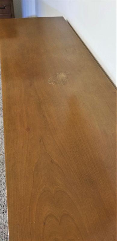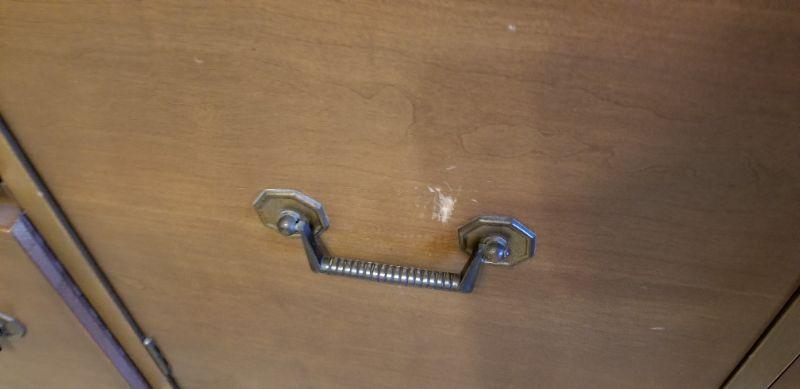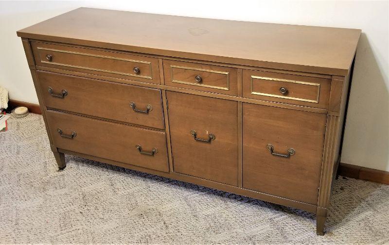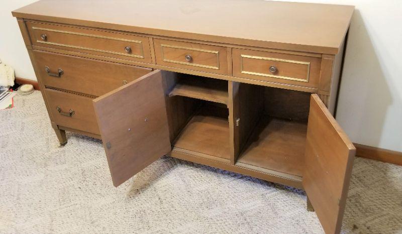 A match to the China Cabinet that was in an earlier lot - Mid Century buffet cabinet. 5 feet long, 19" deep, 32" tall. 5 drawers - all original hardware. One kind of "knarly" place on the top. Lots of storage here. Late 1960's - early 1970's.