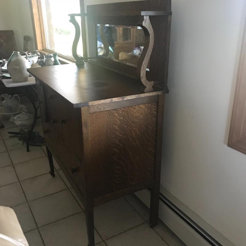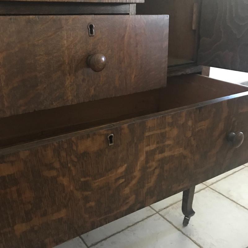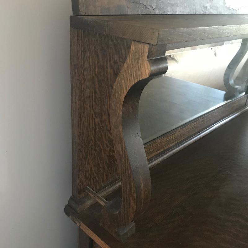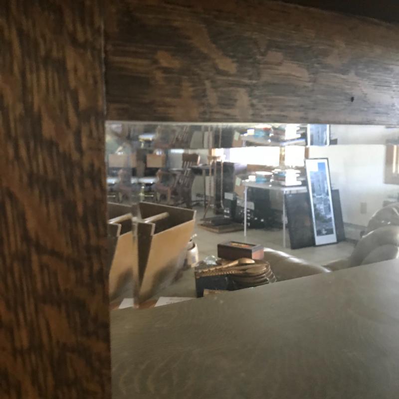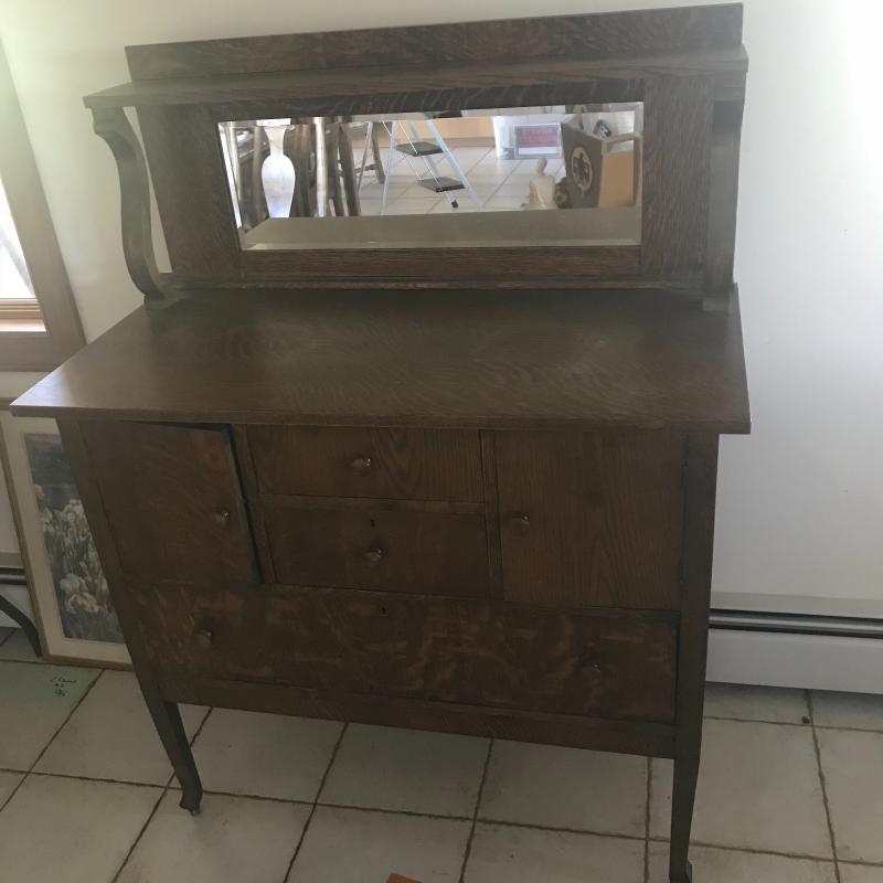 Beautiful piece with three drawers and two cabinets. Beveled mirror and extra top shelf make this unique piece an eye catcher. No markings but all wood with possible veneer in some places and drawer bottoms appear to be replaced. One broken caster, see photos. Measures 42” x 21” x 55.5”. Local pick up only.