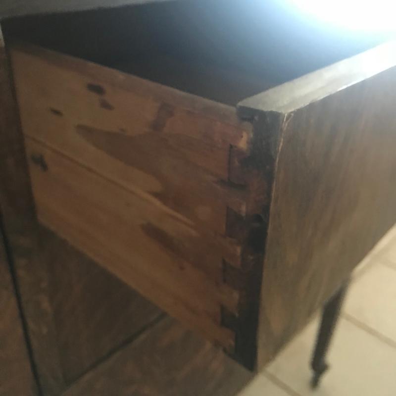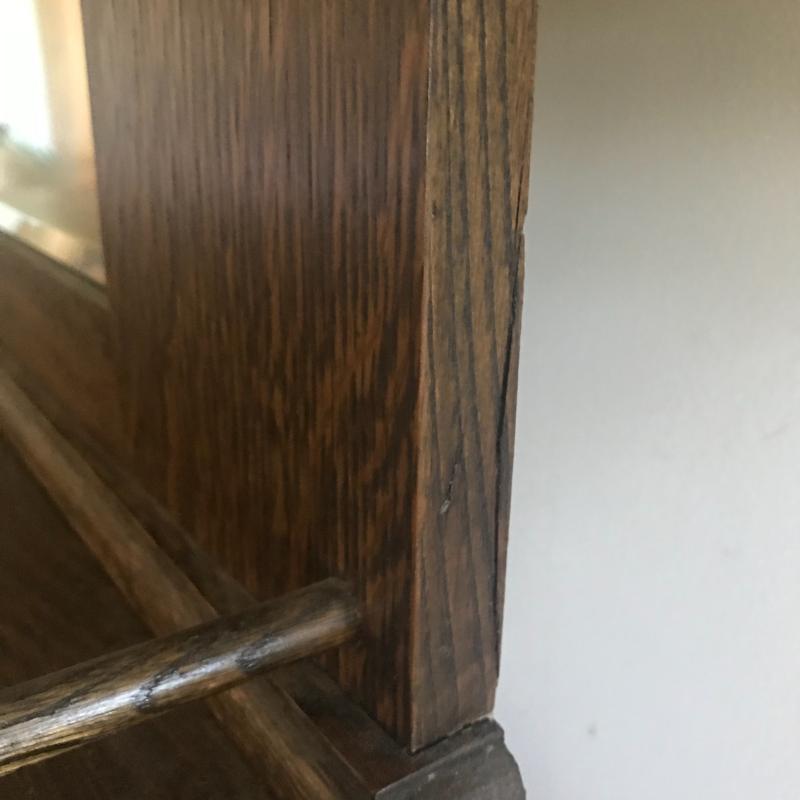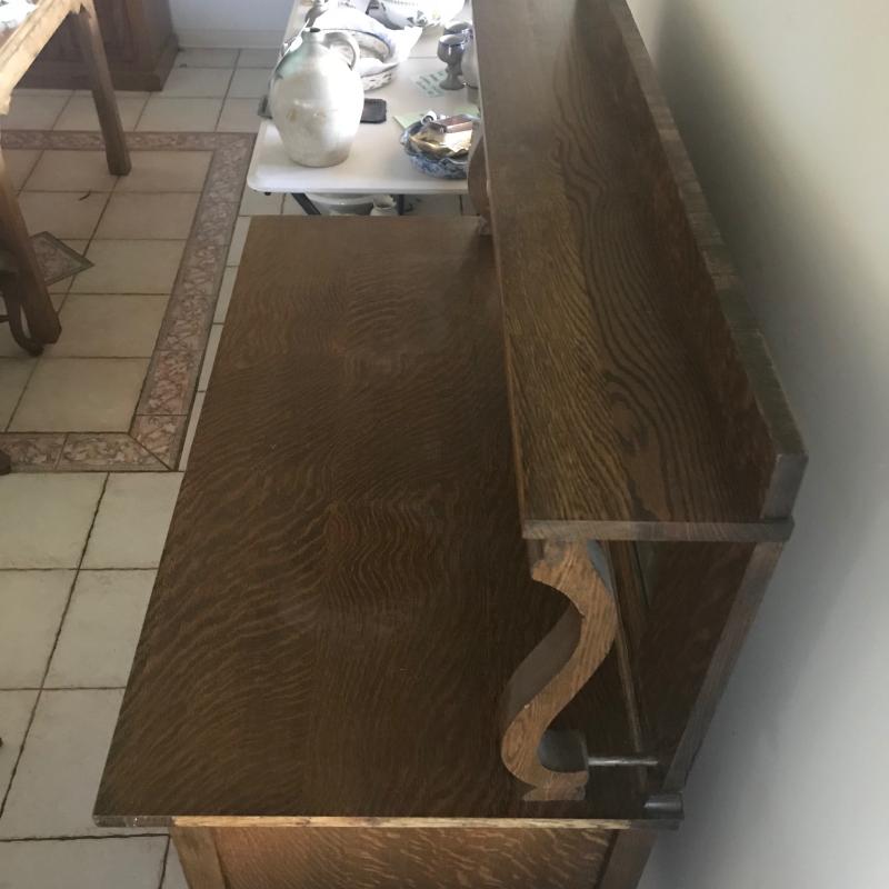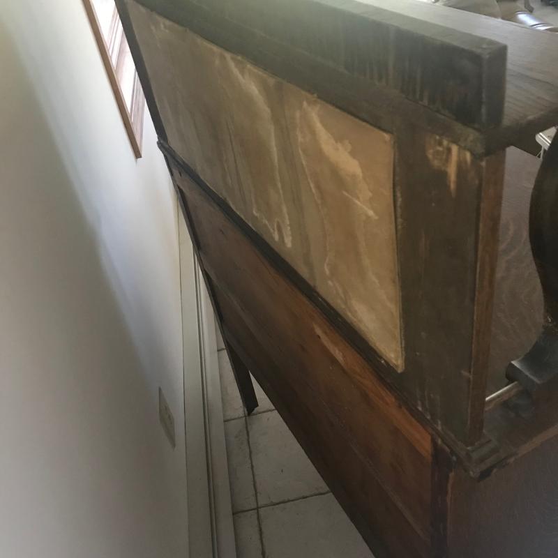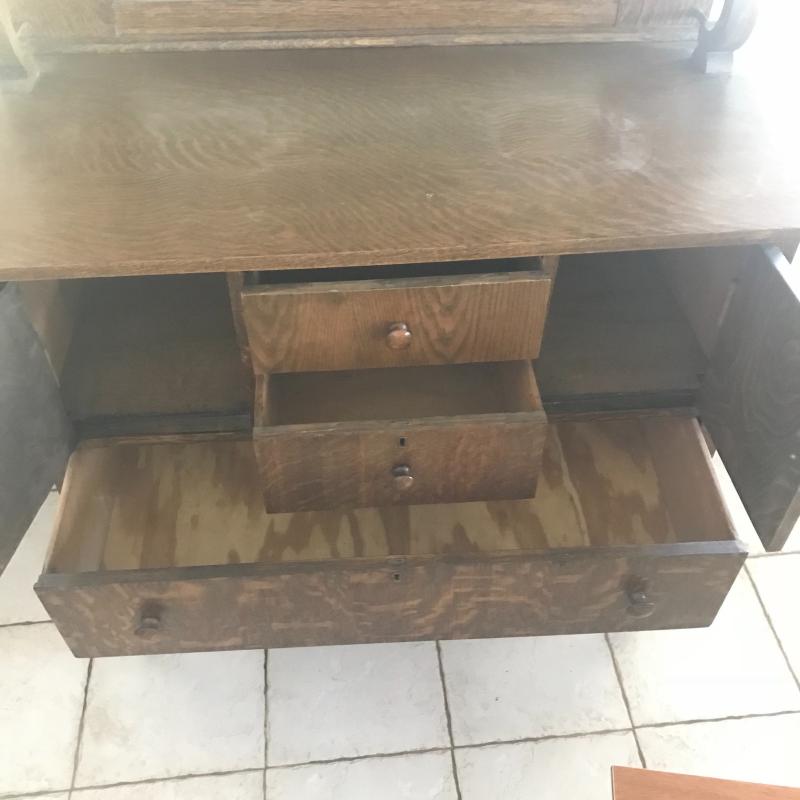 Beautiful piece with three drawers and two cabinets. Beveled mirror and extra top shelf make this unique piece an eye catcher. No markings but all wood with possible veneer in some places and drawer bottoms appear to be replaced. One broken caster, see photos. Measures 42” x 21” x 55.5”. Local pick up only.
