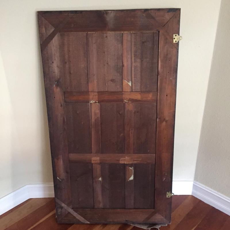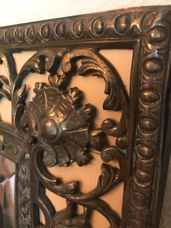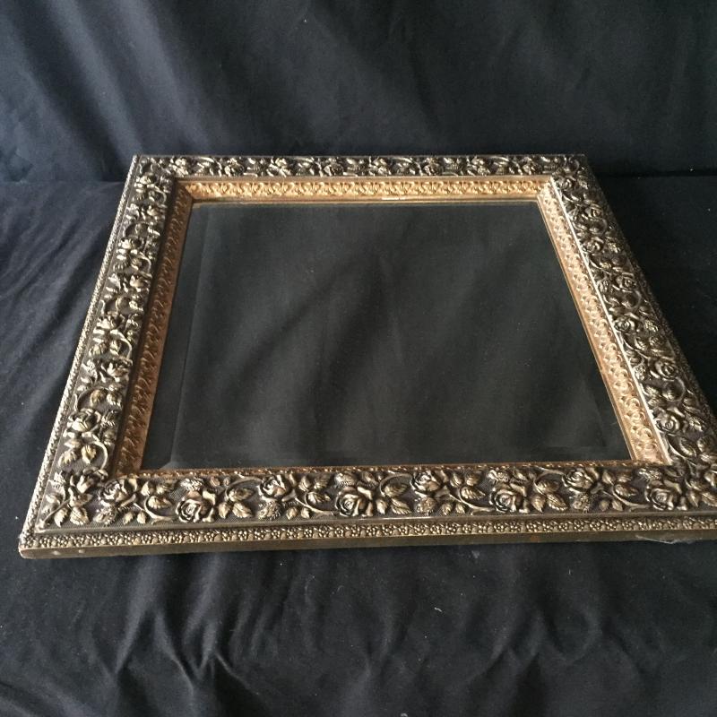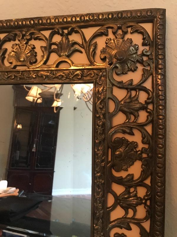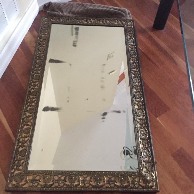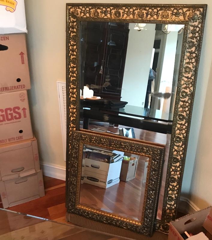 Beautiful Pair of mirrors. Largest mirror has wood backing with lovely brass overlay on a beveled mirror that seems to be leaded. Some damage on mirror-See pictures. Smaller square mirror measures 24” x 24”. Larger mirror measures 31.5” x 54.75” and is very heavy.
