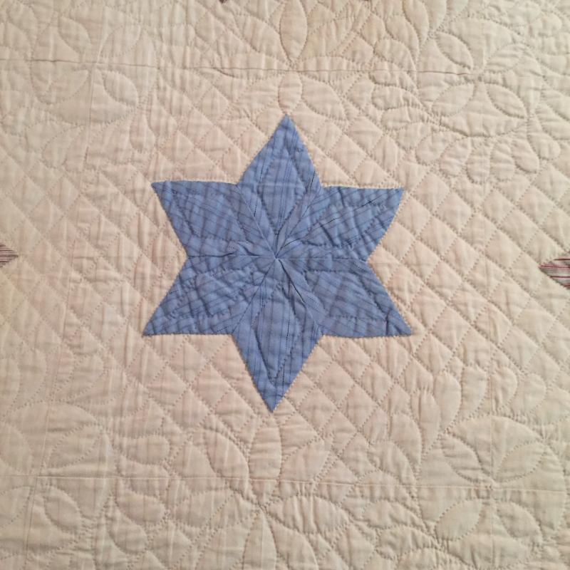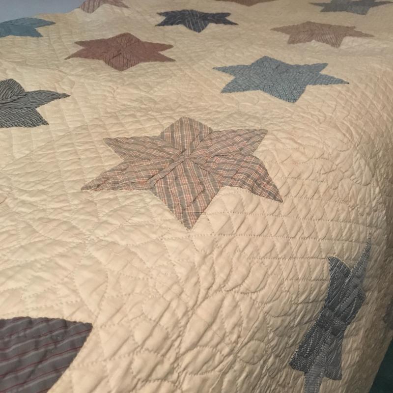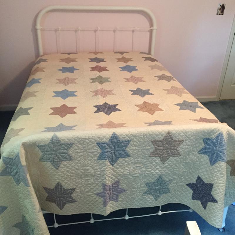 Owner States that it is from the 1930s and was hand sewn by her great grandmother, Miranda MacLeod. It is made from men's shirt material. You can see the pencil marks on it. It has slight discoloration and small stains that could likely come out in was . Bed Pictured not Included but available in Lot 90. Quilt Measures 82”x102”. Shipping Available