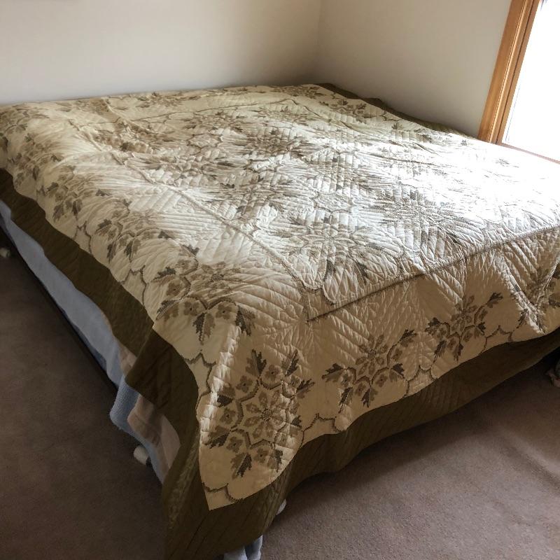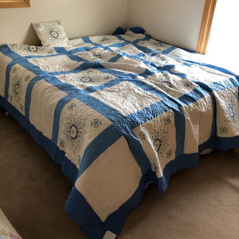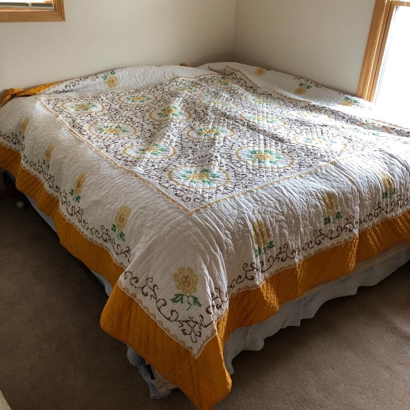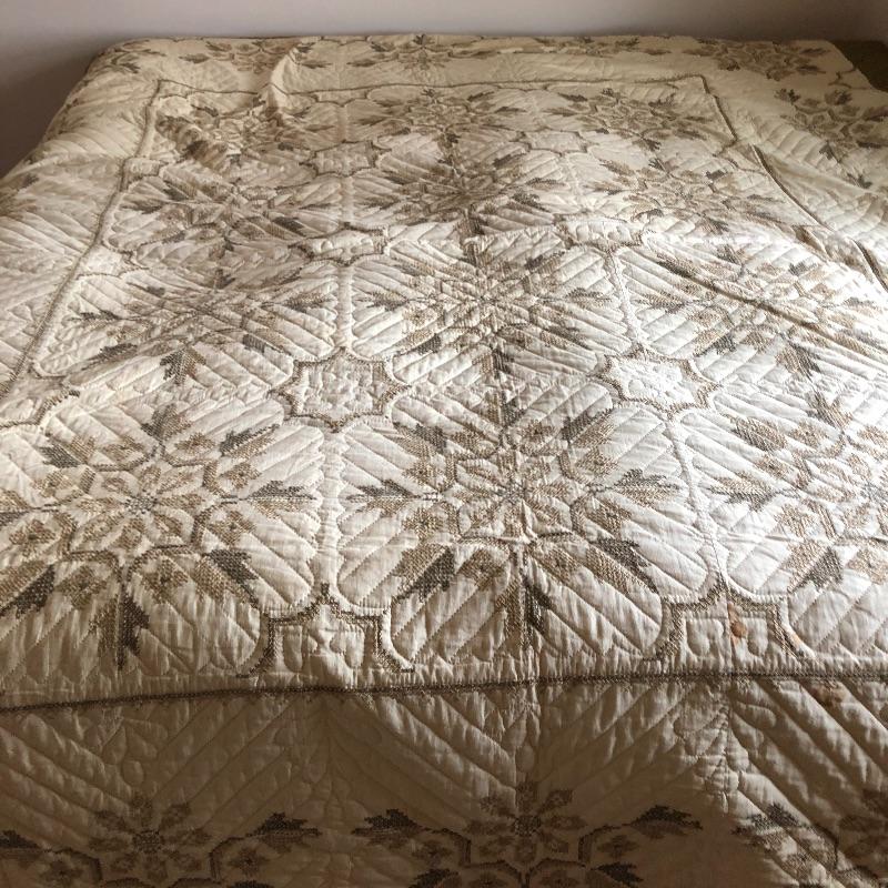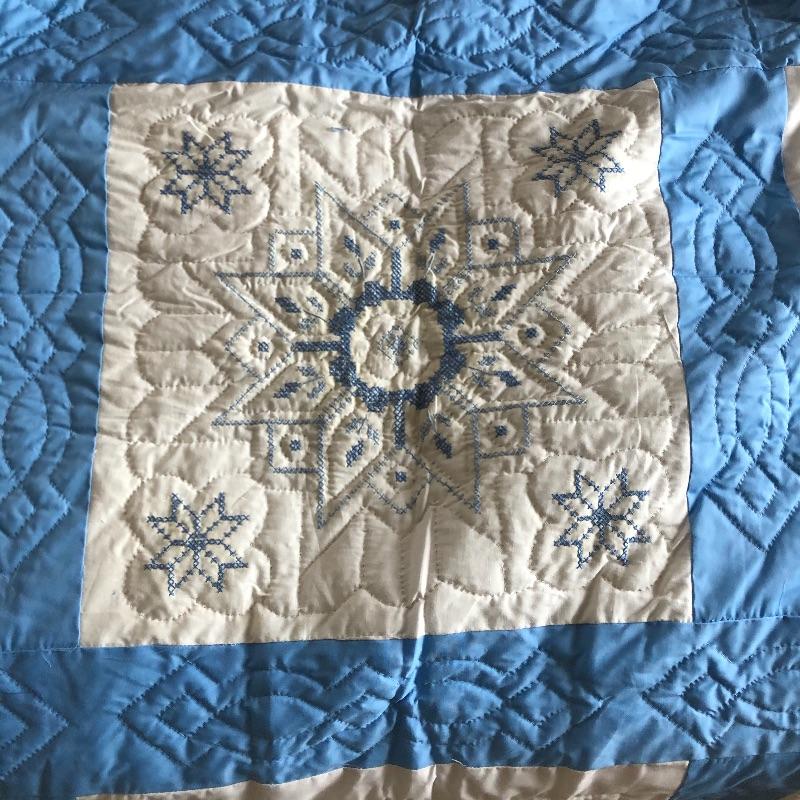 These quilts are so beautiful you might just want to display them. Lot includes five handmade quilts. One quilt has French knots and some of the others have cross stitch on top of the quilting and one has matching pillow, see pictures. Largest quilt measures 110” x 110”.