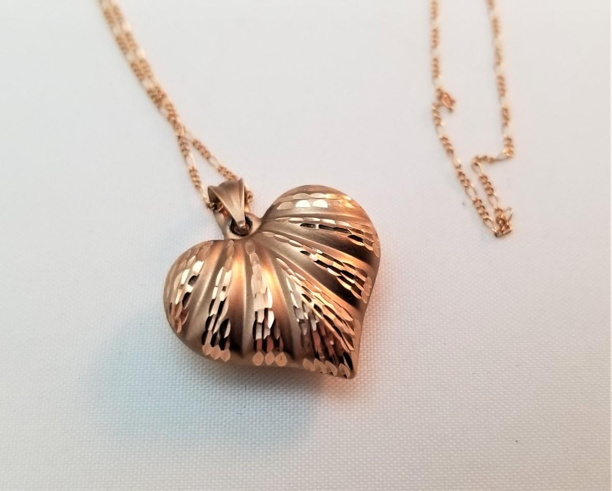 I just love rose gold! 18" 14kt Rose Gold chain with puffy heart pendant. Pendant is 1" tall counting the bail.