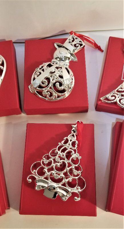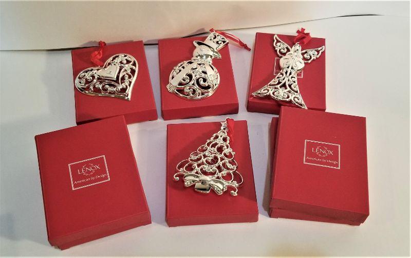 Set of 10 Lenox Silverplate Christmas ornaments - Heart, Bell, Snowman, Santa, Angel, Tree, Reindeer, Snowflake - all new in box. They average 5" tall.