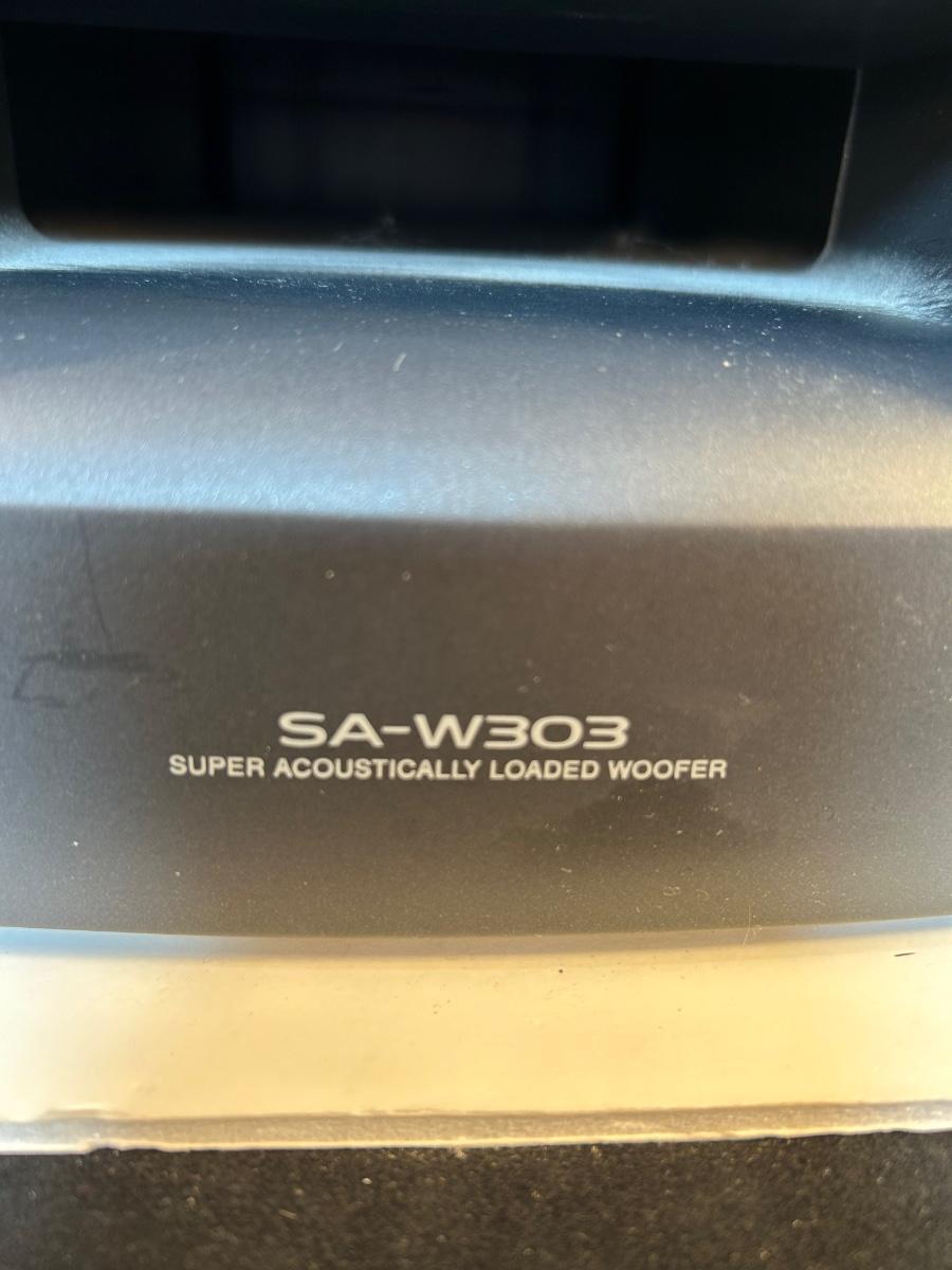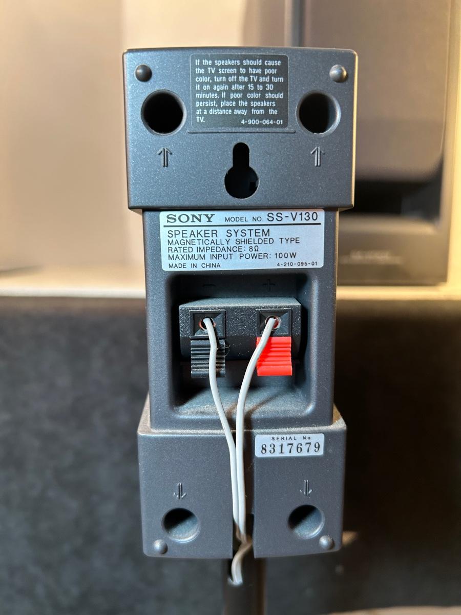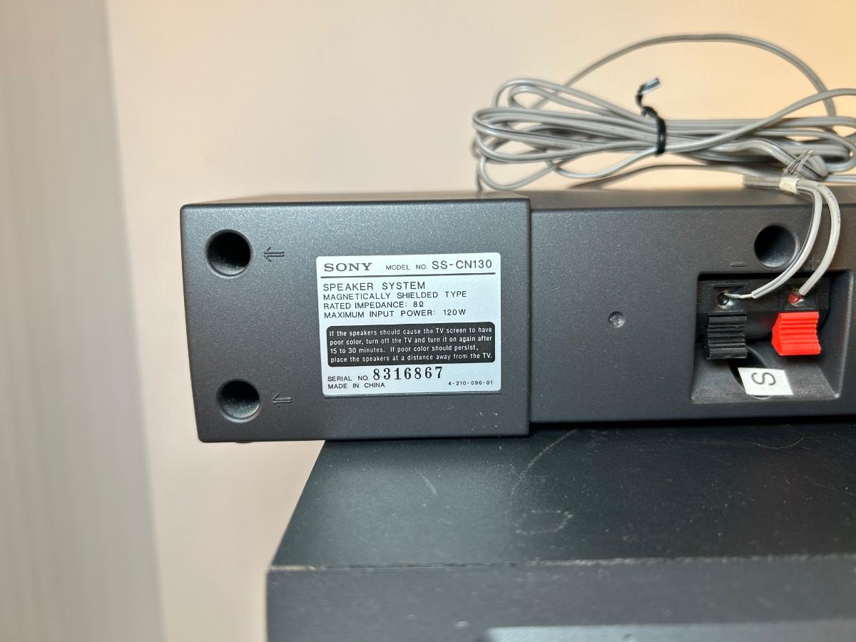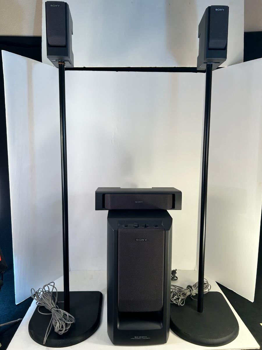 Includes Sony SA-W303 Super Acoustically Loaded Woofer, Sony Speaker System Model No. SS-CN130 & a pair of Sony Speakers Model No. SS-V130 on stands that are 40”H