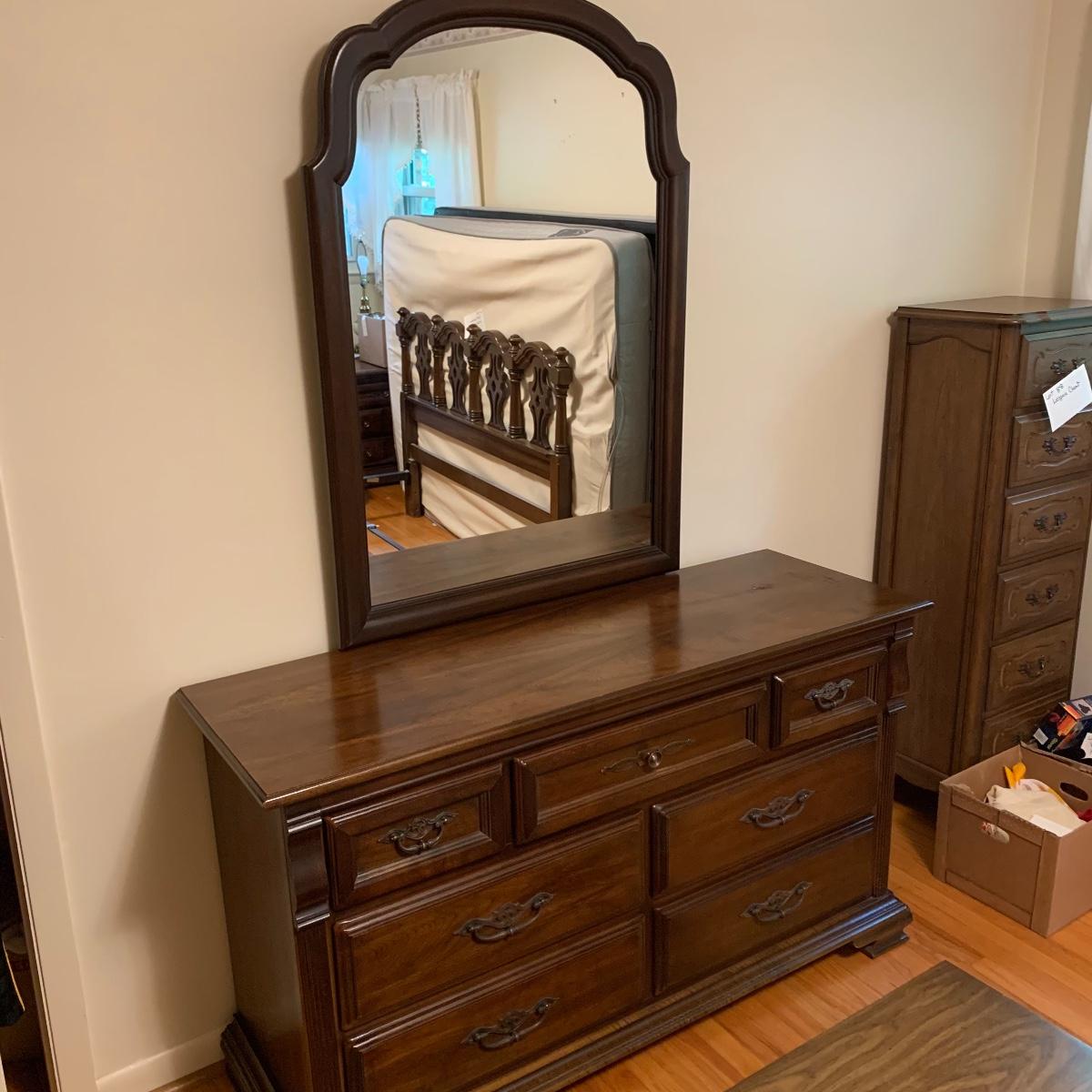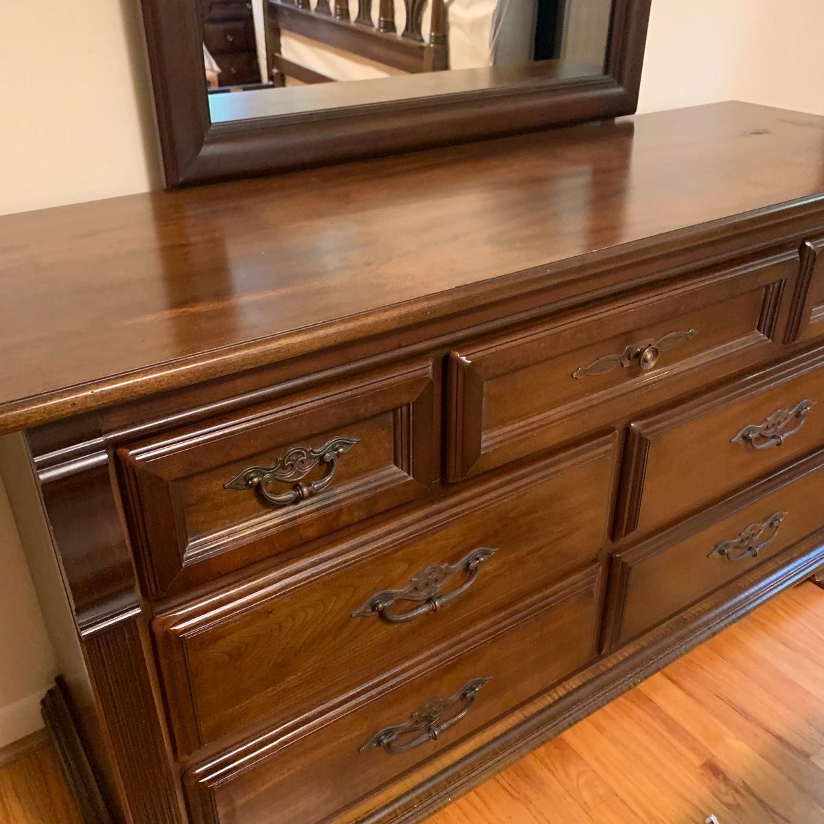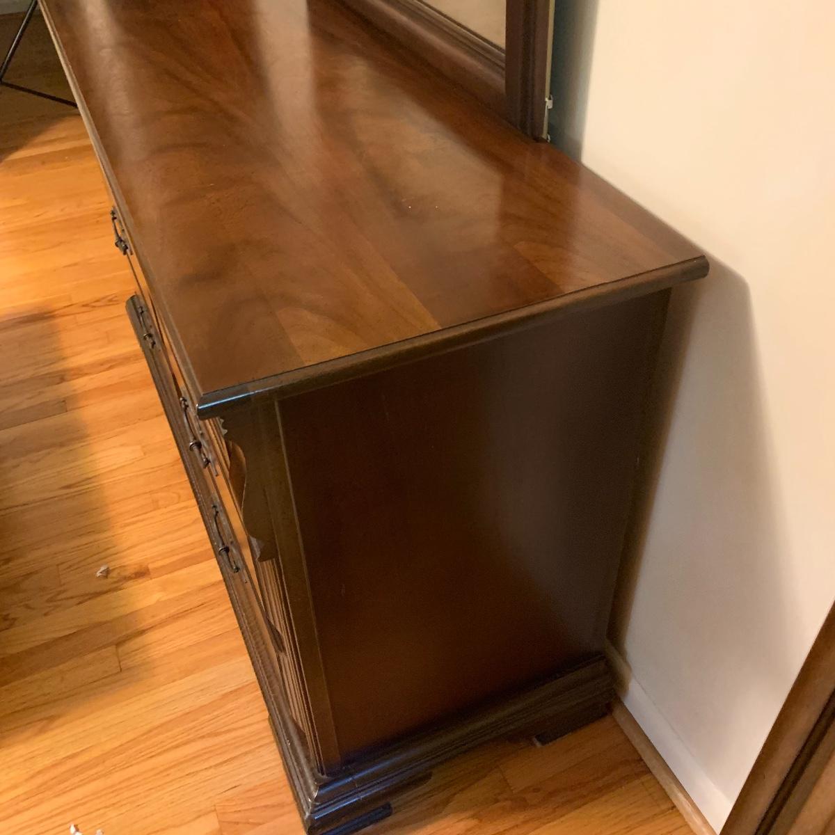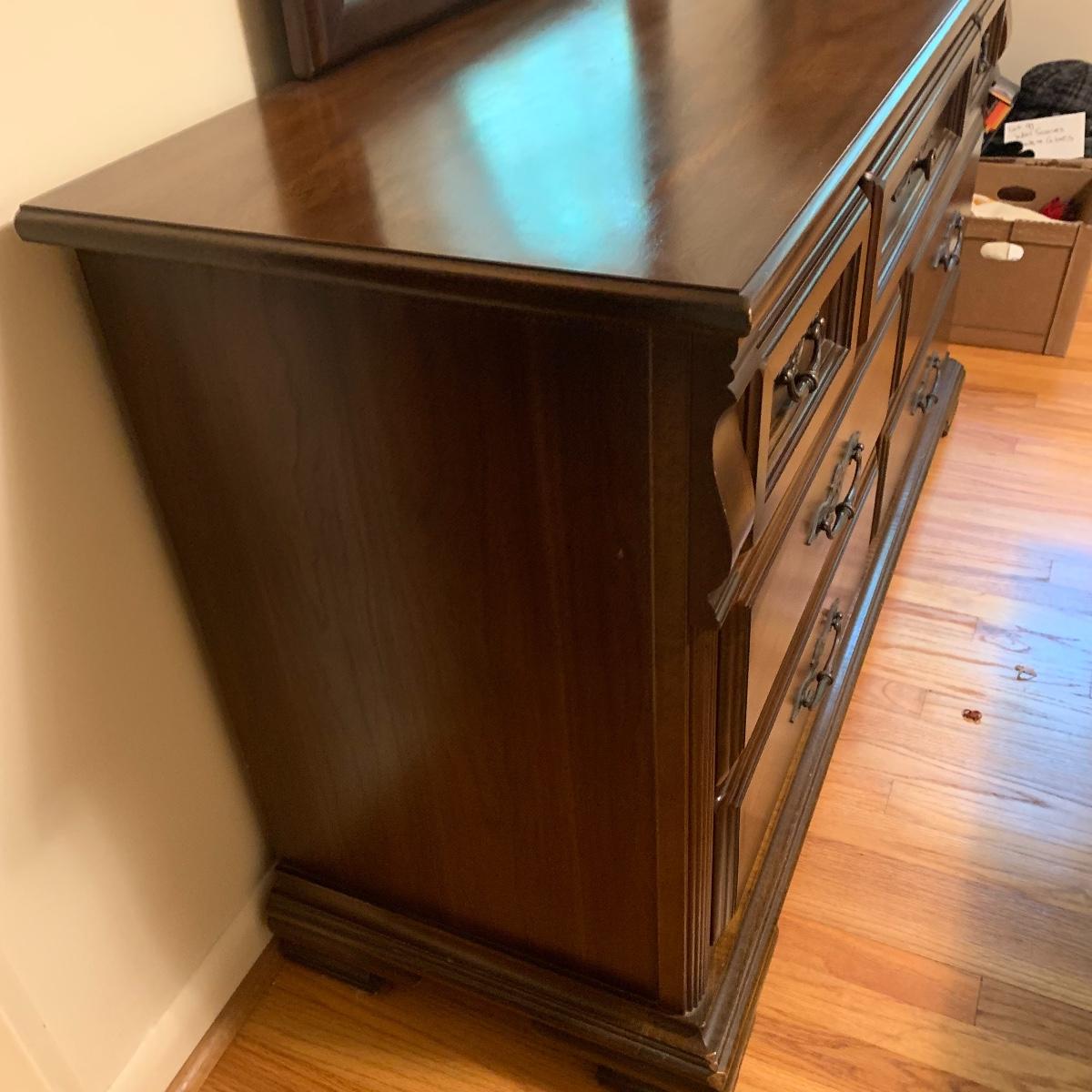 With a total of seven dovetail drawers, this dresser is mostly solid wood with some plywood on the back and drawers. It has a large attached mirror. The dresser itself is 4’8.5” x 1’7” x 2’8.5”. The height including the mirror is approximately 6’ 8”. The mirror is screwed in on the backside and is removable.