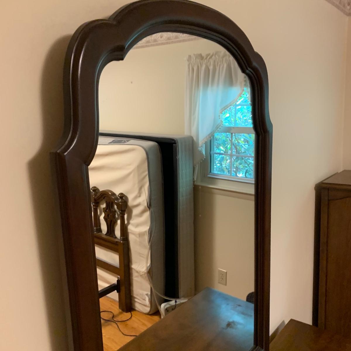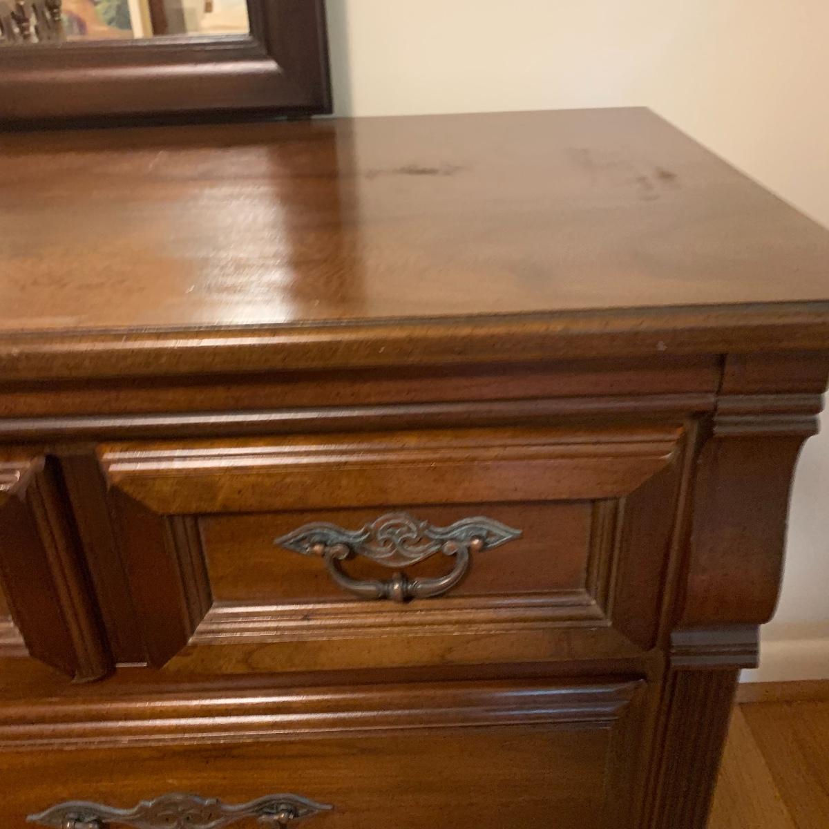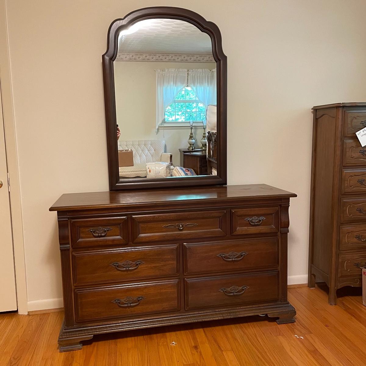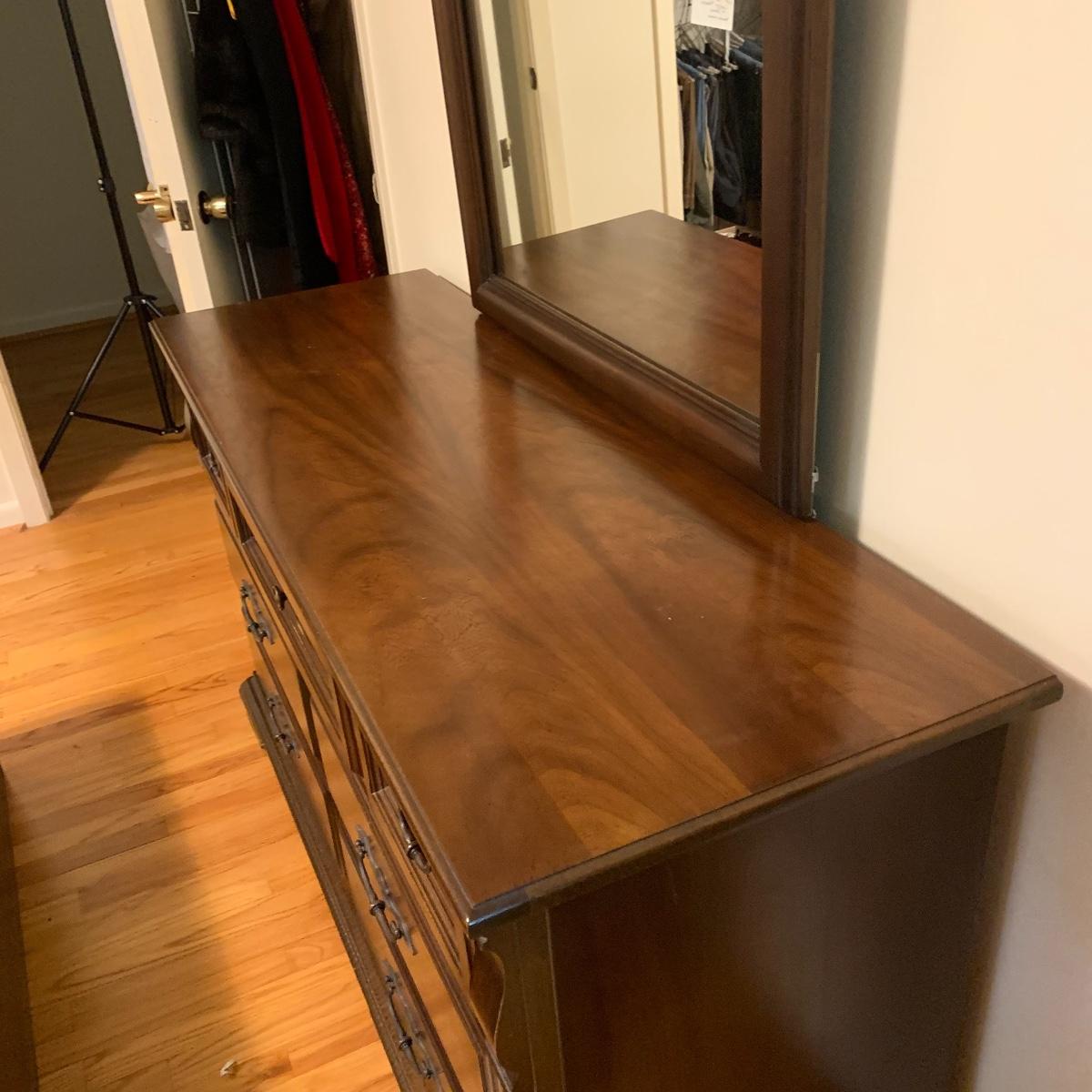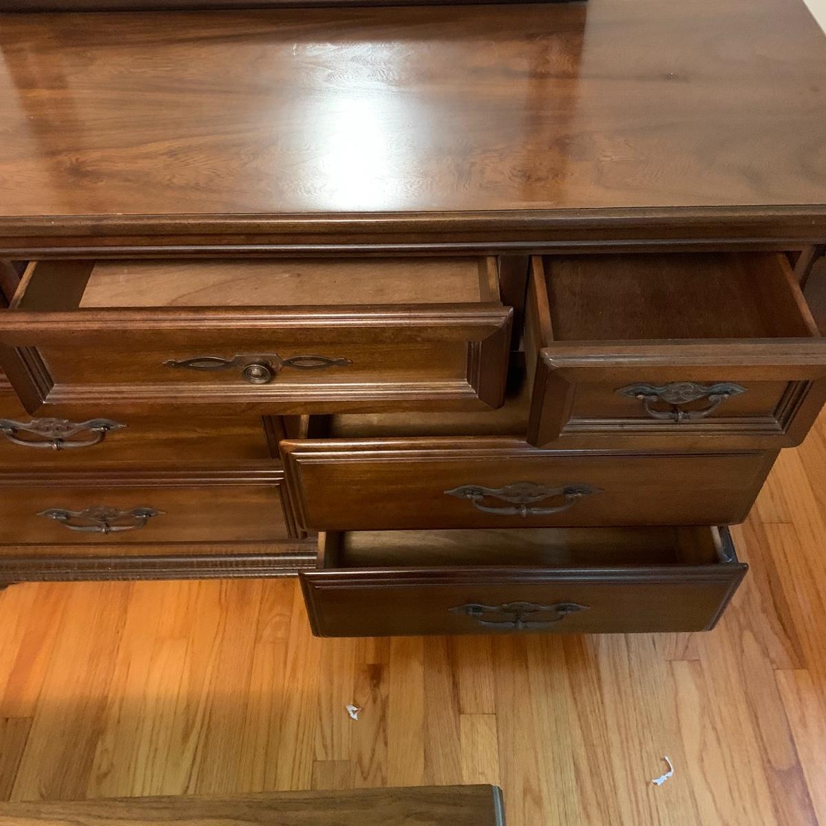 With a total of seven dovetail drawers, this dresser is mostly solid wood with some plywood on the back and drawers. It has a large attached mirror. The dresser itself is 4’8.5” x 1’7” x 2’8.5”. The height including the mirror is approximately 6’ 8”. The mirror is screwed in on the backside and is removable.